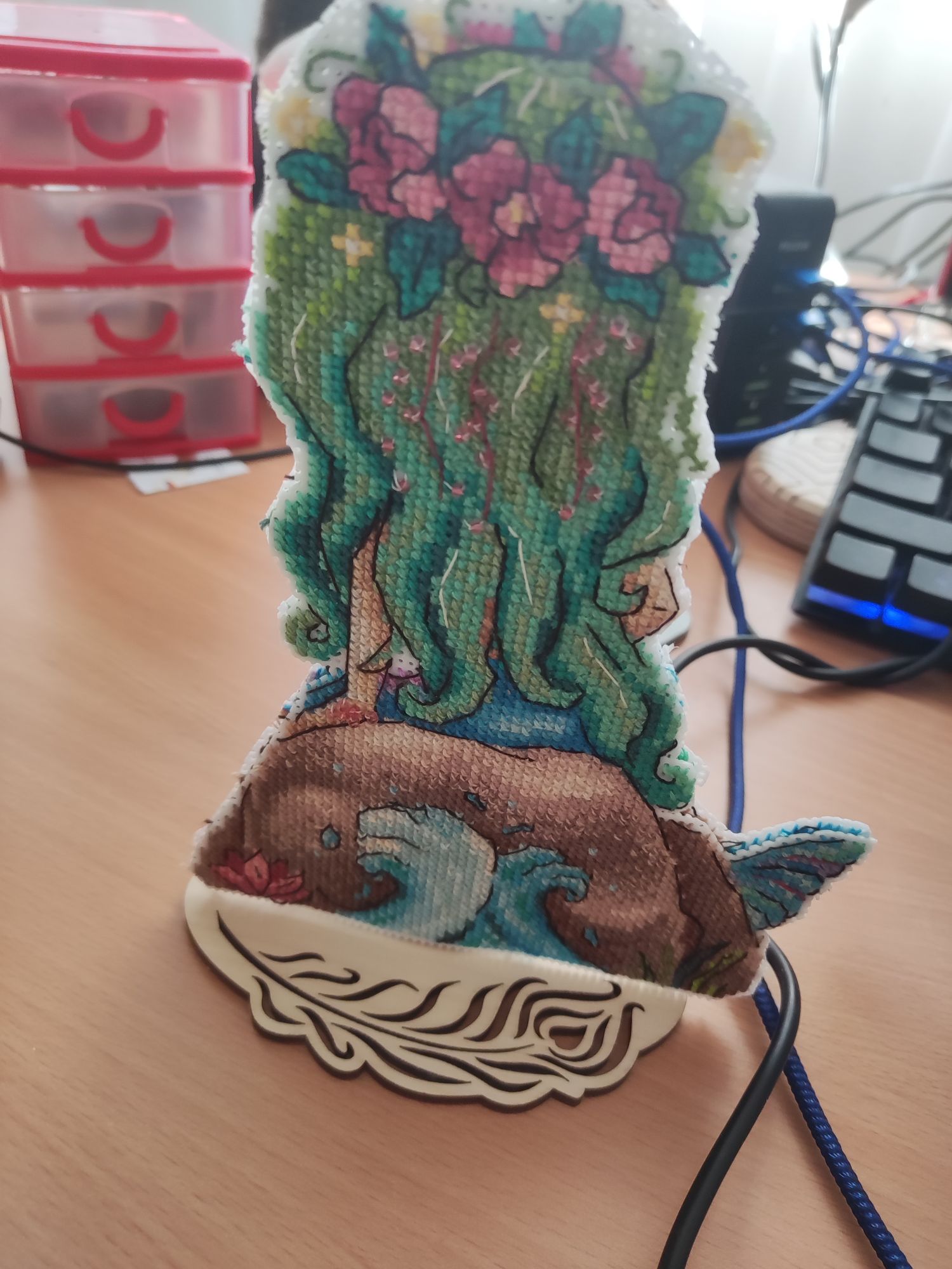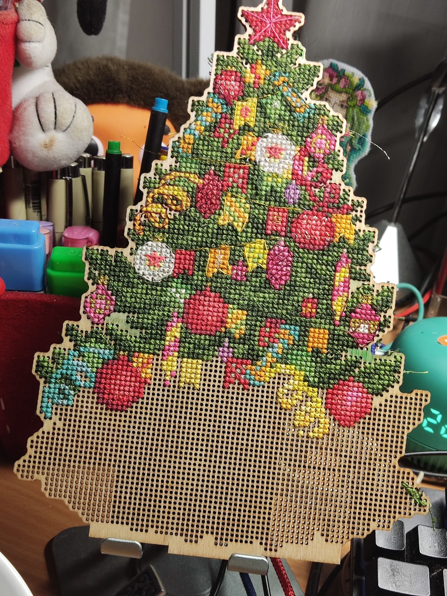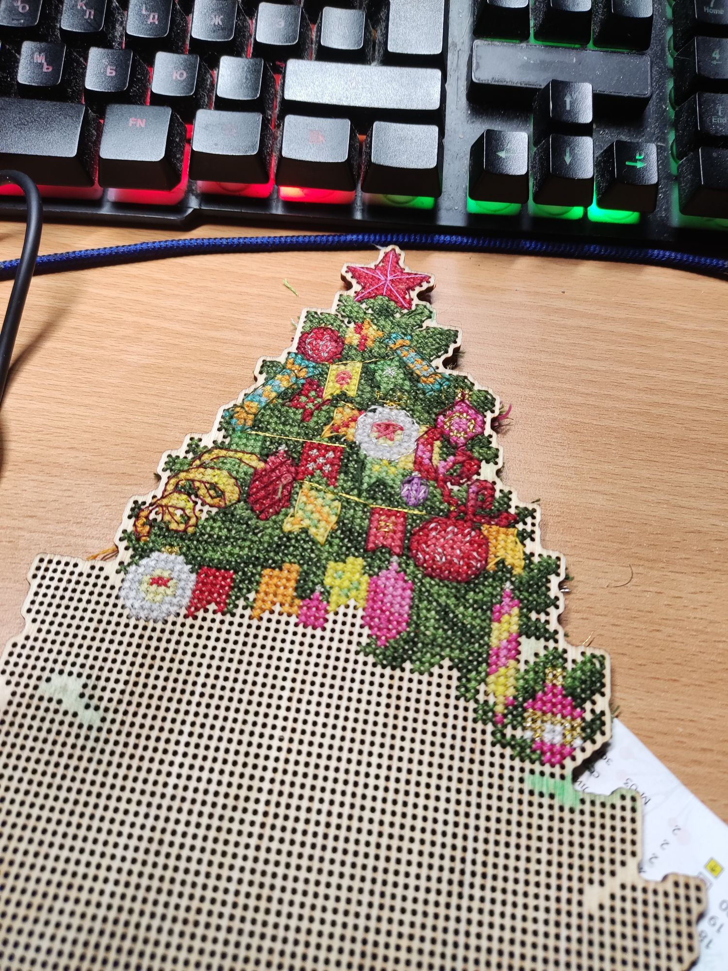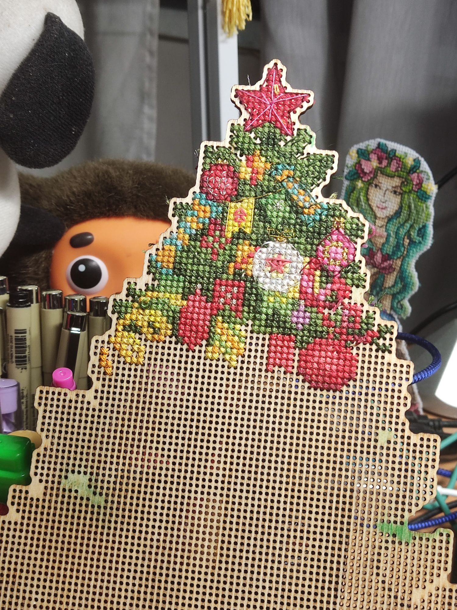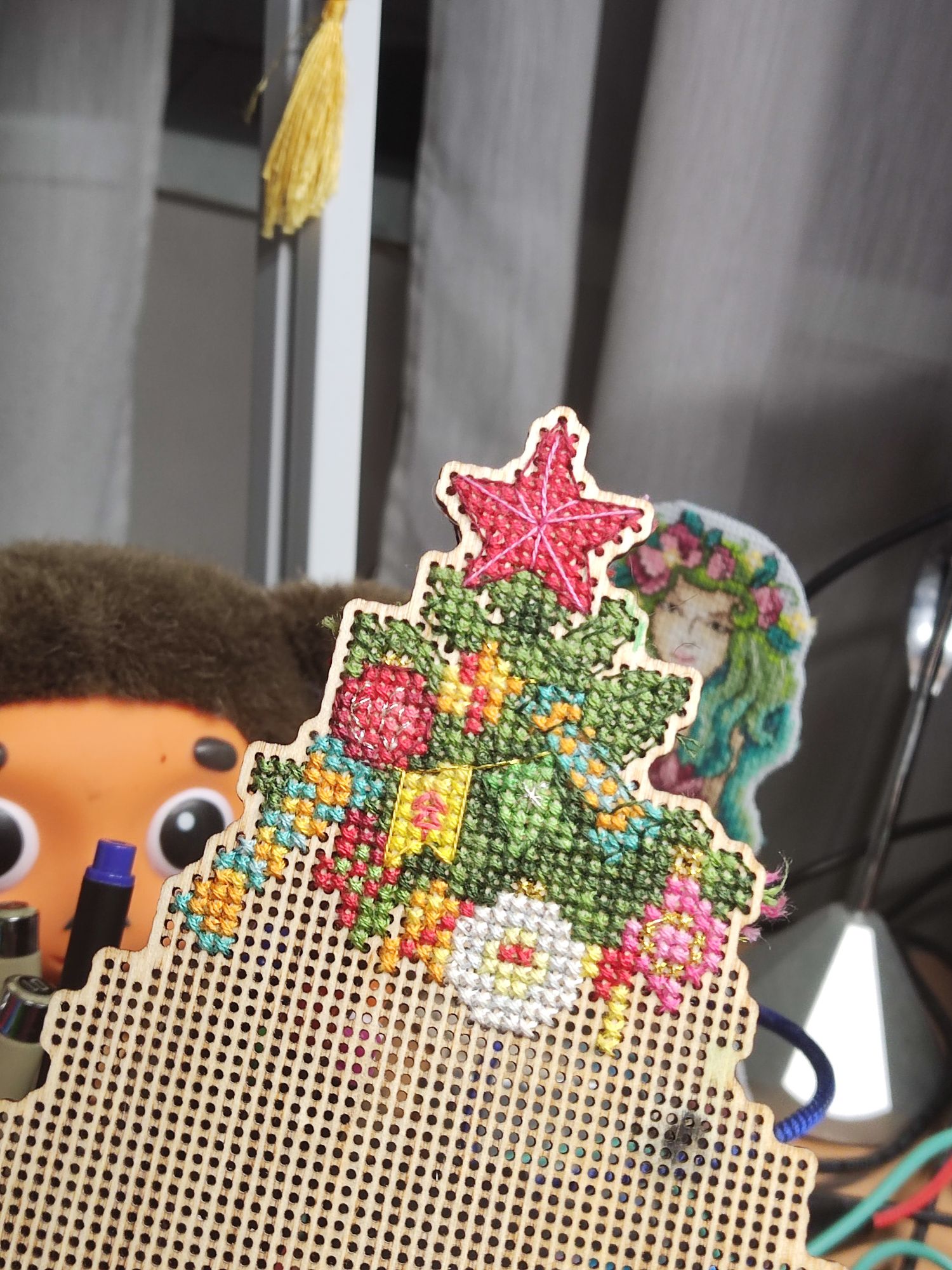 8 апреля 2024 Несу ещё один финиш. Ёлка готова! Замечание по процессу: 1) Определить лицевую сторону заготовки или будет ошибка! 2);Осторожно, заготовка может быть треснутая. Я не стала никому писать и «стянула» всё нитками. Но внимательнее. 3) Мне не хватило темно-зеленого цвета. Даже не пассы, а больше. Хорошо, что в ключе указаны номера Гаммы. 4) Пришивать навесные игрушки не стала, вживую не понравилось. А вприкреп шить не мое, так что золотая гирлянда из набора тоже мимо, но и так отлично выглядит. Игрушки частично ушли на украшение подставки Bogdan сказал(а) спасибо Поделиться сообщением Ссылка на сообщение