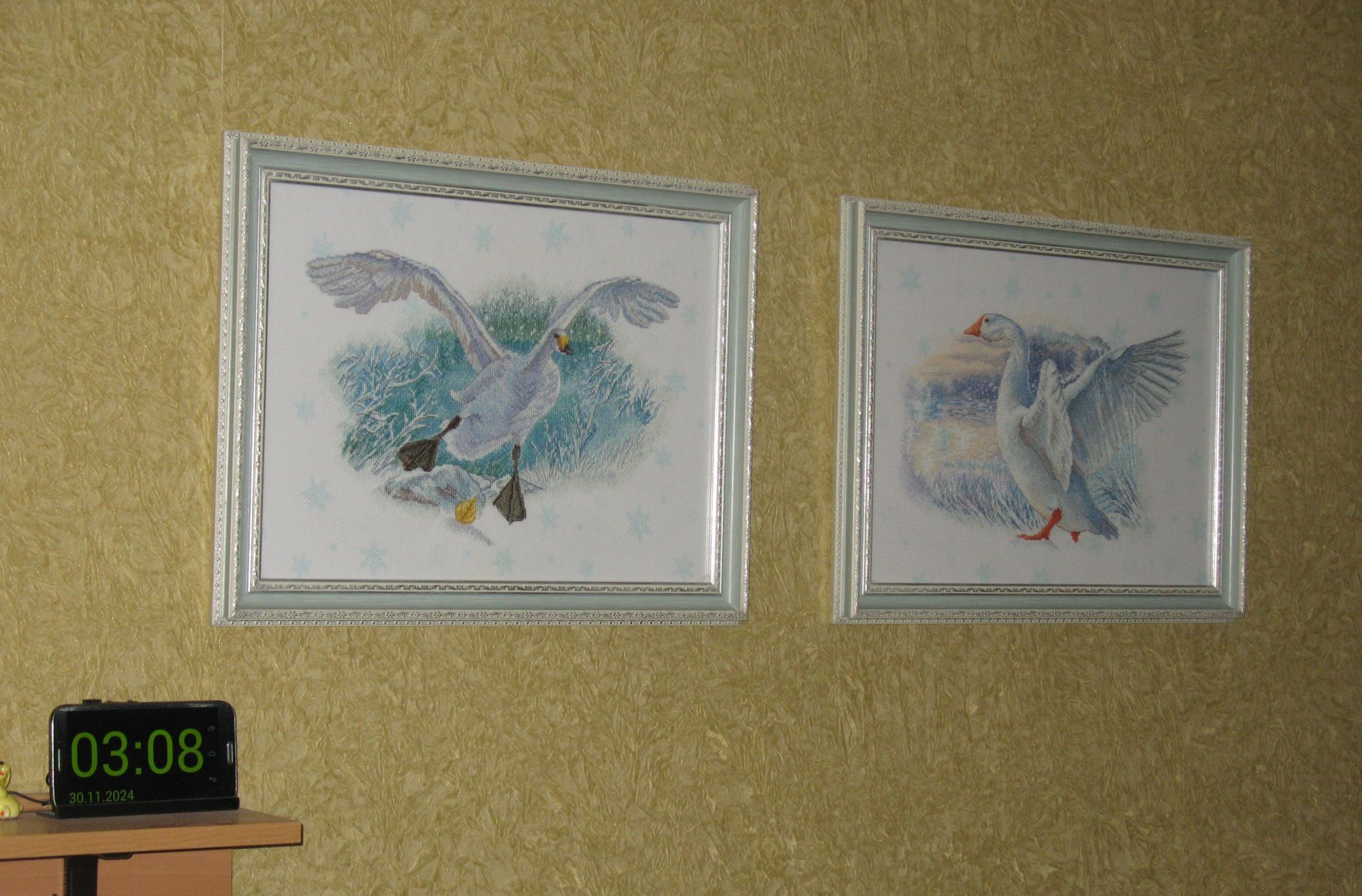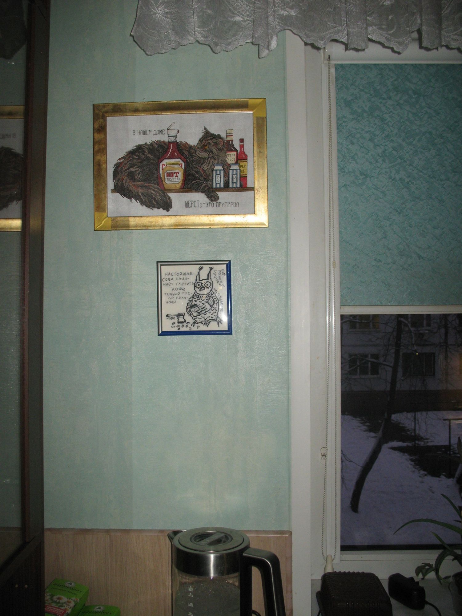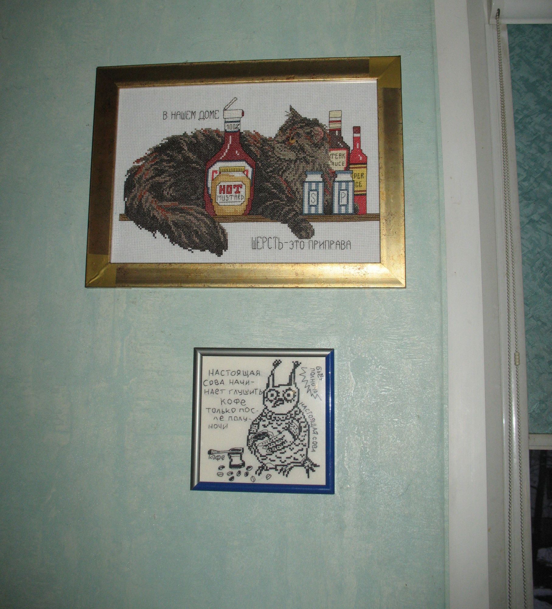 10 декабря 2024 Кое-что из свеженького повесили. Фото делала в почти полной утренней темноте, мои мужчины спали, поэтому обои смотрятся ядовито . В информации по фото видно время съемки, 5.02. А эти сто лет дежали без рамок, нашлось кое-что в залежах у мужа, и подошло по размеру. Пусть хоть так будет. Это кухня, и Сова над чайником гармонично смотрится. А кошку, когда вышивала еще, расцветила еле заметно как бы рыжими мазочками, стало очень похоже на Маську нашу. Аринесса , АлёNка, svetlana62 и 14 других сказали спасибо Поделиться сообщением Ссылка на сообщение