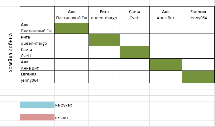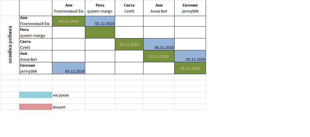 27 ноября 2018 Привет. Подведем промежуточные итоги. Если никто к нам не присоединится, то последовательность такая: Аня-Рита-Света-Аня Вит-Женя-Аня. Начинаем с 1 декабря. На сл. неделе желательно передать друг другу робины. Срок вышивки 3 недели. Попробовала сделать табличку: jenny064 и Анна Вит сказали спасибо Поделиться сообщением Ссылка на сообщение