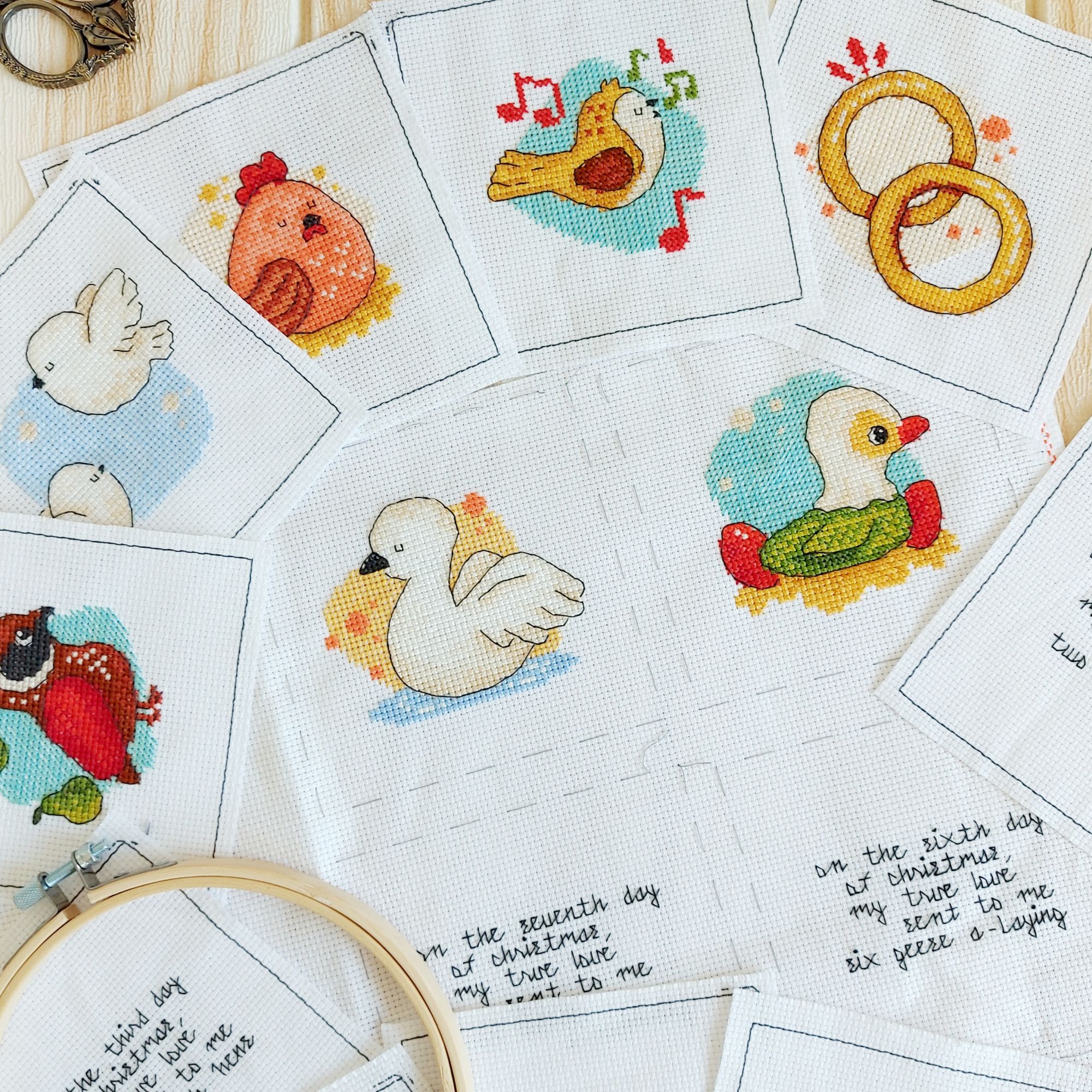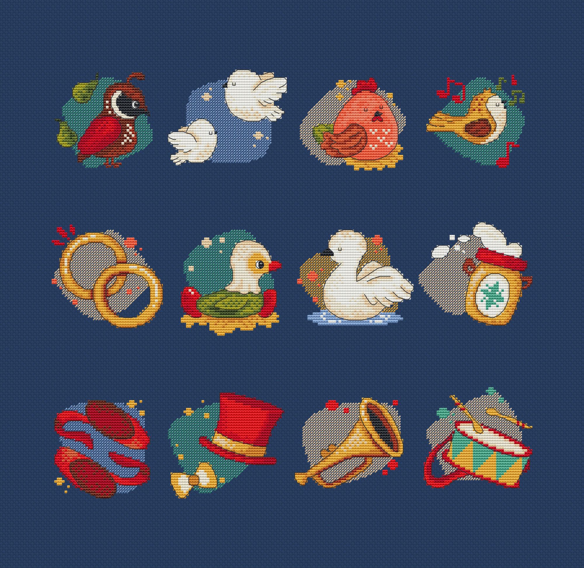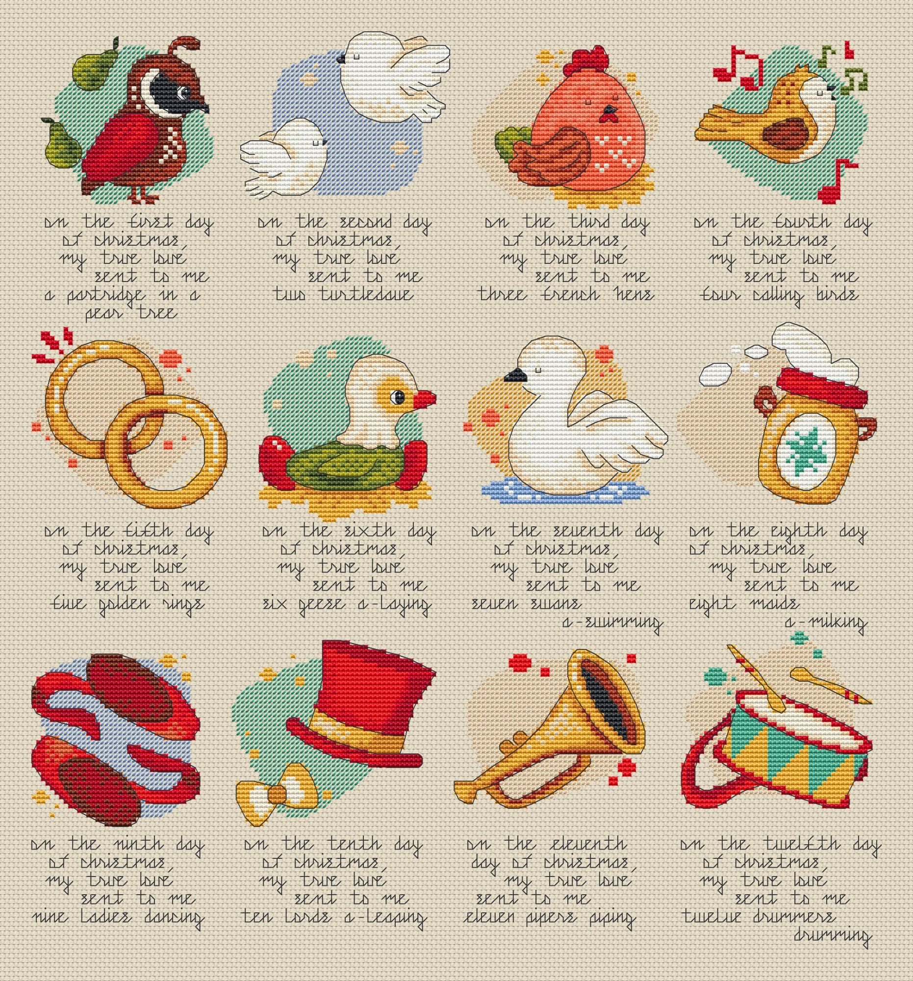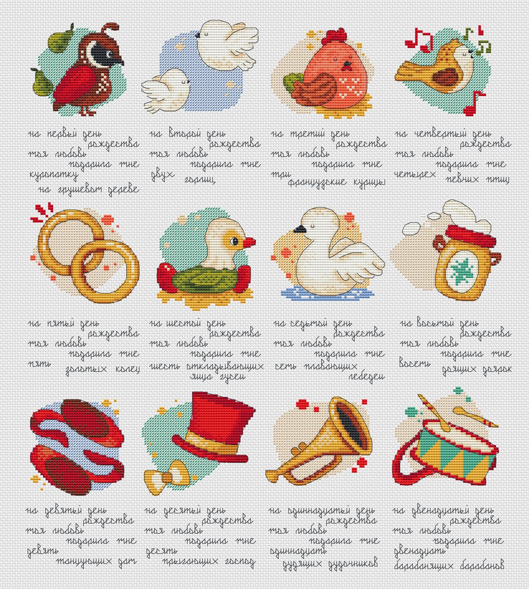 6 декабря 2022 Схема для вышивки крестом 12 Days of Christmas (12 Дней Рождества) Размер 187 х 202. 19 чистых цветов ДМС (или их аналоги СХС, Рояль) Дополнительно в схему включены следующие бонусы: - Схема с русским текстом, 192 х 218 крестиков - Схема без текста, размер 186 х 166 крестиков - Макро схемы каждого мотива по-отдельности с русским и английским текстом - Инструкция Как сделать плоскую елочную игрушку - Инструкция Как сделать книжку (будет выслана после 1 января 2023) 12 Дней Рождества - это английская песенка с французскими корнями. Впервые ее текст был напечатан в 1780 году. Считают, что эта весёлая песенка отразила известную игру того времени, которая заключалась в том, что ведущий рассказывал короткий стишок, а каждый из игроков по очереди должен был повторить его. При переходе к каждому следующему игроку ведущий добавлял в конец стишка ещё одну строчку. Позднее песенка - игра разлетелась по миру и была переведена на десятки языков. Я предлагаю вышить ее на русском (или на английском). Купить схему в группе в ВК https://vk.com/club162064386 или здесь же на сайте monstrochka, Ксен40 и Zanfiska сказали спасибо Поделиться сообщением Ссылка на сообщение