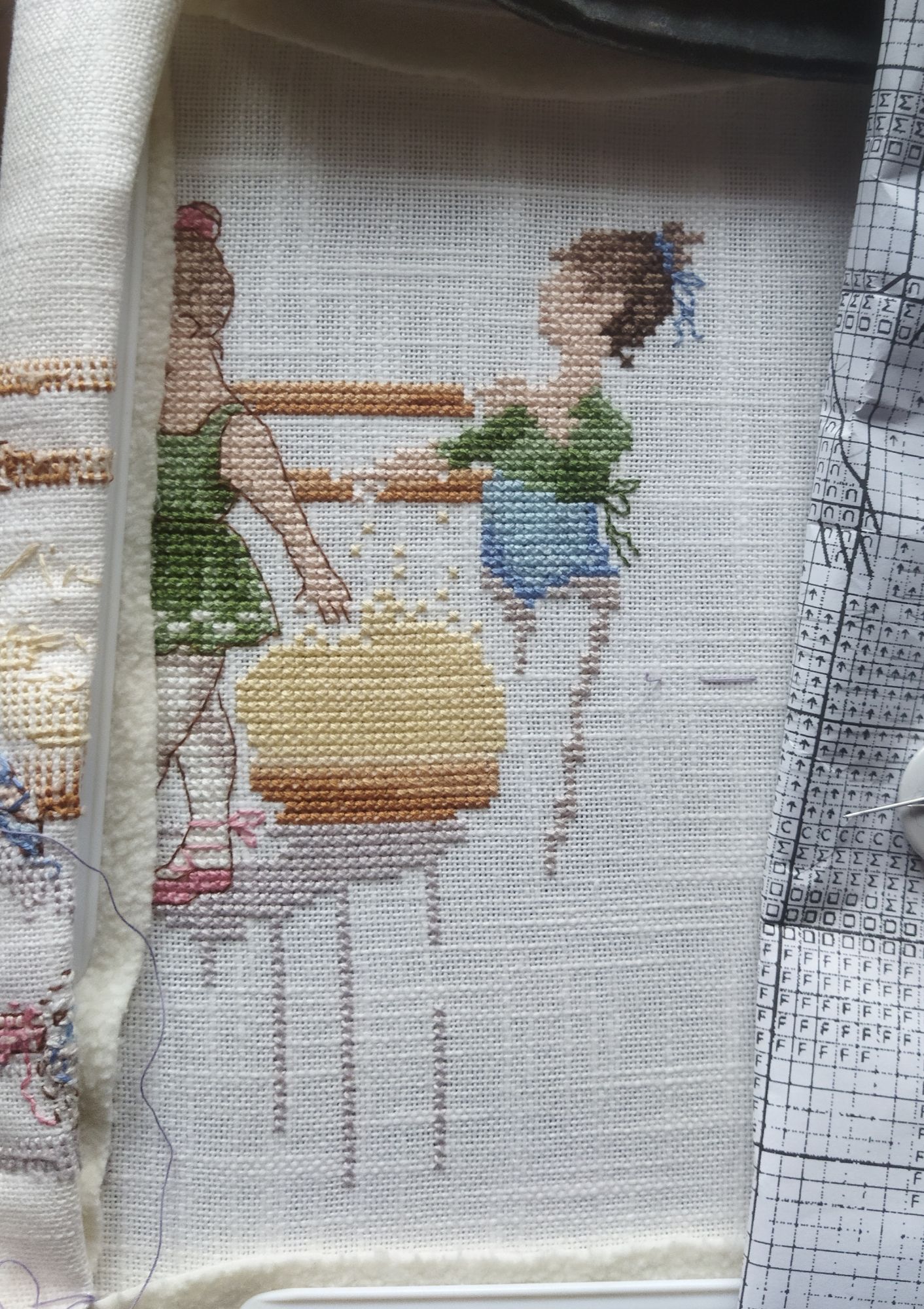 4 декабря 2023 Принесла готовую девочку в зелёном, и вот так теперь смотрятся три грации Но вернула я снапы не для фотографии, а случилась досадная неприятность. Я когда собирала ниточки на дизайн в запасах нашла все номера, но ниток, которыми вышивается фон (стены) было мало. Понадеялась, что ниток хватит и рискнула. Зря! Ниток не хватило, заказала необходимый тон, а он довольно сильно отличается от того, что у меня был. Правда, лежал у меня тон, которого не хватило, очень давно. Короче, можно было бы думать, что в балетном классе стены или неравномерно покрашены, или в пятнах, но это не мой вариант. Выпорола весь бледно-жёлтый и заново вышила новой ниточкой. MiracleNZ, Aleksacha , sunny981 и 13 других сказали спасибо Поделиться сообщением Ссылка на сообщение