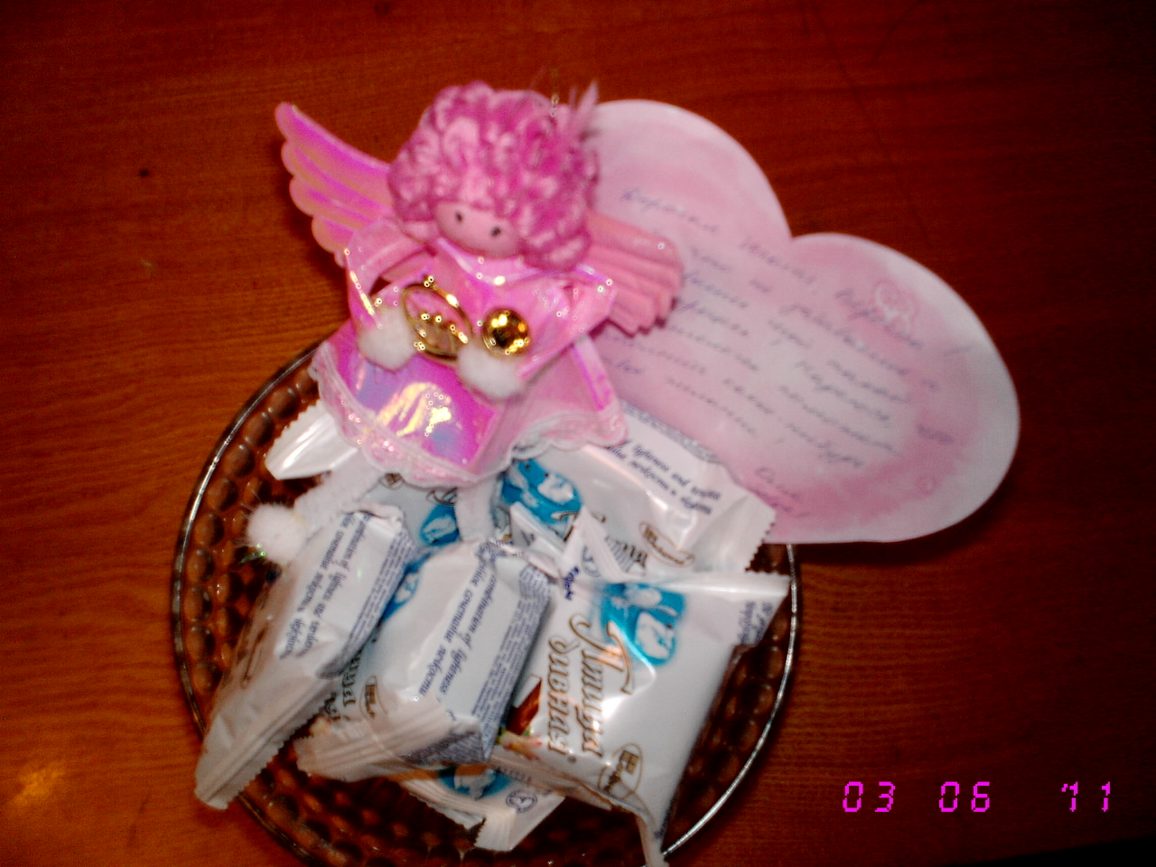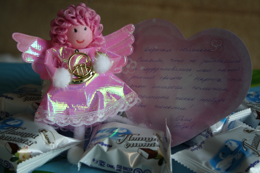 Хвастаюсь сюрпризом от Оли-post-615-1307127216_thumb.jpg.Ангелочек уже на своем месте,оберегает наш дом,конфеты почти съедены и даже Воркутинские новости прочитаны. СПАСИБО!