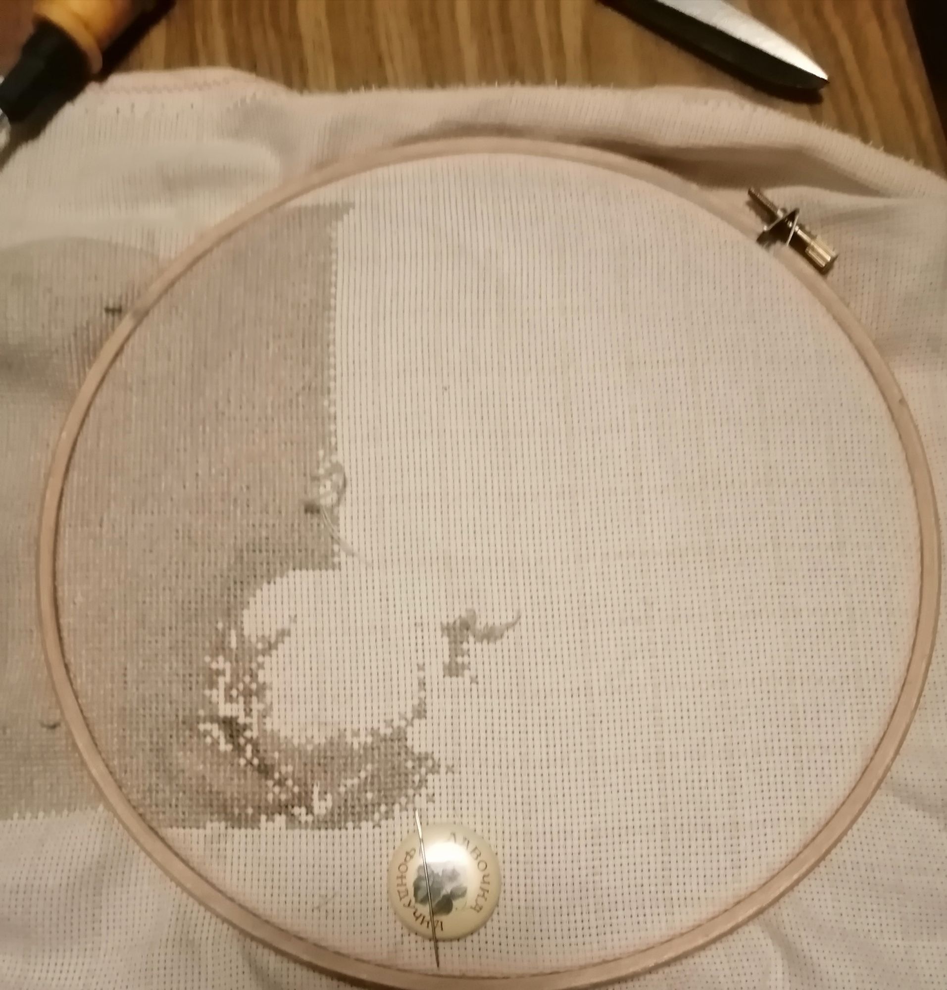 19 июня 2022 Всем привет. У меня пока "вышивальный стоп", считай,больше трёх недель пришлось отсутствовать дома, поэтому мой букет с пионами скучал без продвижения. Последний мой показ был вот на этом этапе (фото не для гаечки): И вот что прибавилось до моего отъезда (не в гаечку): Это отшито ещё два листа,и кроме фона появляются очертания первого бутона. Ну,а с собой могла взять только старый долгострой,потому что условий для вышивки как-то в эти три недели не предусматривалось,но время иногда надо было чем занять, поэтому то и взяла процесс с минимальным набором цветов и не очень сложный ( по сравнению с Букетом, это как работа детсадовца младших групп). И так, старый Риолис, "Луна". Вот на чем остановилась когда-то давно ( не для гаечки): И вот,что удалось успеть вышить за эти недели (уже для гаечки): Такими темпами,через пару лет закончу Луну 19199707770, OlyaKslv, Хозяйка смешных зверей и 7 других сказали спасибо Поделиться сообщением Ссылка на сообщение