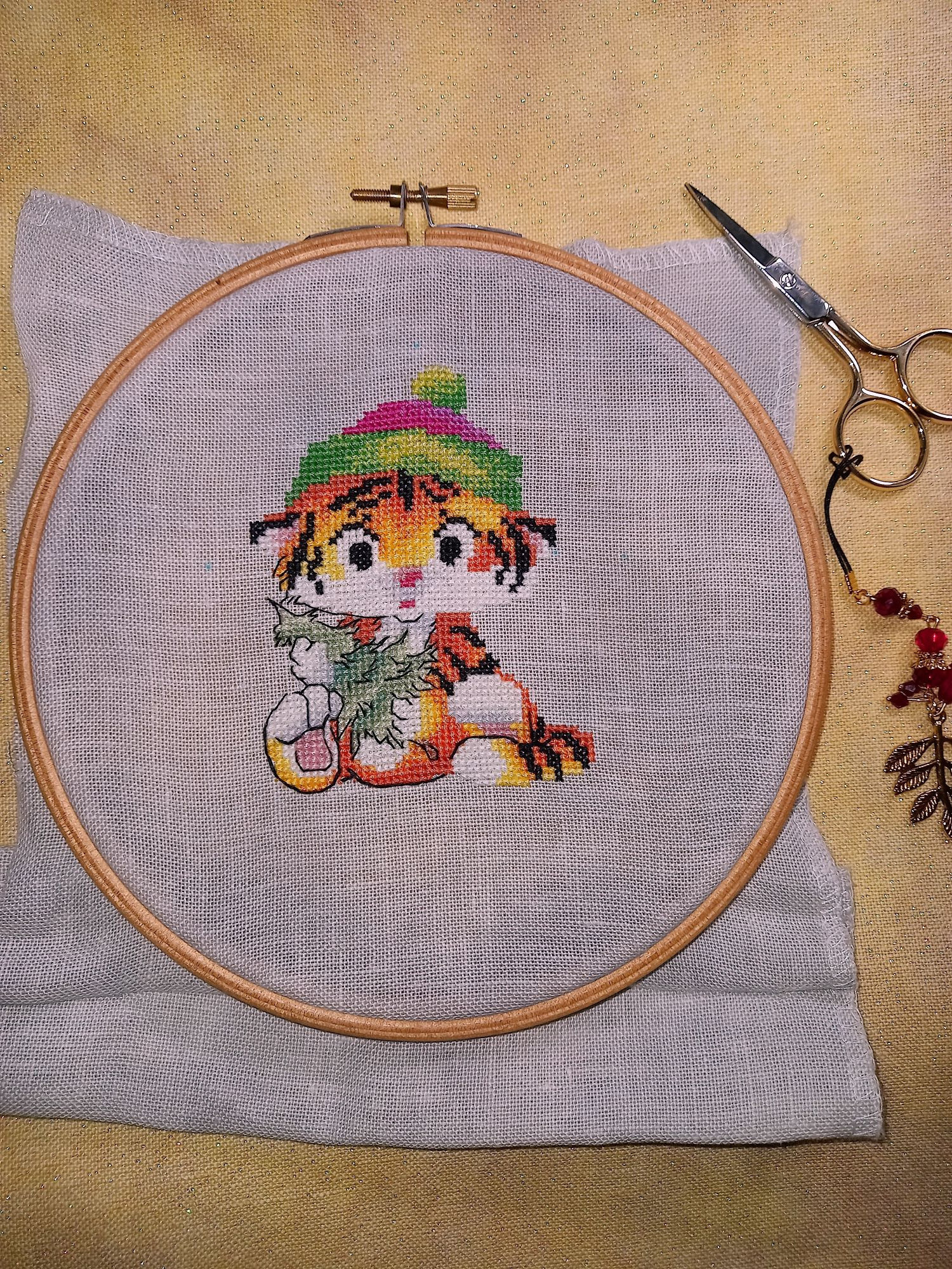 1 января 2022 Как-то мало тигров показала, есть ещё один, ЧЕТВЕРТЫЙ. Тоже по схеме Александры Киселёвой "Тигренок с елкой". До него очередь дошла только после того, когда все предыдущие были отшиты, в начале декабря. А размер у него побольше, и хоть я вышивала на равномерке Белфаст 32 каунта, он в окно диаметром 10 см не вписывался, т.к. по диагонали вышло более 12 см. Поэтому оформлялся уже в моей багетке. Меньший каунт равномерки у меня не водится, т.к. трудно моим глазкам на более мелкой основе. Теперь я задумаюсь на эту тему. Татусенька, заведи, пожалуйста сначала гайку на шар "Морозная рябина" (в сжатых он уже появился), потом на этого Тигренка с елкой. Подарок оформился в притык к НГ, но уже вручен, если все сложится, завтра покажу фото. И теперь я приступаю к следующему Тигру! sta.nsk, nata-g, Пушистая и 24 других сказали спасибо Поделиться сообщением Ссылка на сообщение