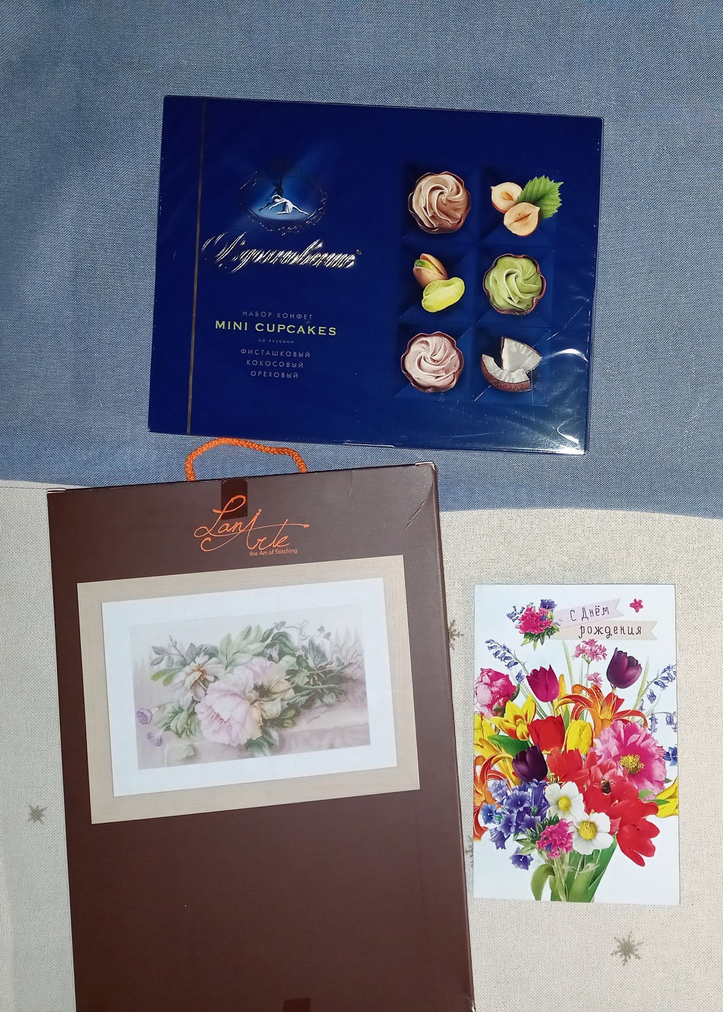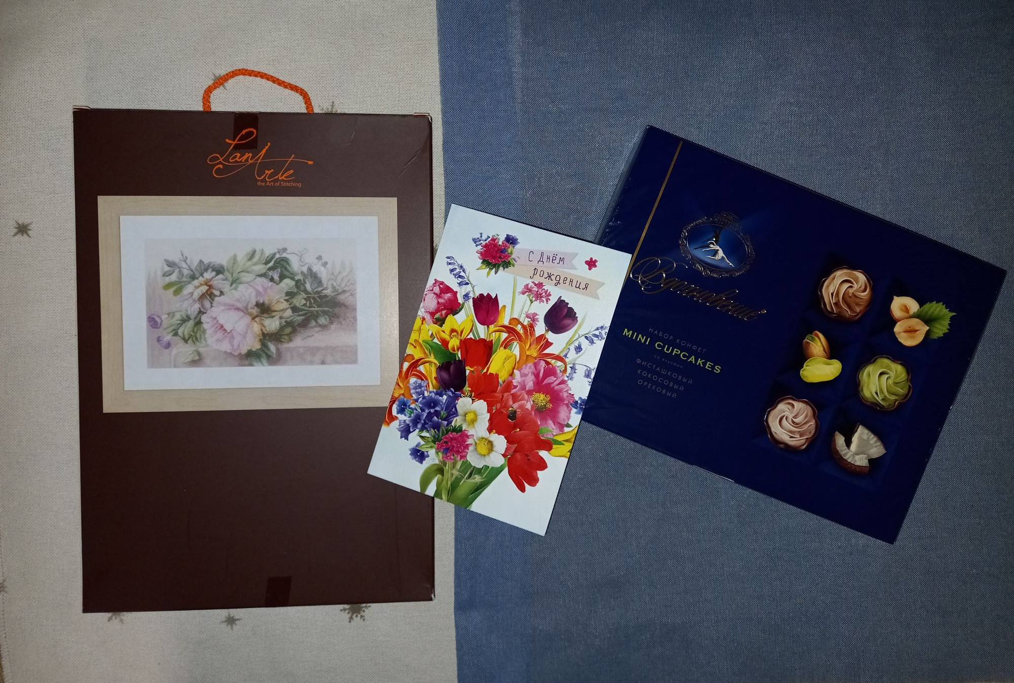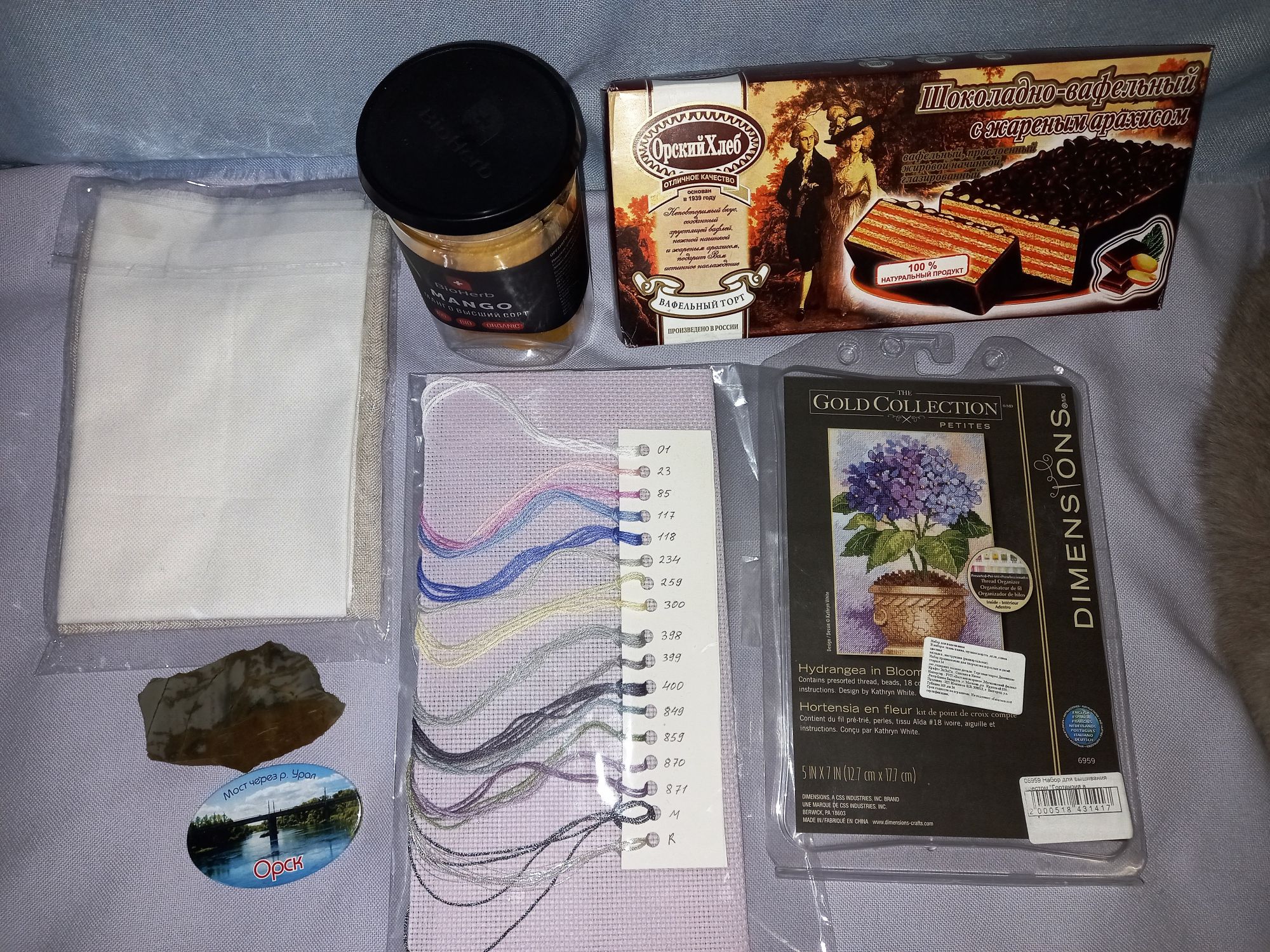 27 января 2022 Я немного продвинула свои процессы, и первый - это Тигренок, игрушка на елку. Гаечку мне уже позеленили! Кто участвовал в Карнавально-вышивальном флешмобе уже успели это заметить, а для остальных покажу ещё здесь. Вид спереди, вид сзади и на ёлочке уже повисел: есть ещё пинкипы к году Петуха вышивала: Второй процесс Маки. Тоже подросли. если кому интересно - бэкала я 6 дней эту верхнюю четверть подушки. Кстати, нижнюю столько же. Это ещё всё пока без фрузиков!!! Фрузики здесь будут черные на маках и желтые на белых цветочках - в количестве около 100 штук. Вот думаю, может бисером попробовать заменить? Или не стоит? Ну а теперь очень приятная часть третья: К моему дню рождения получила я подарочек из далёкого Донецка, от Галочки @махно!!!Коробочка с чаем самых разных вкусов (кстати, я половину уже распробовала), торт вафельный трюфельный, коробка конфет, письмо с трогательными словами и поздравлениями, а также связанный Галочкой палантин, в оттенках, созвучных тигру, как наступающий год. На палантине приколота брошь - тигр. Цвет ниточек плавно переходящий от светлого к темному - это тааак привлекательно! Конечно же я решила сфоткаться и показать вам палантин на себе. Но фотки совсем не получились, хоть старалась я 3 дня. Я же сразу унесла его на работу. И конечно же все там обомлели!!! Особенно удивилась моя начальница, она вяжет. Только себе и двум взрослым дочерям. И никому никогда ничего такого не дарила. Она была в шоке от такого подарка, в общем, как и я, Галочка! Теперь я в полной мере ощущаю тепло твоих ручек всем телом и с благодарностью буду носить такой щедрый подарок. Кстати, рисунок на моем палантине называется "Ландыши"! Прелесть просто! Обожаю рукотворные вещи! Спасибо тебе Галочка большущее! Теперь часть четвертая: в канун дня рождения получила я ещё одну посылочку! Вот уж нежданно-негаданную! Прилетел ко мне подарочек из Москвы! От Танечки @Tatiana2406С двумя коробочками и открыточкой. Но если первую коробочку с конфетами я сразу разглядела, то вторую нет. Но когда же мне удалось добраться до неёё... боже... я обомлела! Это же Ланарт! Тот самый, не пробованный мною, - это во первых, а во-вторых, моя хочушка, которую я страстно желала, но жаба меня душила. И как же я была близка уже к покупке этого набора, когда ровно год назад на 8 марта Мариночка @mag сообщила о скидке на Озоне на этот набор! Я побежала, схватила там этот набор, оплатила, но через несколько часов (через 6ч)мне пришло сообщение, что товара нет, деньги мне вернут на карту... И вот он, у меня! Впечатления - потрясающие, девочки!!!! Нежнейшие пионы! Любимые мною цветочки! Танюша, спасибо ещё раз огромное за эти чувства, нахлынувшие на меня! Продолжение: Часть пятая. Ровно в день моего рождения я получаю письмо от Мариночки @mag что её посылка почти успела к нужному дню. И через пару часов статус сменился, и я в свой день рождения побежала на почту и получила чудесную посылочку!(Ровно год назад в свой день рождения я была на почте и получала от Галочки посылку!!! помню это как сейчас) Что бы это значило? Такие точные попадания! И опять неожиданные радости, их несколько: во-первых, там вкусности: торт Орский хлеб с арахисом и манго в баночке. Вы ели когда-нибудь вяленые манго? А я сразу попробовала Вкус потрясающий! во-вторых, магниты, да не простые, а с Орском и из камня яшмы. У меня теперь тоже такие! В тр