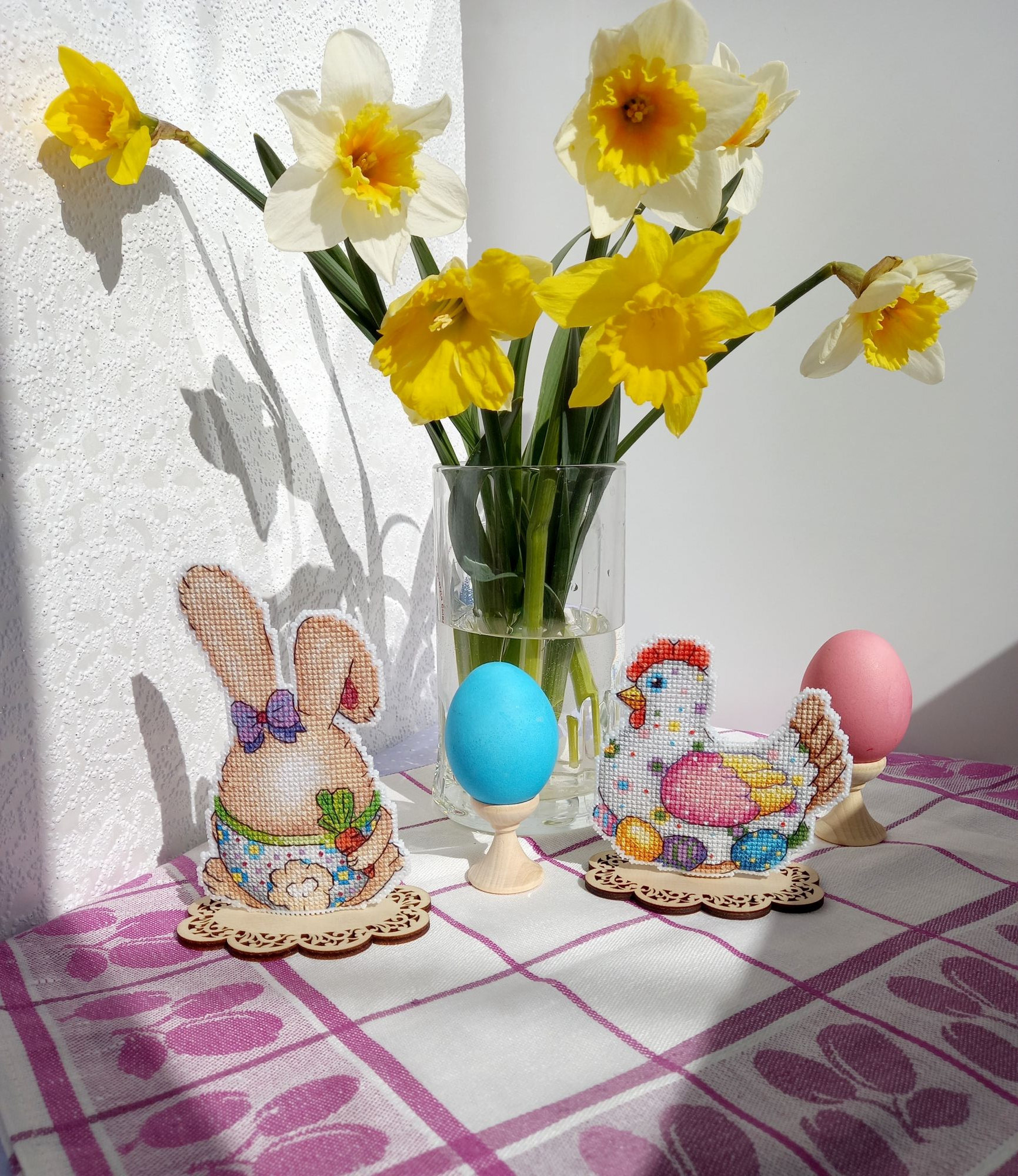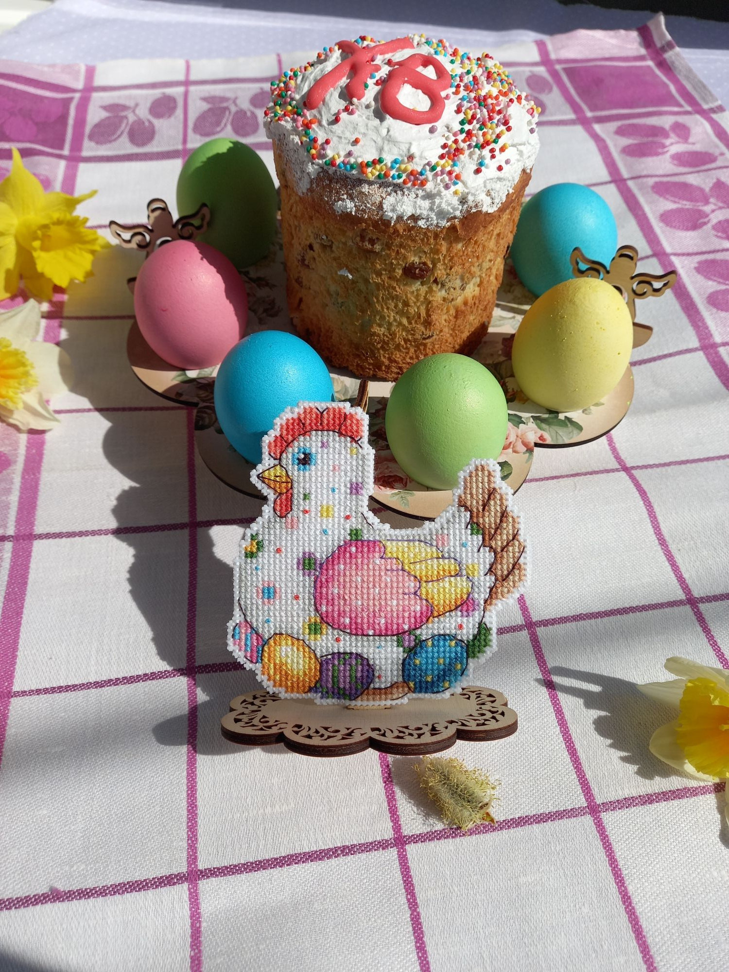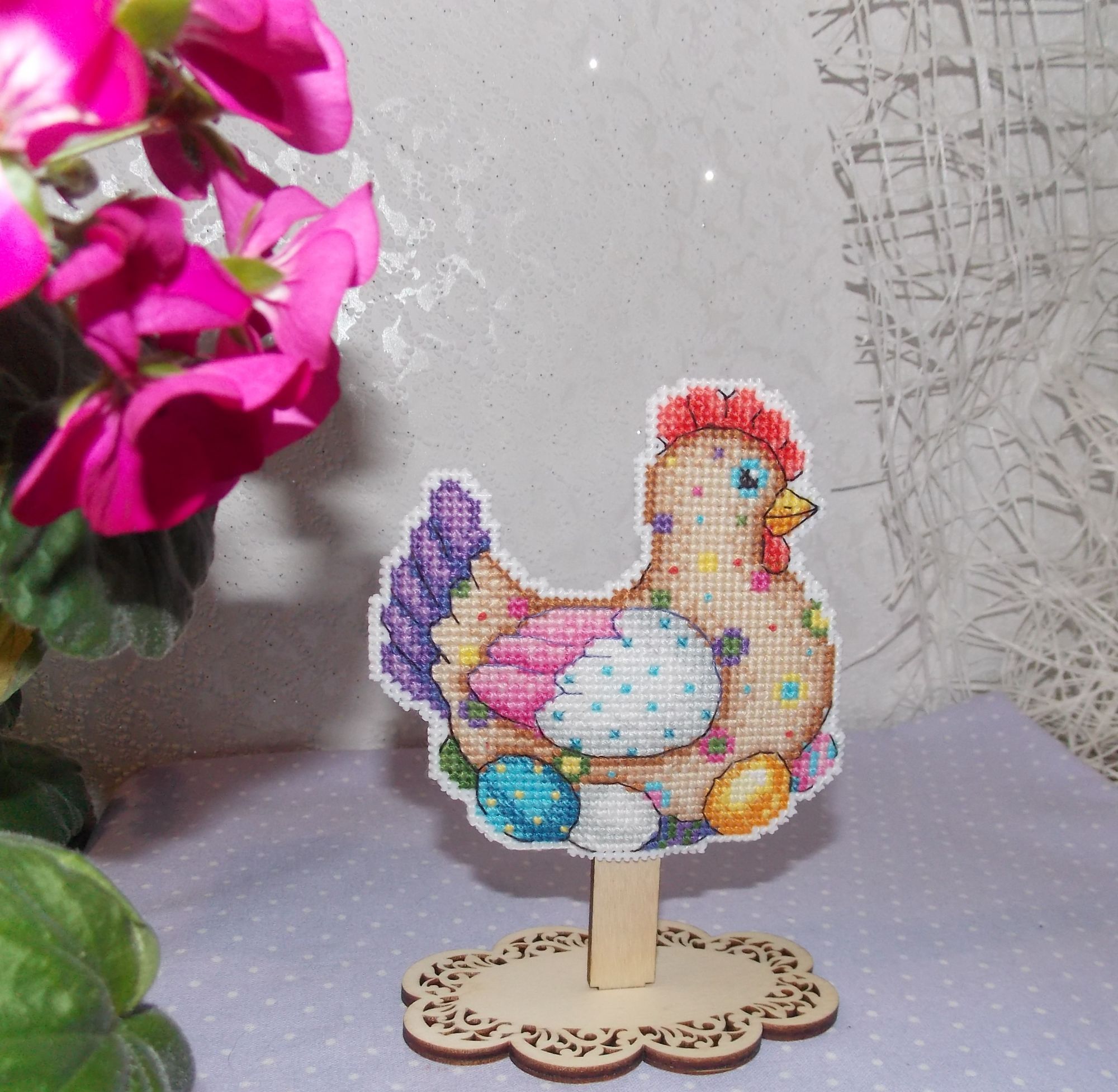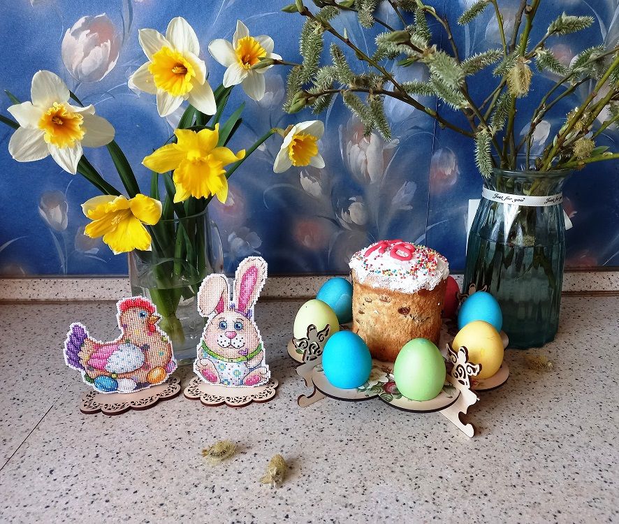 23 апреля 2022 Не могу удержалаться, чтобы не показать вам своё "Отражение" не довела до конца водичку, но зато это результат за 2 недели, примерно 5700 крестиков, то есть 16% Я просто прилипла к нему, не могу оторваться! Нравится канва, так легко иголочка проскакивает, и конечно, нравится то, что получается! Малышку с ледяным деревцем пока не начинала. Ну и мне надо было пофоткать курочку пасхальную для галереи, т.к. я не додумалась подпилить подставку, на которую я её посадила, когда вышила. И зайца, кстати тоже!И только увидев фотки, поняла, что курица у меня как бы на "ноге" сидит, это как-то неправильно, ведь она на яйцах! Поэтому я сняла их обоих с подставки и взялась за подпиливание. Муж смотрел на меня и ждал, что у меня ничего не получится. Но как же он был удивлен, что ровно через 7 минут я спилила почти 2см лишних у курочки и 0,5 см у зайца. Нынче подготовка к пасхе предстоящей у меня прошла замечательно, вот результат. курочка было: стало:и оба вместе со всех сторон: Кстати, за нарциссами бегала на огород 3 дня, все ждала, выпустят свой цветонос или не успеют. На некоторых фото видно, что сначала были бутоны, а к концу дня уже почти полностью распустившиеся цветы. В общем, порадовали меня. svetlana62, Путешественница, Nata_Struchkowa и 18 других сказали спасибо Поделиться сообщением Ссылка на сообщение