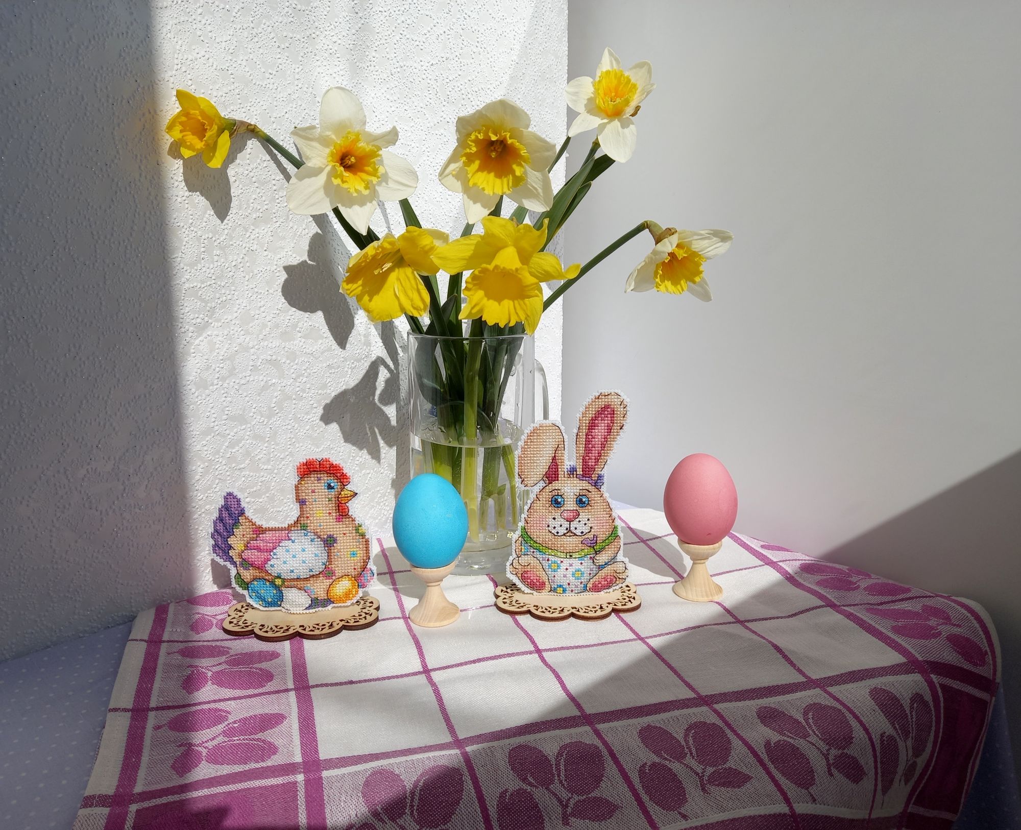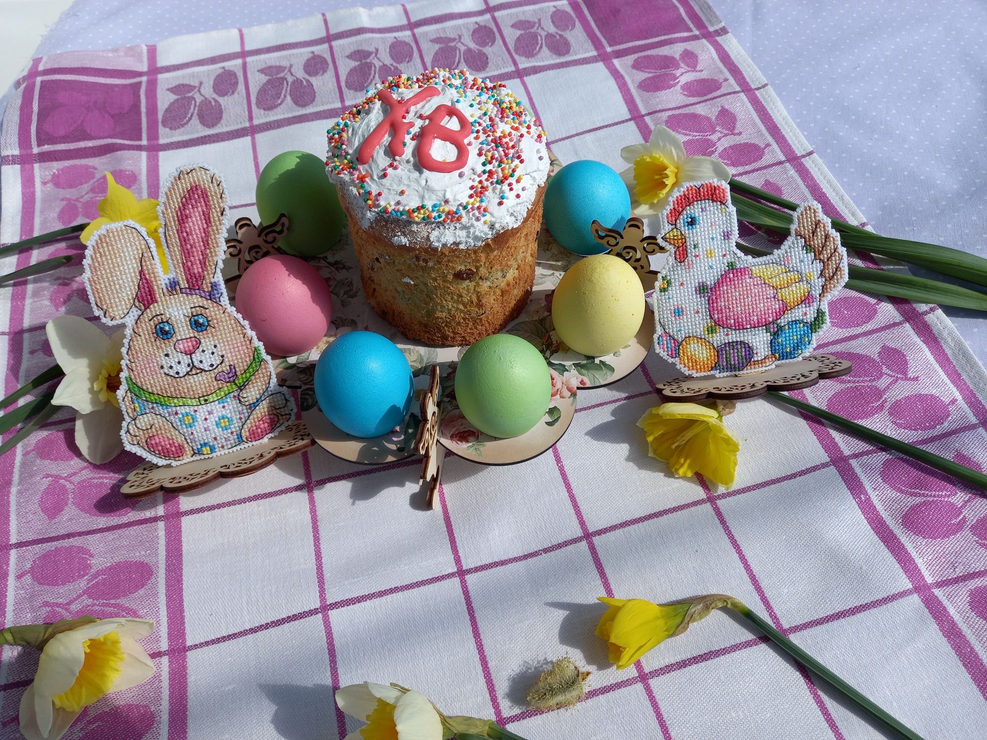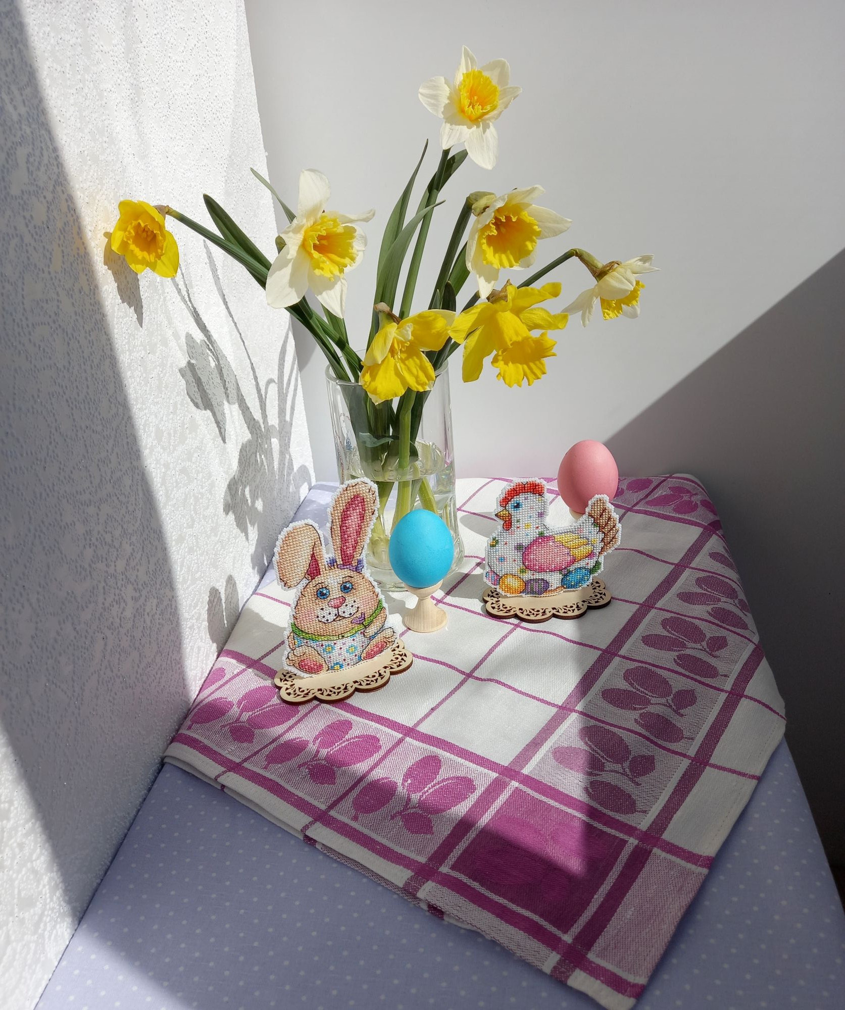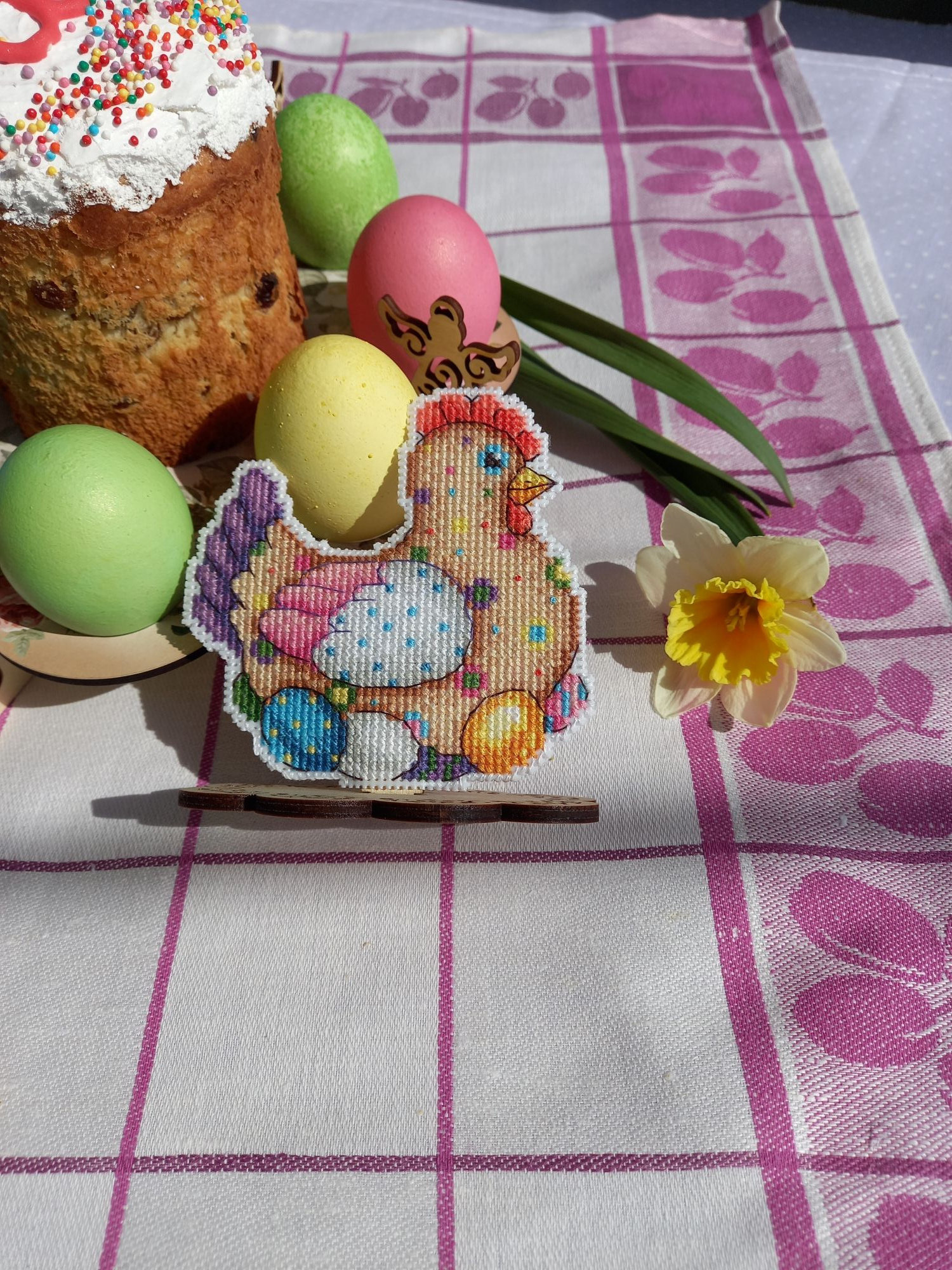 23 апреля 2022 Не могу удержалаться, чтобы не показать вам своё "Отражение" не довела до конца водичку, но зато это результат за 2 недели, примерно 5700 крестиков, то есть 16% Я просто прилипла к нему, не могу оторваться! Нравится канва, так легко иголочка проскакивает, и конечно, нравится то, что получается! Малышку с ледяным деревцем пока не начинала. Ну и мне надо было пофоткать курочку пасхальную для галереи, т.к. я не додумалась подпилить подставку, на которую я её посадила, когда вышила. И зайца, кстати тоже!И только увидев фотки, поняла, что курица у меня как бы на "ноге" сидит, это как-то неправильно, ведь она на яйцах! Поэтому я сняла их обоих с подставки и взялась за подпиливание. Муж смотрел на меня и ждал, что у меня ничего не получится. Но как же он был удивлен, что ровно через 7 минут я спилила почти 2см лишних у курочки и 0,5 см у зайца. Нынче подготовка к пасхе предстоящей у меня прошла замечательно, вот результат. курочка было: стало:и оба вместе со всех сторон: Кстати, за нарциссами бегала на огород 3 дня, все ждала, выпустят свой цветонос или не успеют. На некоторых фото видно, что сначала были бутоны, а к концу дня уже почти полностью распустившиеся цветы. В общем, порадовали меня. svetlana62, Путешественница, Nata_Struchkowa и 18 других сказали спасибо Поделиться сообщением Ссылка на сообщение