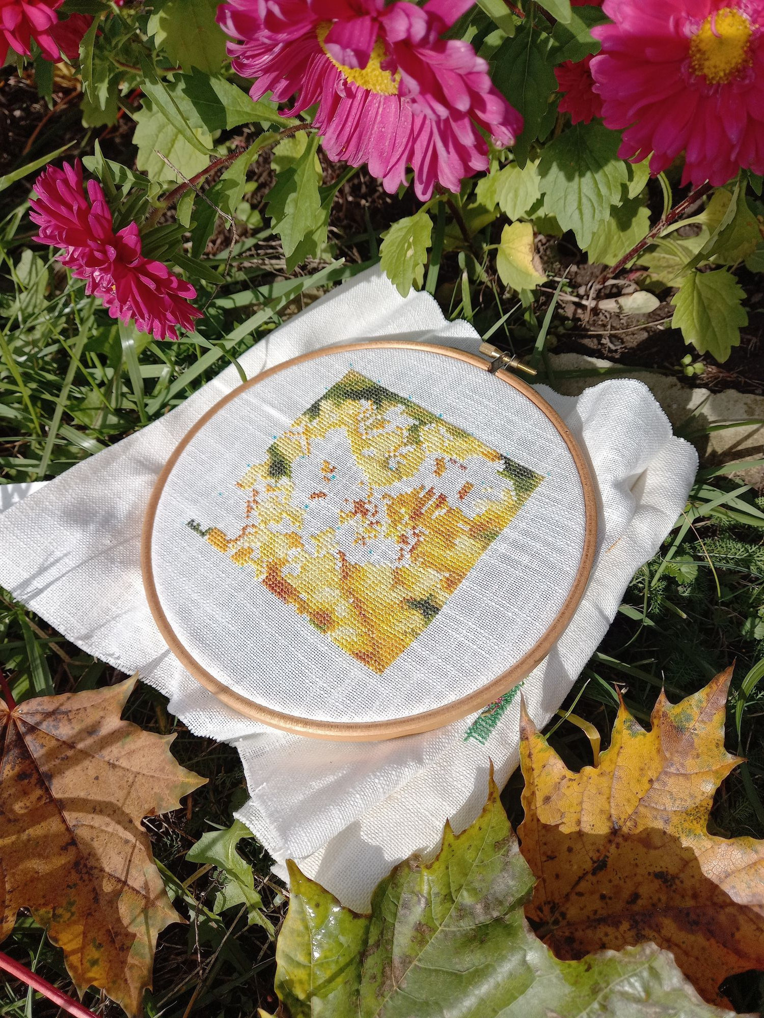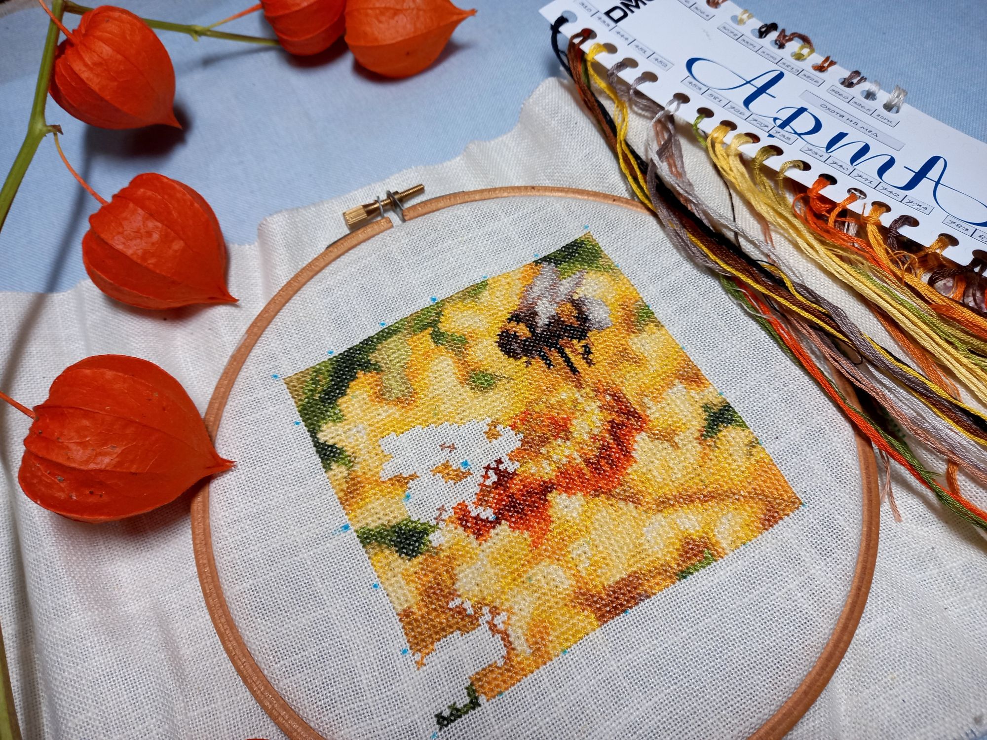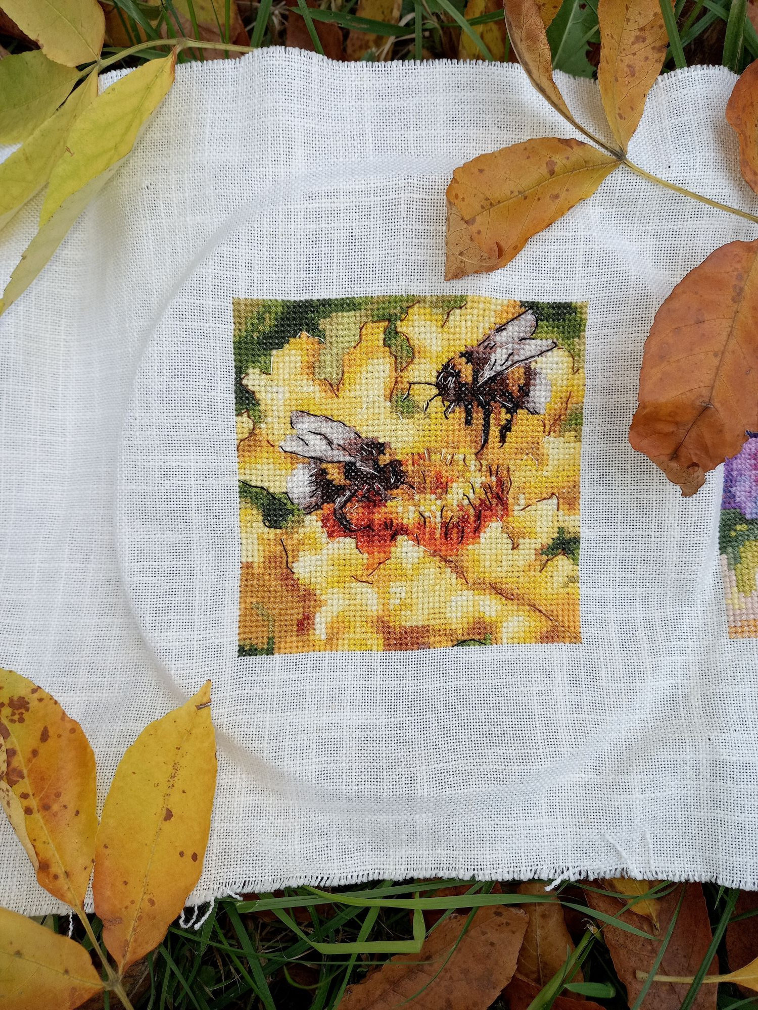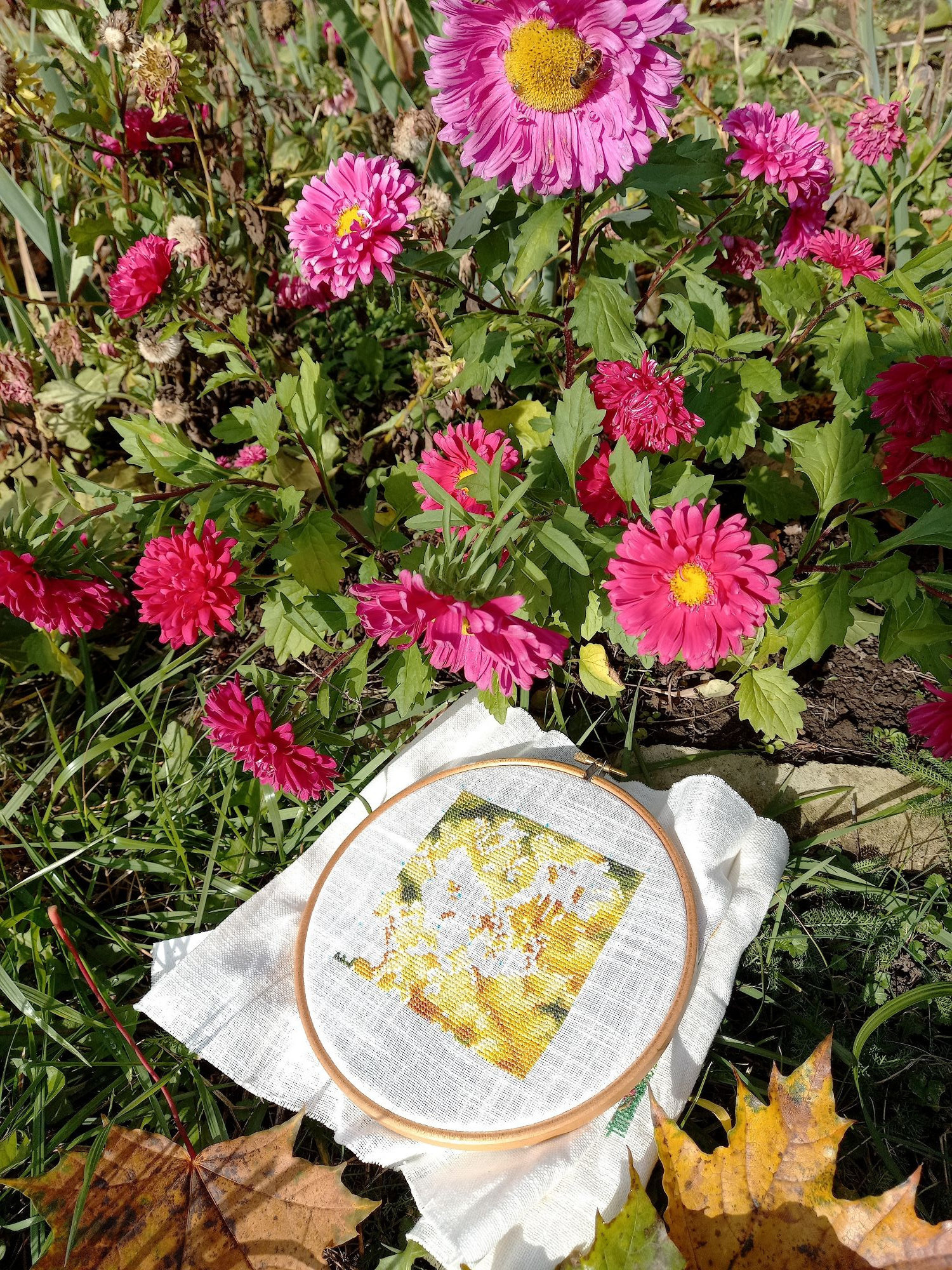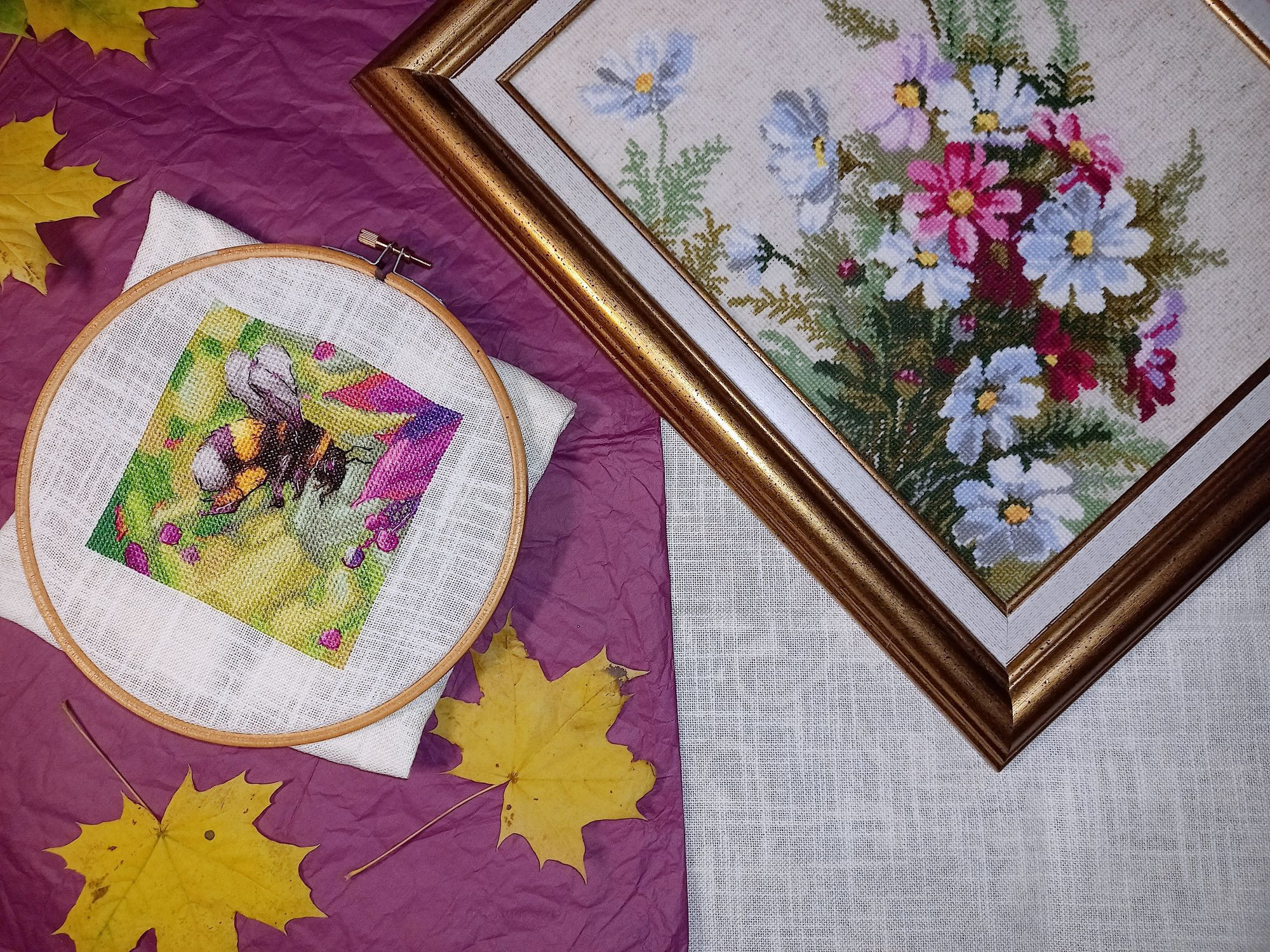 16 октября 2023 13.10.2023 в 08:26, Tata44 сказал(а): Собиралась пораньше прийти с отчетом, но слишком замоталась. Много есть вышитого, а также оформленного чуть-чуть. Начну с Осенней поры. Захватила меня так эта работа, что за уши не оторвать. К появившимся очертаниям зелёного деревца я добавила листочков и ещё парочку деревьев было: стало: дорога почти полностью видна, осталось только добавить перспективу и справа берёзок и будет 60 процентов, а пока где-то 40 процентов вышито. По совету Наташи вовремя переключилась на своих шмеликов. Начала "Пчелиный дуэт. Ек.Волкова. 54 цвета, в т.ч. 11 блендов. Тут у меня сначала прилетели пчёлки, а потом только нарисовался цветок. Начало: а это с бэком: Ко мне на вышивку прилетела бабочка, но успела сделать только 2 фото, потом она стала биться в окно, пришлось выпустить на улицу. Итак, первый бэк пошёл! Будут и остальные. Но сначала открываем ещё одну гаечку имени Волковой. Это пятый. Охота на мед. Е.Волкова, 41 цвет, из них 33 чистых, основа та же. начало: Ну а теперь Оформившиеся Маки от Марьи Искусницы. До чего же они хороши! Так нравилось проводить им фотосессию. А сейчас ещё раз полюбоваться вместе с вами на этот прекрасно-летний романтиШный сюжет и вспомнить лето!вот здесь чайка прилетела, по воде ходила долго.а вот здесь стрекоза, только её не видно, поэтому поближе сфоткала Какая красота. Дождалась фото с продвижением по осеннему пейзажу))) такие сочные цвета))) Подскажите где нашли такую прекрасную подставку для рамы,чтобы фото сделать? Tatiana2406, svetlana62, Tata44 и 1 другой сказали спасибо Поделиться сообщением Ссылка на сообщение
