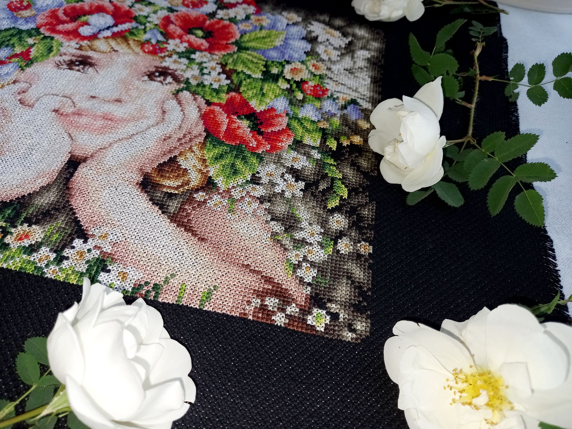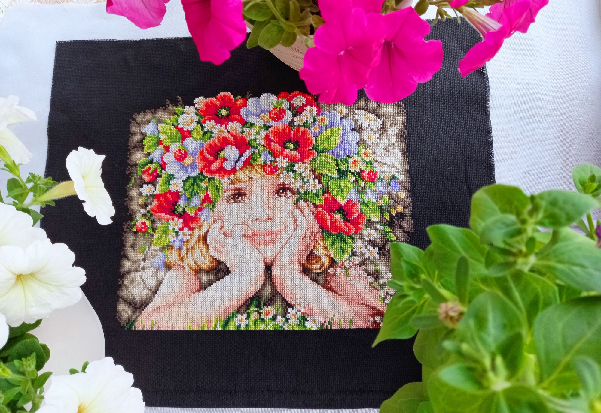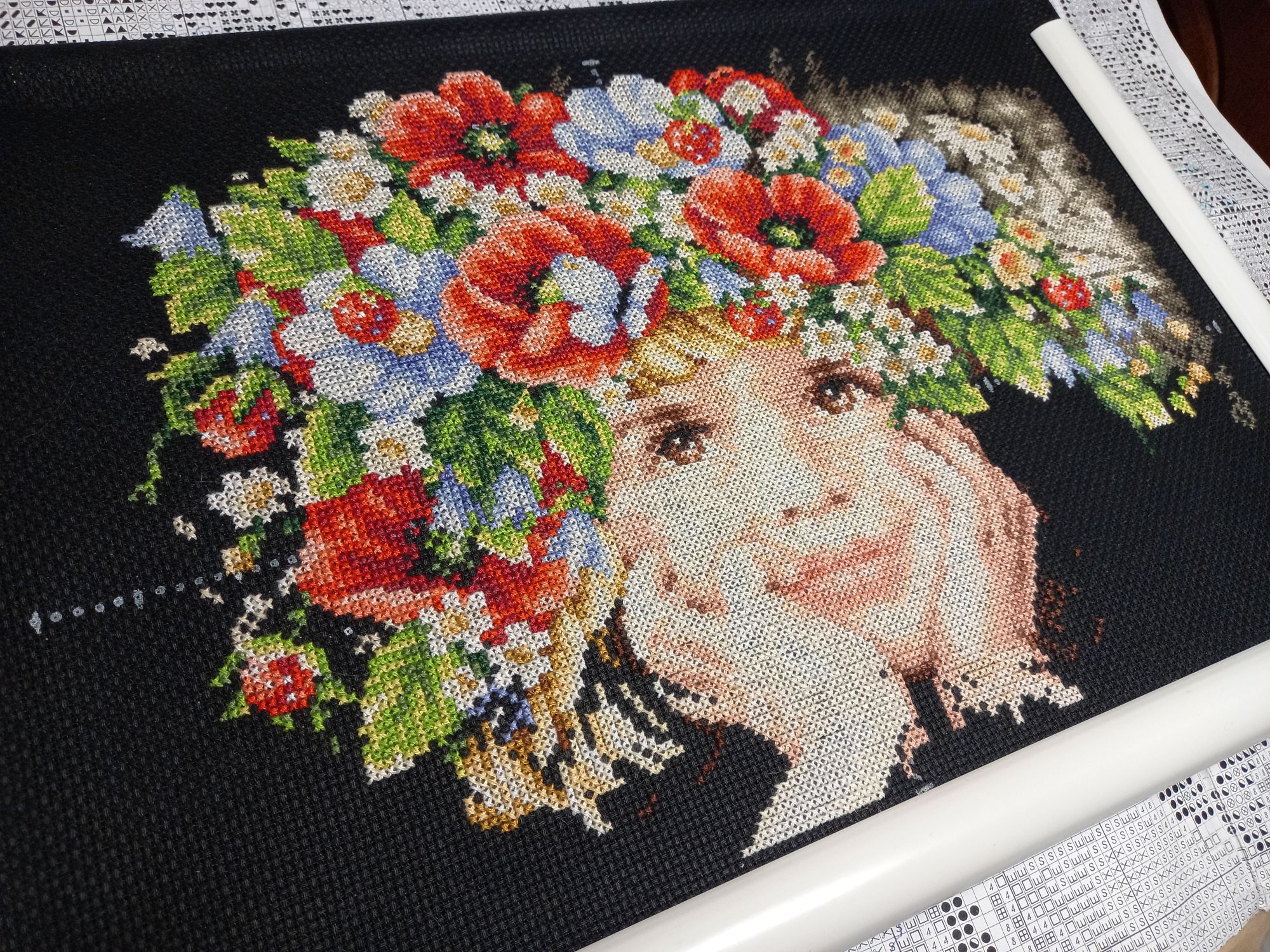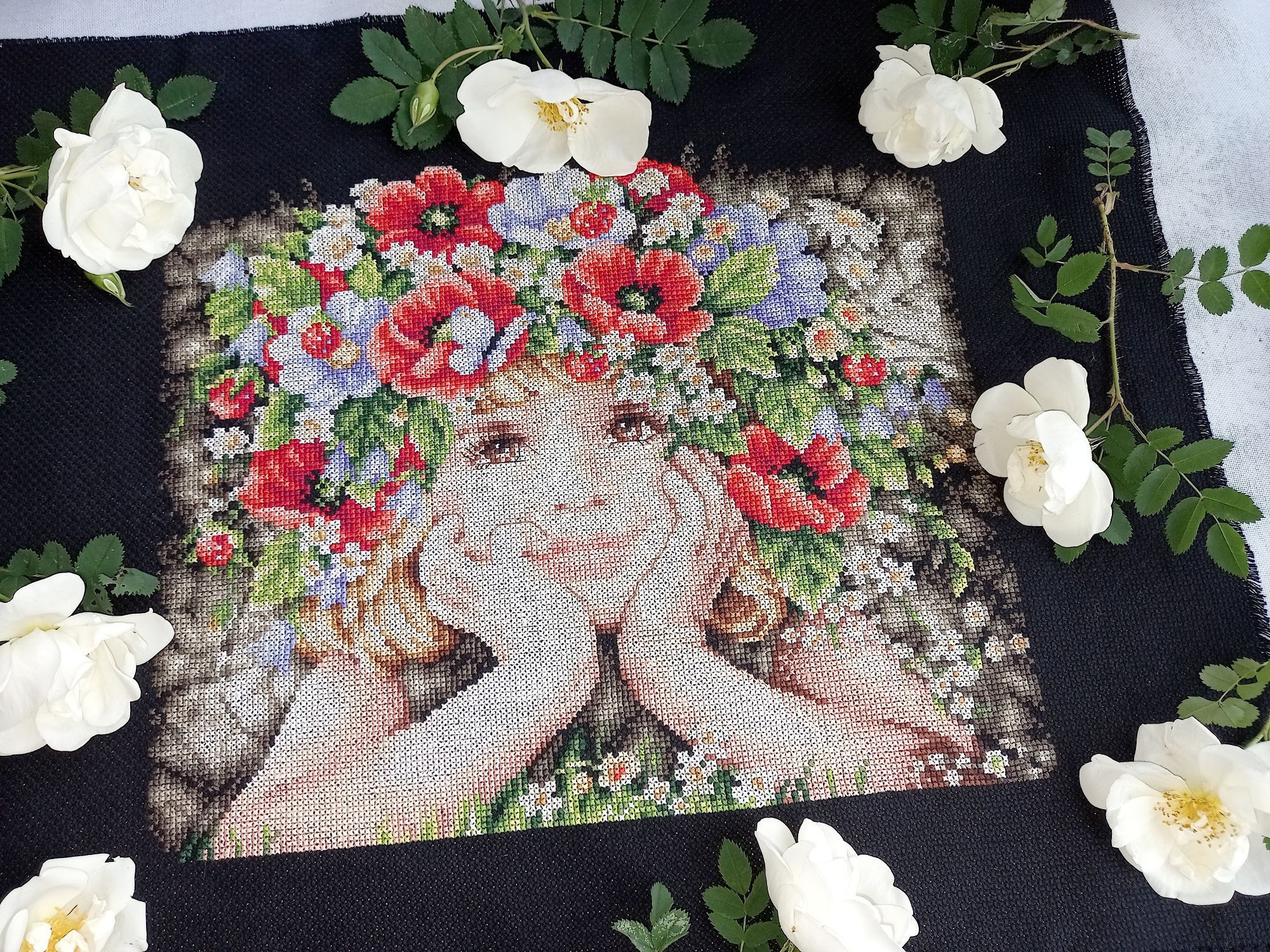 9 июня 2024 Всем привеееет! Обещала я через 2 месяца завершить девочку в цветочном венке. Всё исполнено! Принимайте кучу фоточек моей красотулечки. Вышивать на черной канве гораздо сложнее, конечно, чем на белой. Но я её победила. Сначала дошла до первого угла сверху справа: Было: стало: затем море цветочков добавилось слева: и фон, вышив который, я, наконец достала второй угол!Потом пошла вниз, за правой ручкойИ потом к последнему, четвертому углу: И это всё без бэка. Глазки обвела бэком только после стирки, как обычно. Ещё немного моих ирисов, пионов, петуний и не цветущих пока ещё бархатцев, а вот роза моя плетистая замерзла (: ( Весна морозная кончилась у нас, жаркое лето началось. vodonika, Lucia-del-Umago, Кисюня и 30 других сказали спасибо Поделиться сообщением Ссылка на сообщение