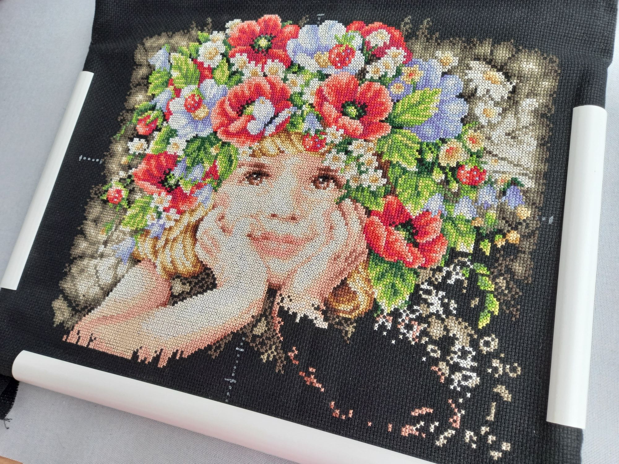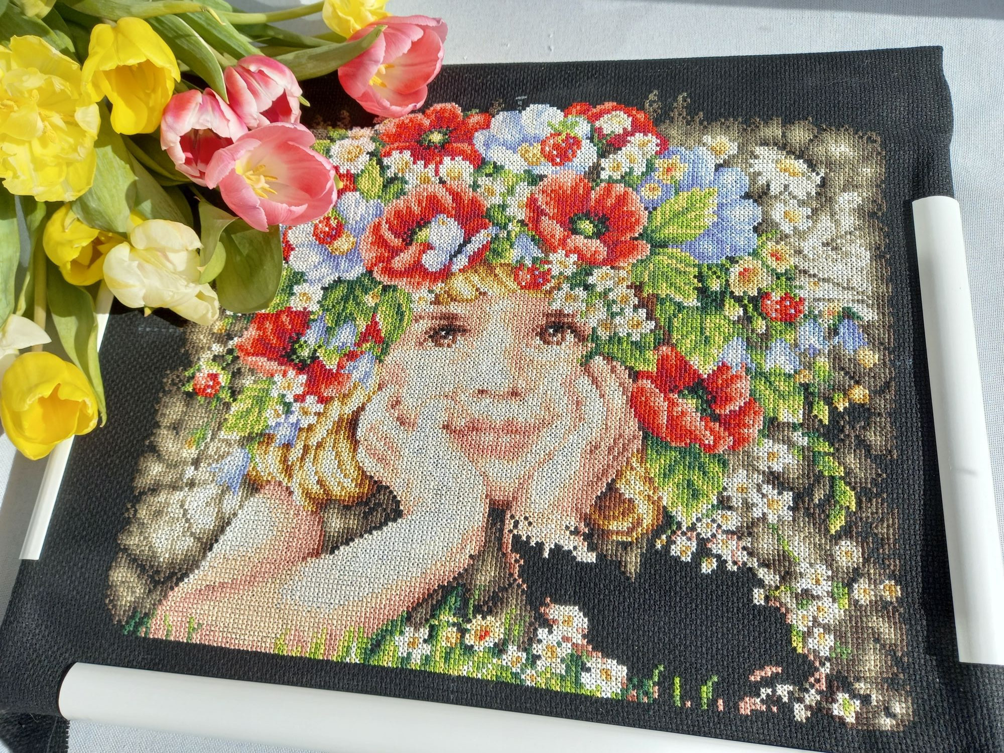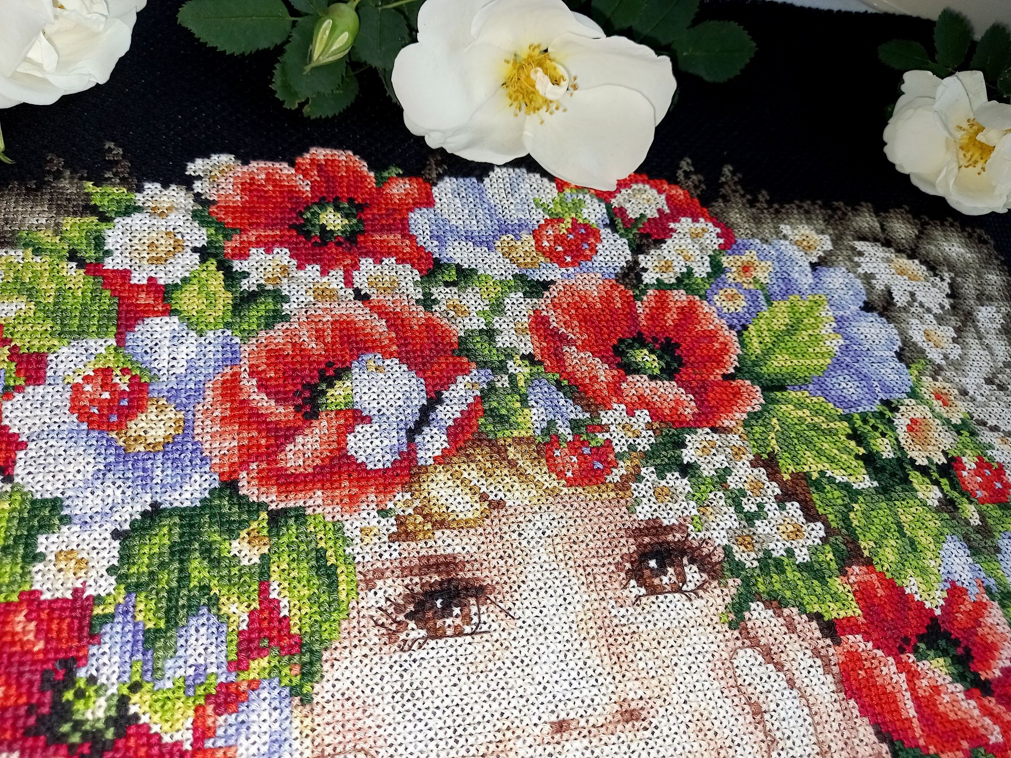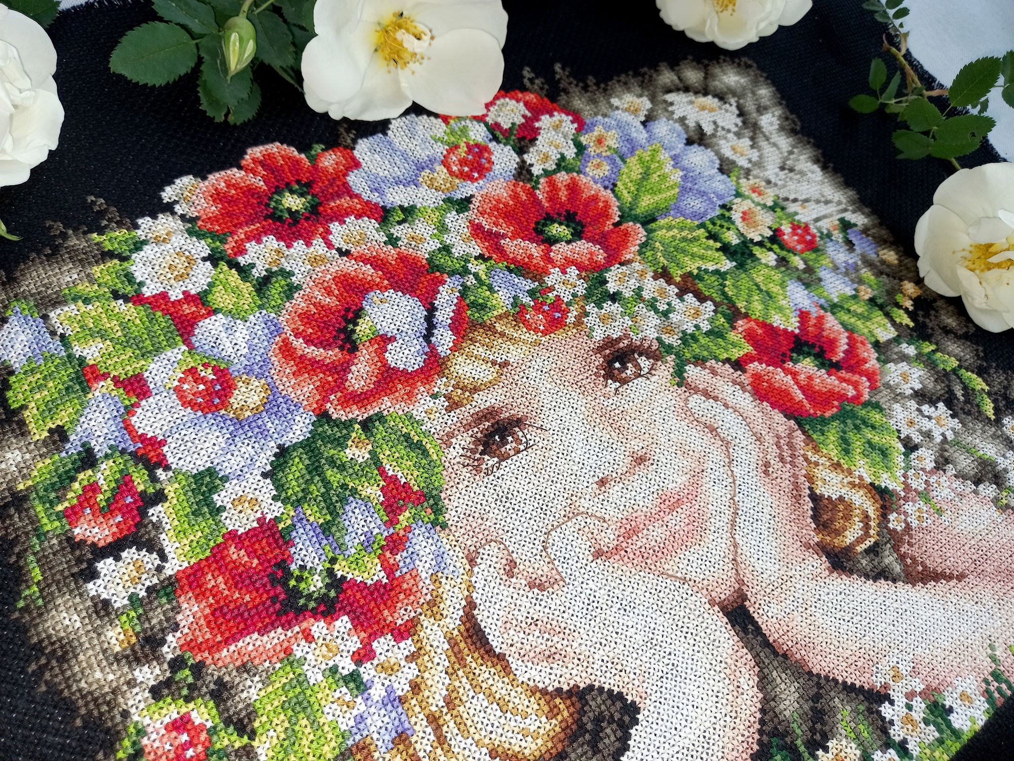 9 июня 2024 Всем привеееет! Обещала я через 2 месяца завершить девочку в цветочном венке. Всё исполнено! Принимайте кучу фоточек моей красотулечки. Вышивать на черной канве гораздо сложнее, конечно, чем на белой. Но я её победила. Сначала дошла до первого угла сверху справа: Было: стало: затем море цветочков добавилось слева: и фон, вышив который, я, наконец достала второй угол!Потом пошла вниз, за правой ручкойИ потом к последнему, четвертому углу: И это всё без бэка. Глазки обвела бэком только после стирки, как обычно. Ещё немного моих ирисов, пионов, петуний и не цветущих пока ещё бархатцев, а вот роза моя плетистая замерзла (: ( Весна морозная кончилась у нас, жаркое лето началось. vodonika, Lucia-del-Umago, Кисюня и 30 других сказали спасибо Поделиться сообщением Ссылка на сообщение