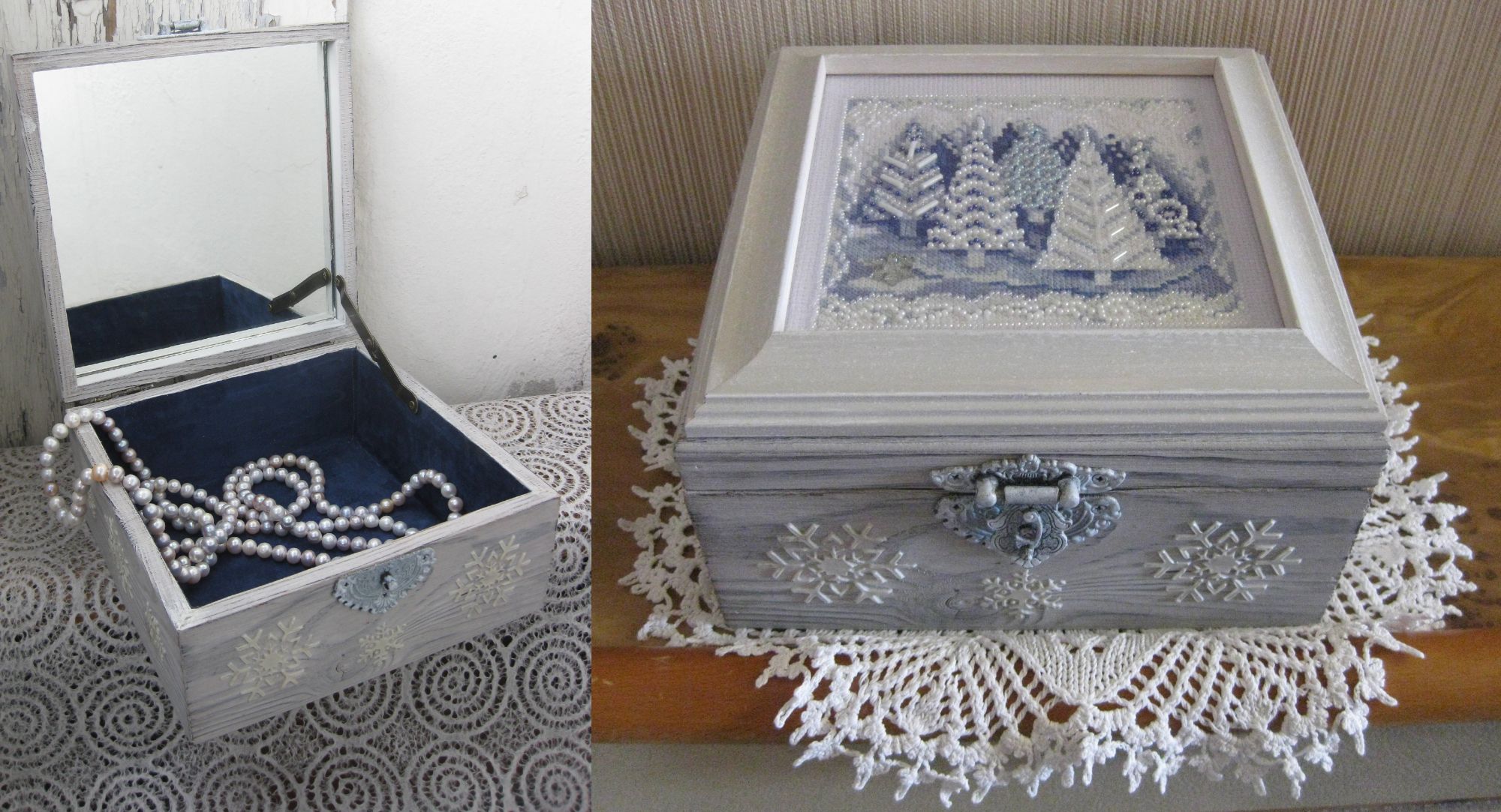 25 октября 2019 Добрый день, дорогие мастерицы! Скоро-скоро праздник, все готовятся к этому знаменательному событию! Представляю на конкурс работы своей свекрови Аллы Фёдоровны! Кто-то уже знаком с её работами и даже следит за её творчеством. Рада представить вашему вниманию труды своей рукодельной свекрови, а оформление всегда за мной. 1. Ларец Снежной королевы. За основу взят набор Mill Hill MH14-9303, (Winter Wonderland), где перфорированная бумага заменена канвой с люрексом, а вместо зайца снежинка того же производителя. Увидев этот набор, сразу загадала сотворить шкатулку. Пока Алла Фёдоровна вышивала, я мастерила из деревянной заготовки шкатулочку: брашировала, тонировала, подкрашивала в нужный тон фурнитуру, наносила рельефные снежинки по всему периметру, внутрь вклеивала натуральную замшу ярко-синего цвета. Когда вышивка и шкатулка были готовы, сдала в багетку на сборку, работа прикреплена на крышку с помощью деревянного багета обратного профиля, стекло музейное, а на внутреннюю поверхность крышки вклеили зеркало, фиксатор крышки мы добавили уже позже. Этот сказочный ларец поселился у Аллы Фёдоровны и служит хранилищем для приятных мелочей. Мне очень приятно, что я собственными руками смогла сделать любимой свекрови приятный сюрприз! 2. Серебряные берёзы Derwentwater WCB, (Silver Birches Watercolour). О, как же давно я мечтала об этом акварельном чуде, с тех самых пор, как два года назад Алла Фёдоровна вышила "Лиловый фруктовый сад". Даже не ожидала, что акварельный дуэт состоится. Но мечты должны сбываться!!! Нашлась схема заветных березок и началось что-то фантастическое!!! Каждый раз из-под иглы мастерицы выходили новые "мазки" невероятных оттенков! Готовая вышивка абсолютно живая, она меняет свой цвет в зависимости от "настроение", она всегда разная! Ещё оформляя "Садик", по каким-то необъяснимым причинам, я прямо-таки вцепилась в деревянный багет с растительным орнаментом, будто нанесённым вручную, и только сейчас поняла, что этот рисунок практически повторяет изысканный узор обложки обоих наборов. Но в этот раз багета не только не оказалось в наличии, но и даже не ожидалось по всему городу... в одной мастерской отыскала остатки, заказала раму и радостная пошла сдаваться в свою багетку!!! В оформлении использовано двойное паспарту, между ними кант, стекло музейное. Нежная акварельная тема получила продолжение и теперь всегда настраивает на приятные размышления и фантазии!!! Гало4ка, markovka, marvlase и 143 других сказали спасибо Поделиться сообщением Ссылка на сообщение