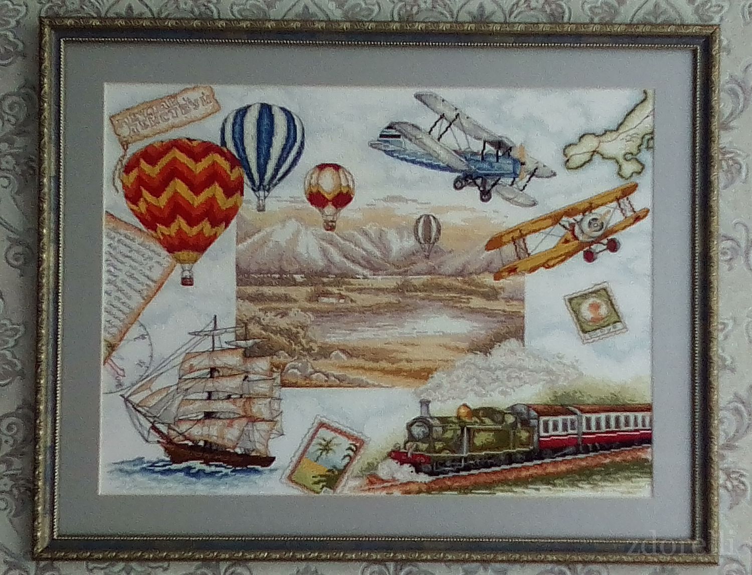 25 октября 2019 Опять здравствуйте! Моя третья работа для конкурса - "Ветер странствий" ("Белоснежка", В-4095). Основная работа (крест и полукрест) была вышита за три месяца. Две недели ушло на бэк. Его очень много (стропы на шарах, лонжероны на самолетиках, такелаж на бригантине). Когда дело дошло до надписей, я решила, что тупо следовать схеме не буду. Вместо непонятной шкалы (как физик, честно попыталась разобраться, что за прибор на схеме) сделала часть картушки компаса. На марке центы заменила на рубли, правда, профиль королевы менять не стала. Не стала вышивать названия вокруг якобы Скандинавского полуострова (с картой не совпадает), и сами очертания не стала делать. Попыталась разобрать, что же написано на открытке - вверх ногами по-английски, да ещё и вкривь-вкось, из всех кусочков слов разобрала только "to". Решила, нет уж, напишу-ка я, во-первых, по-русски, во-вторых, словно это письмо от дочки-путешественницы (она очень легка на подъем и готова "в космос просто пешею уйти"). Есть у неё давняя, ещё со школы, мечта побывать на "Краю Света". Это вполне реальная скала на острове Шикотан, откуда виден бескрайний Тихий океан. При её неуемной энергии и фантазии, я уверена, это когда-нибудь случится. Поэтому я и вышила письмо, которое она, может быть, напишет мне оттуда. И девиз работы вместо безликого "TRАVEL" сделала "Мечтай и действуй". Работу окончила еще в ноябре 2018, а вот оформила только летом 2019, как подарок дочке на День Рожденья. Она сначала хотела строгий вариант оформления, без завитушек и паспарту, просто рамку, но дизайнер смогла подобрать такое чудное сочетание багета и серебристого паспарту, что переубеждать не пришлось. Работа покрыта музейным стеклом, так что с любого ракурса детально видны каждый сюжет, каждая буковка. махно, Iharu, ss-kostenko и 126 других сказали спасибо Поделиться сообщением Ссылка на сообщение