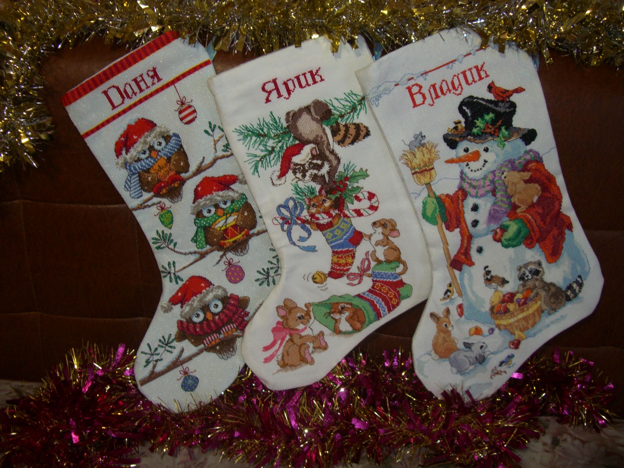 25 октября 2019 Добрый день всем! Решилась тоже принять участие с новогодними носочками для моих младших сыновей Носочек с совятами - дизайн Дименшенс подбором - вышивала уже второй раз, носочек с енотом и другими зверятами - очень давно снятый с производства дизайн Дименшенс, вышит тоже подбором, а носочек со снеговиком вышит по оригинальному набору Буцилла, только канва заменена. Огромное удовольствие получила от работы над этими дизайнами, обожаю милых зверяток! Дети ждут не дождутся уже, когда выпадет снег, будет поставлена ёлочка и повесим носочки для подарков))) Хозяйка смешных зверей, yustik, Gala83 и 144 других сказали спасибо Поделиться сообщением Ссылка на сообщение