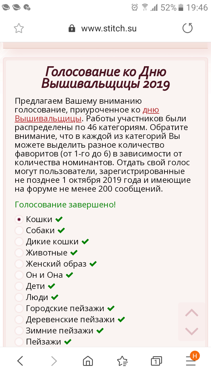 17 ноября 2019 3 минуты назад, Татуся сказал(а): Возле каждой категории слева стоит кружочек - нажмите его - определится категория и прокрутите страницу вниз - увидите победителей категории. Получилось, только оказывается надо тыкать на саму строчку с категорией, а не на кружочек. А я всё это время по кружкам долбила. Ушла любоваться. Татуся и Oksana7 сказали спасибо Поделиться сообщением Ссылка на сообщение