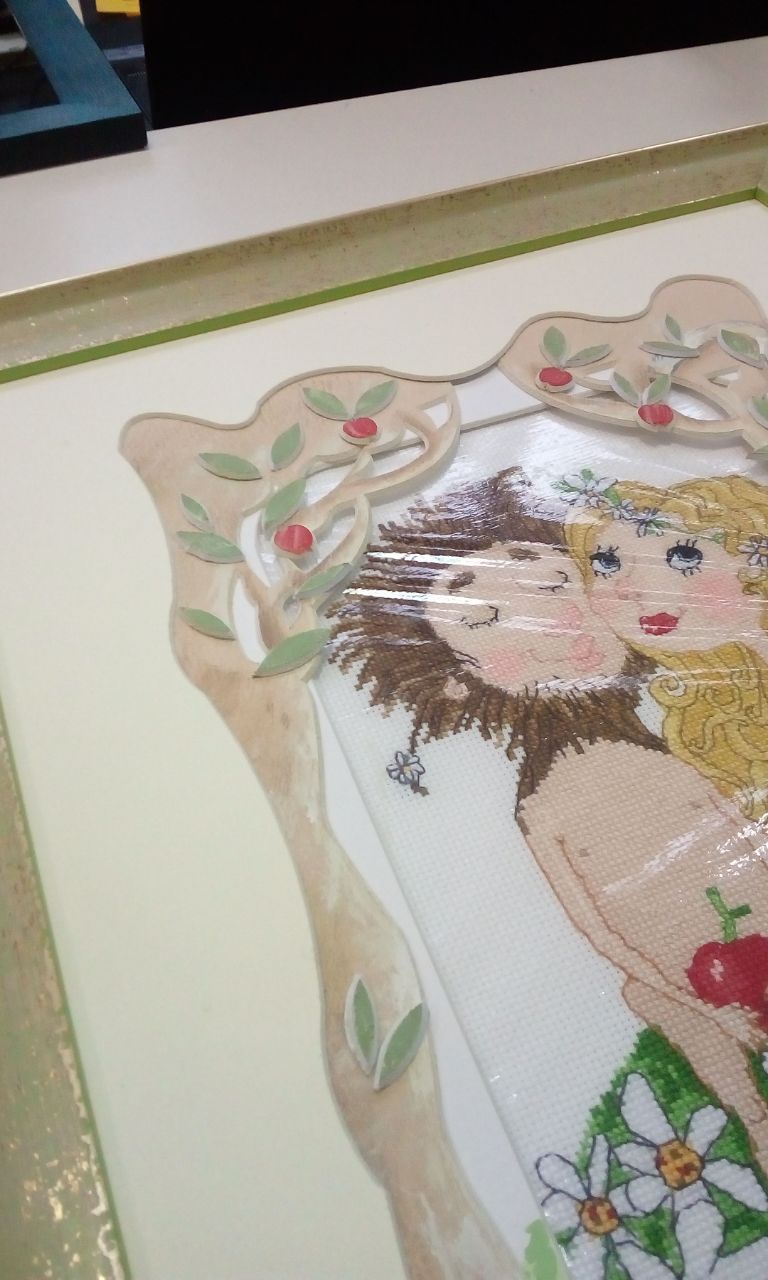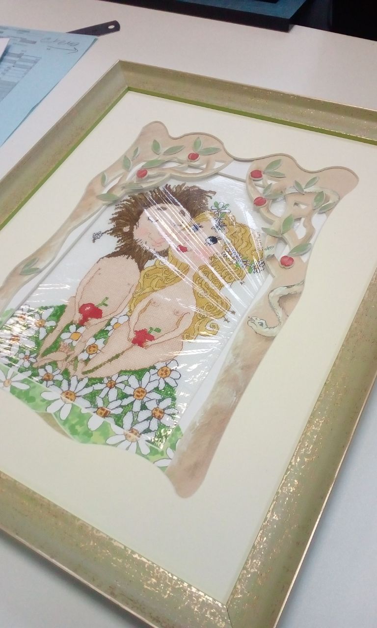 2 декабря 2017 Светлана, Катюша, Наталья, спасибо за Ваше внимание к моим вышивкам. Вот уже 3 недели, как я работаю на новом месте. Прихожу вечером домой и мне совершенно не хочется вышивать. Со мной такое впервые. В выходные дни заставляю себя в руки взять иголочку и немножко поковыряться. Гобелен вообще отложила в сторону, а вот сапожок чуть-чуть поковыряла, буду переставлять пяльца. Нитки яркие, каждая деталь оформляется бэком. Специально сделала несколько фоточек. Скоро у подруги день рождения, оформила филина. Вначале был выбран совершенно не такой паспарту, но мне позвонили из банкетки, что такой паспарту закончился, я ездила снова в багетку и выбрала другой. Итальянский багет, слип и паспарту: вот и приоделся филин. Надеюсь, что подружке картина понравится. В галерею выложу другое фото, муж обещал с фотоаппарата щёлкнуть, а я для Вас с телефона фотки выложу. А ещё мне оформили моих библейских героев: Адама и Еву. Оформляли в багетной мастерской " Багет Корсет". Фотки пока оттуда, картину ещё не получила, но жду. Очень мне нравится змей- искуситель.., да и вообще оформление. С резным паспарту ни разу не оформляла, очень хочется взглянуть в живую и оценить. Вот и все новости на сегодня. Жду Ваших мнений насчёт оформленных картин. ЛАДОМИРА, Veta, Пушистая и 8 других сказали спасибо Поделиться сообщением Ссылка на сообщение