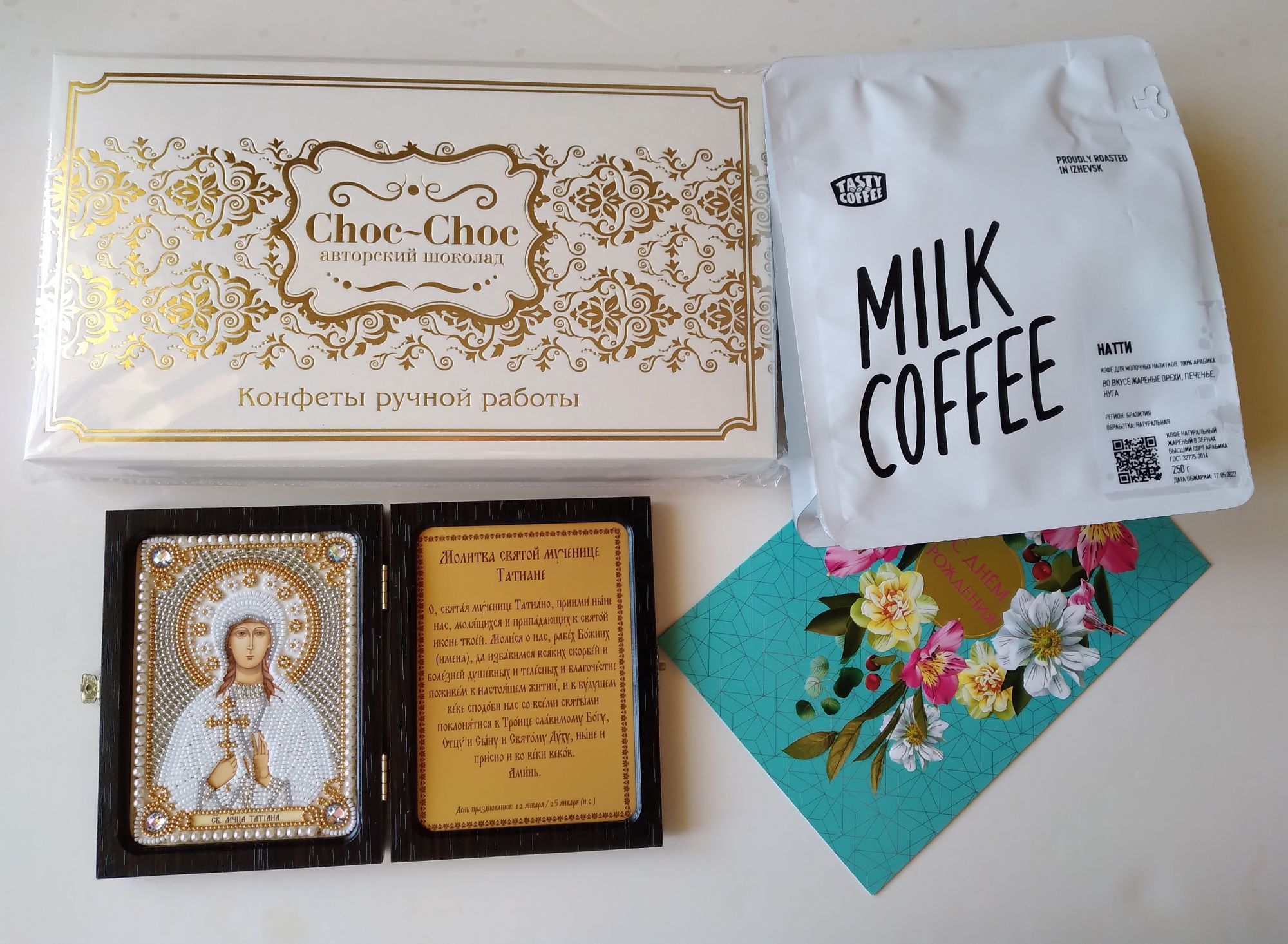29 июня 2022 2 часа назад, Tatiana2406 сказал(а): Девочки, здравствуйте! Хочу еще раз поблагодарить всех-всех-всех за поздравления! Спасибо за внимание и теплоту! Я тронута, очень приятно. Праздник у меня начался с сюрприза, с посылки, которая пришла из Рязани от Леночки @lenning. В ней была трогательная открытка-поздравление от руки, набор конфет ручной работы, душистый кофе в зернах и... я обомлела! Икона святой мученицы Татьяны с молитвой, вышитая бисером для меня руками Лены! Икона красоты и нежности невероятной, как будто расшита жемчугом! Её покажу вам отдельно . Я давно хотела такую икону для себя, но мне трудно (из-за спины) вышивать бисером. Вышив 3 иконы - две для детей и одну для крестника, я решила: все, для себя уже не буду. Леночка это прочувствовала и вышила для меня! Это так неожиданно и так легло на душу, так порадовало и тронуло, что я мысленно до сих пор держу этот образ в голове, что бы я ни делала. Леночка, спасибо огромное! Но на этом радостное удивление от сюрприза Лены не закончилось. Конфеты я сразу не открывала, а решила открыть спустя несколько дней, в воскресенье, когда у меня собрались все мои. Открыли - и обомлели! Вот какие конфеты там были: Это было так душевно, так приятно! Хорошо, что успела сфотографировать. Правда, вкусные конфеты вокруг ели, но имя не тронули, до сих пор цело))). Леночка, дорогая, не подберу слов! К тому же агентство Синьхуа мне на ушко шепнуло, что на этом сюрпризы для меня не закончились, и праздник еще будет продолжен, он будет растянут! Но об одном и "будущих" сюрпризов я не могу не написать. Мы все понимаем, как сейчас тяжело нашей Галочке @махно. Она пока не может отправить посылку. Но в трудное время Галочка сделала для меня такое... потому что руки золотые и сердце золотое. Она прислала мне фотографию того, что, надеюсь скоро, пришлет мне. Просто посмотрите на эту красоту: . Моделью согласилась побыть прелестная дочь двоюродного брата Гали. Какой цвет, какая нежность, мягкость и воздушность! А какая девчушка! И этот палантин я уже ощущаю на себе, он мысленно меня охватывает и согревает теплом Галиных рук! Спасибо тебе дорогая! И я молю, чтобы как можно скорее наступило для Галочки то время, когда можно было бы жить в нормальном режиме, а я смогу подержать в руках, накрыться и сфотографировать этот палантин еще раз во всей красе! Галочка, ты понимаешь мои эмоции! Девочки, дорогие, я уже об этом не раз писала, но не устаю повторять! Вы такие все невероятные, что рядом с вами я становлюсь лучше! Я это ощущаю в себе! Это не красивые слова, это правда. Спасибо за дружбу! Ну и себя, любимую, я не оставила без подарка. К первой из приобретенных мною схем я получила заказ с нитками и канвой. Нитки китайские, синтетические СХС, аналог ДМС. Из 58 цветов не было только одного. Этот номер я прикупила в Леонардо, на один моточек ДМС раскошелилась. Там же сравнила цвета купленных СХС и ДМС на стенде магазина. Совпадение хорошее. Из 57 цветов немного отличались только 12, да и то просто чуть светлее тоном, и два номера немного цветом, Один чуть золотистее, другой чуть серее. Для вышивки пейзажей (да и цветов) думаю СХС вполне могут заменить ДМС. Какие они в работе - покажет опыт. Канву выбрала 16 каунта. Хотела 18, поменьше размер картины, но пишут, что нитки СХС чуть толще ДМС и 18 каунт мелковат для них. Да к тому же схема сложная, дело новое, лучше не мельчит