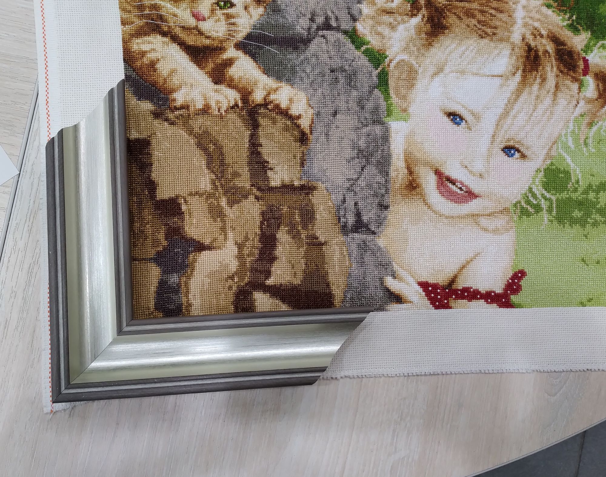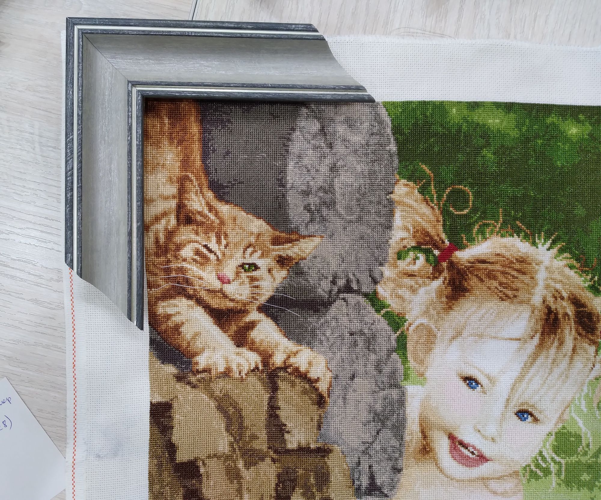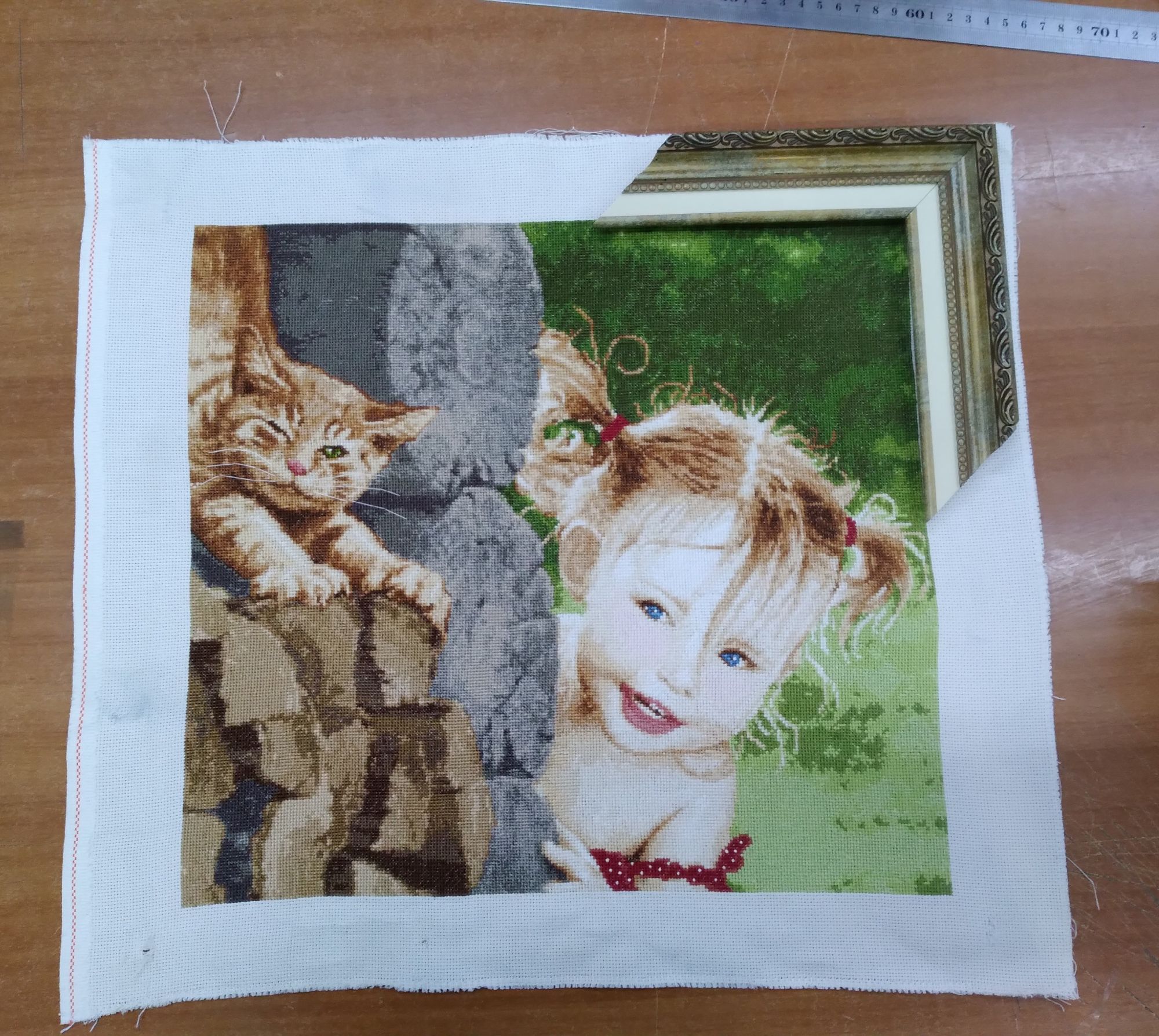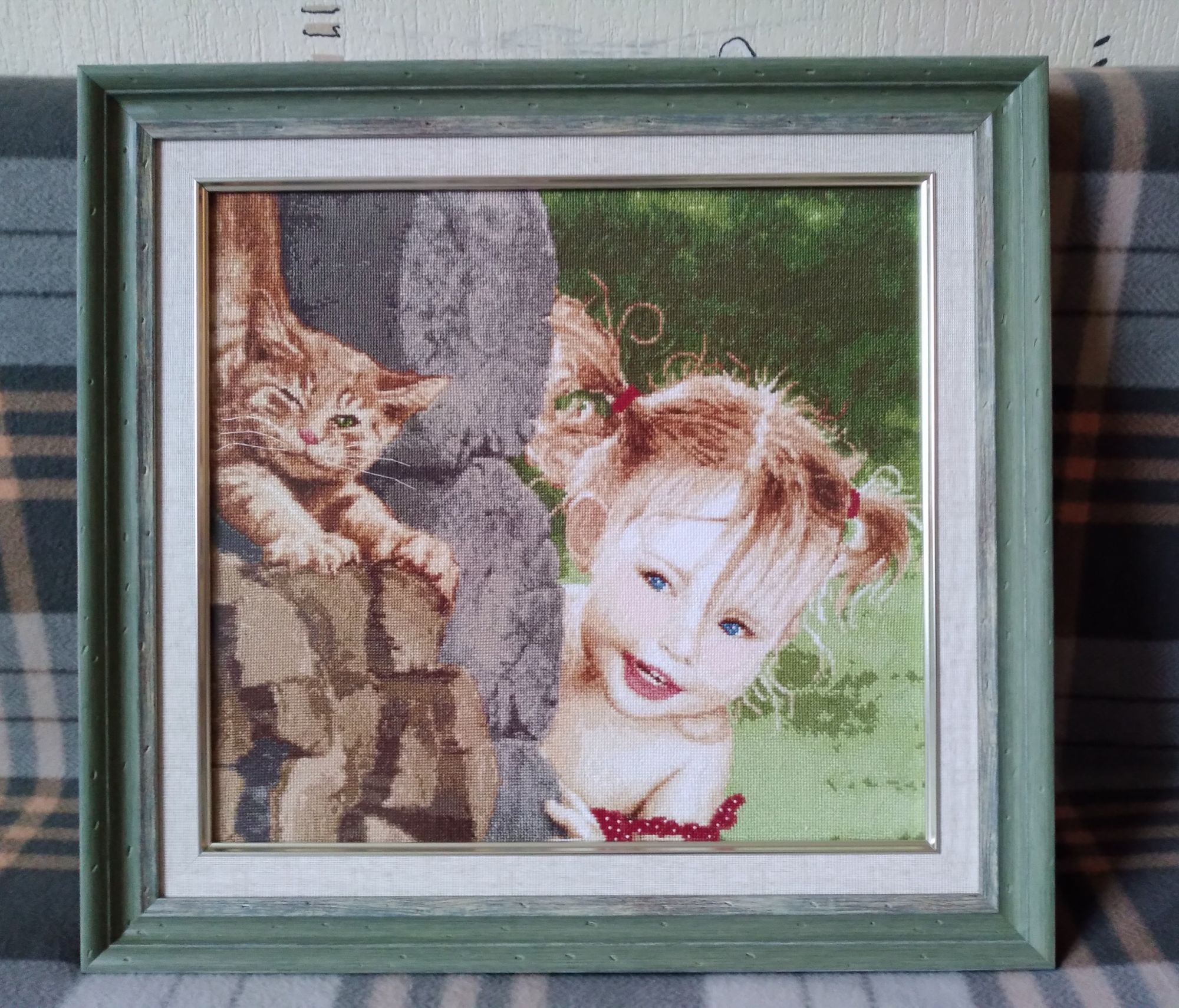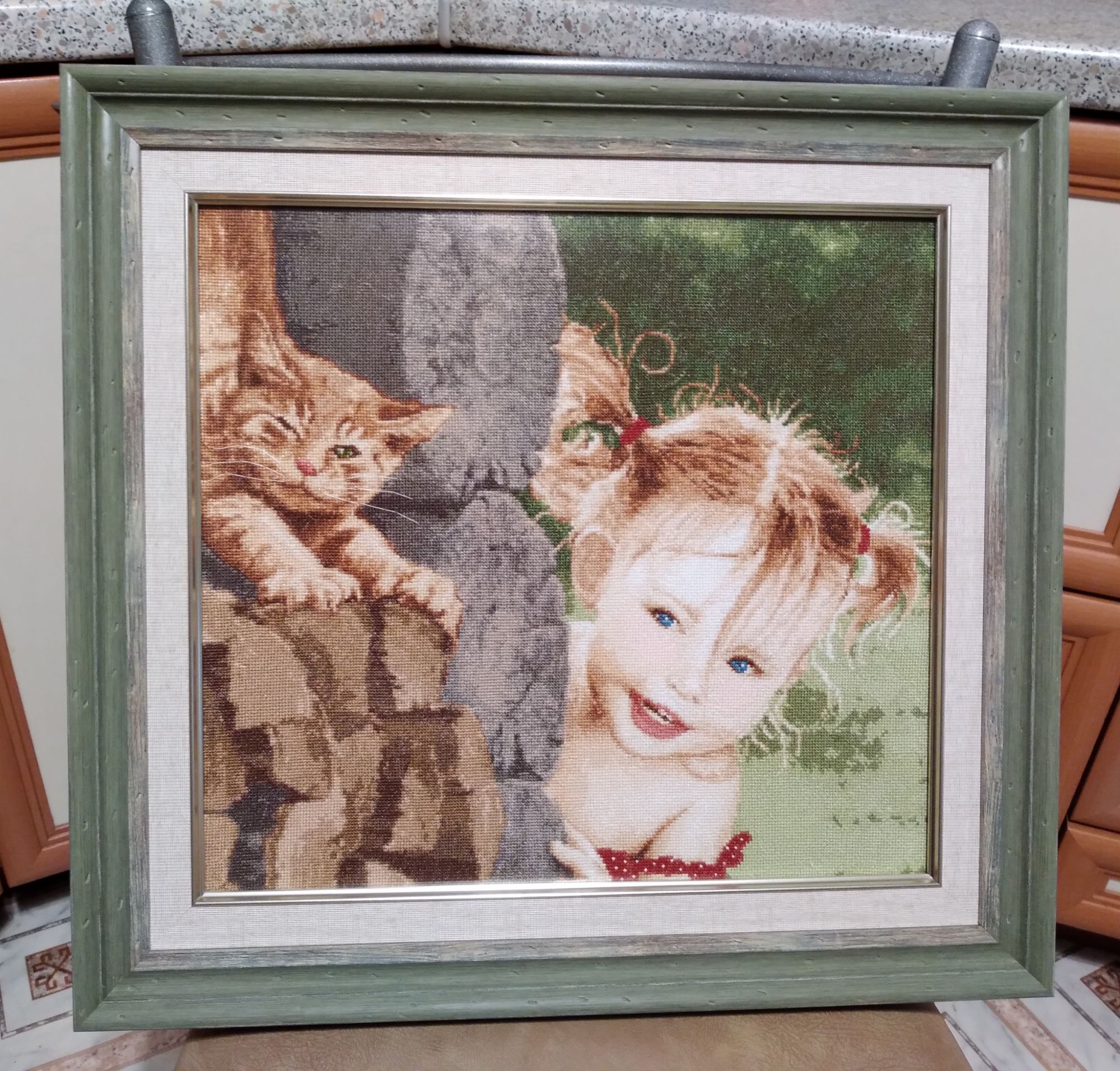 21 сентября 2022 Девочки, здравствуйте! Одела я свою озорницу. Совесем не так, как задумывалось и не так, как показывала вам. Но это неважно, так как итоговый результат мне понравился. Он немного тяжеловат и зеленоват, но зато такой деревенский и совсем не отвлекает от девчушки и кота. Камера "синюшит", не берет цвет багета, он гораздо теплее и гармоничнее. А встроенное паспарту совсем не серое, а цвета и фактуры льняной канвы или равномерки. Сделала множество фото при разном освещении, всё не то. В реалии теплее, гармоничнее и конечно ярче. Но главное не как на фото, а как на стене, и я довольна. Висит на временном месте и радует. Прямо сейчас перед моими глазами. Смотрю и улыбаюсь. Аринесса , nata2017, Fascinata и 14 других сказали спасибо Поделиться сообщением Ссылка на сообщение