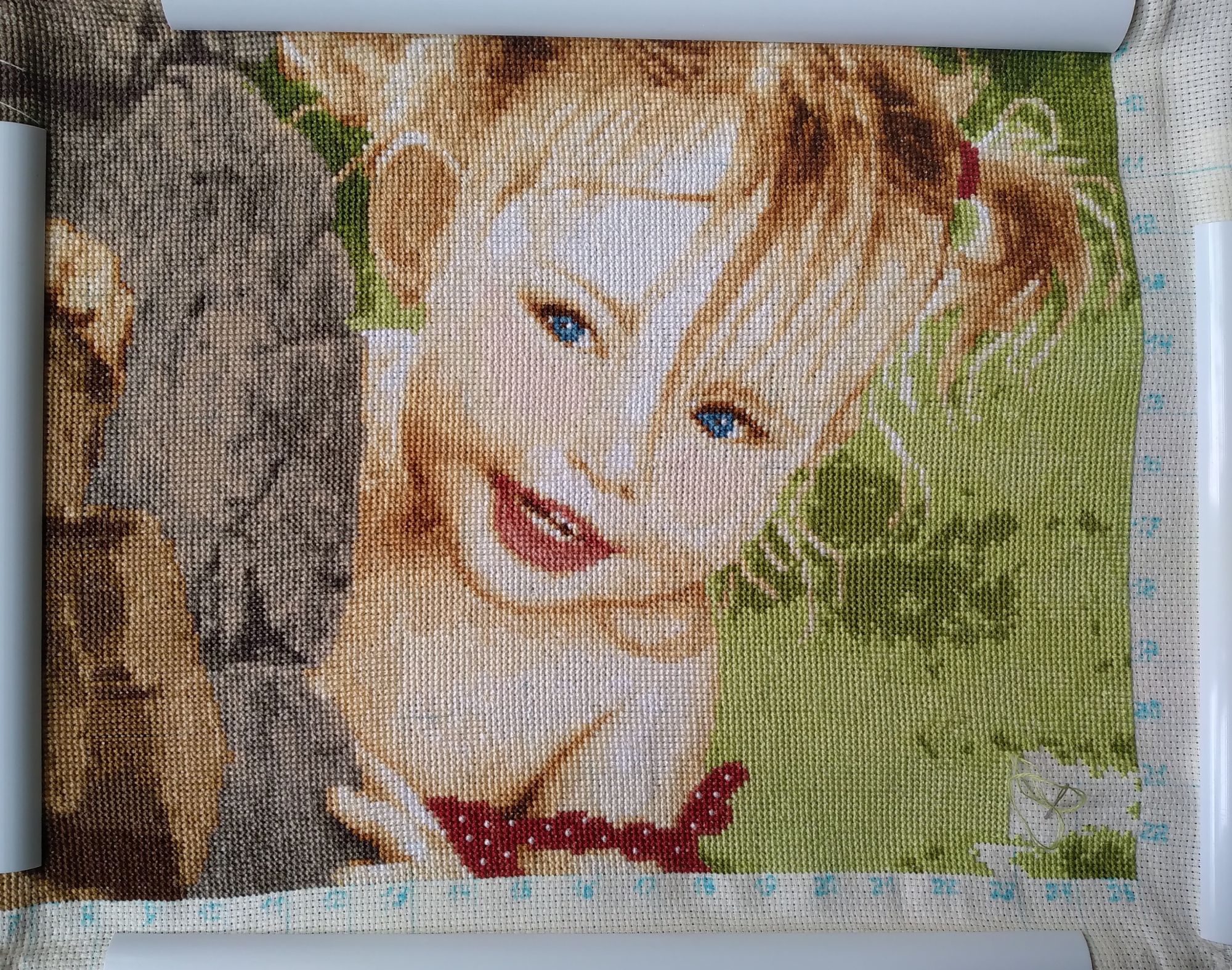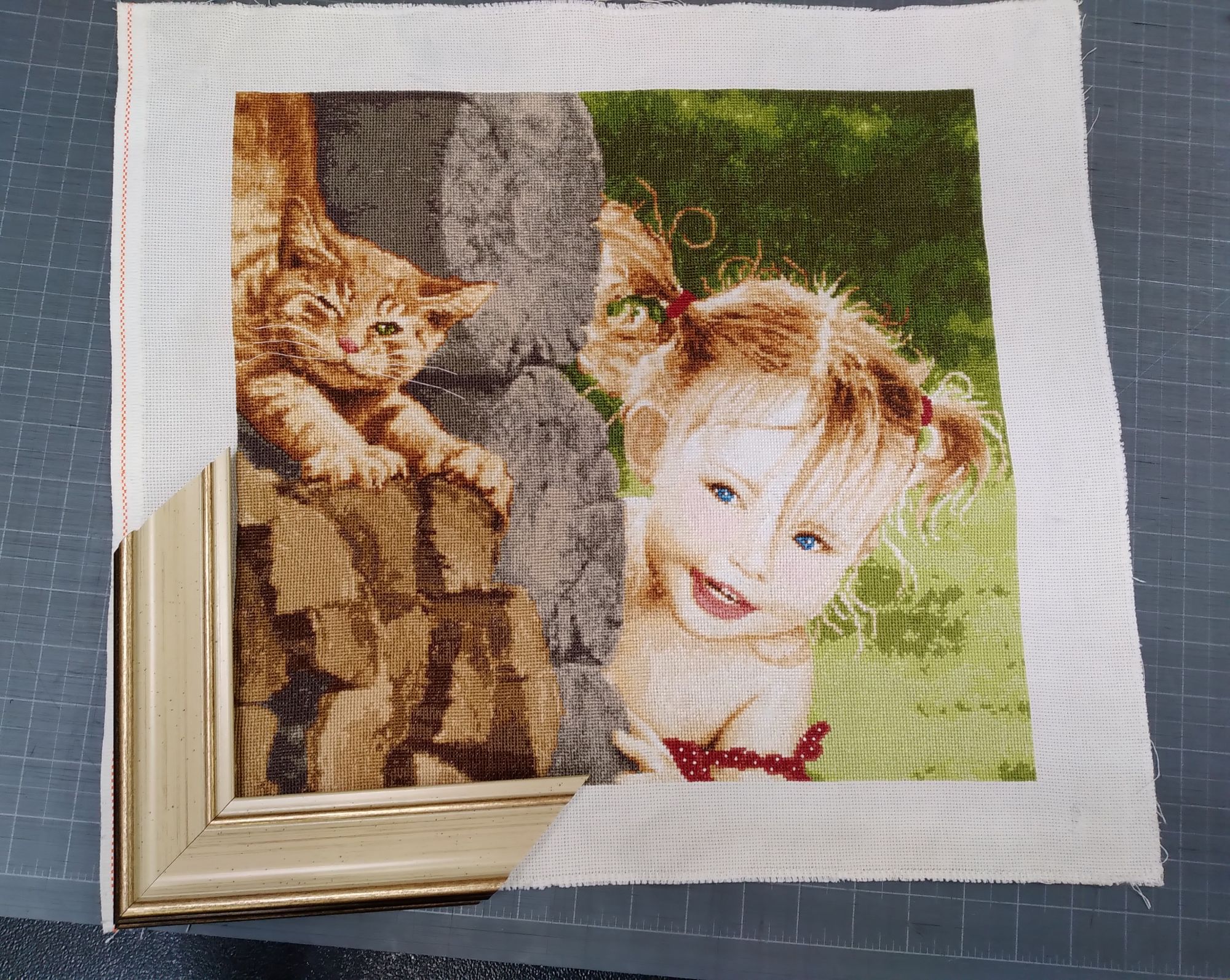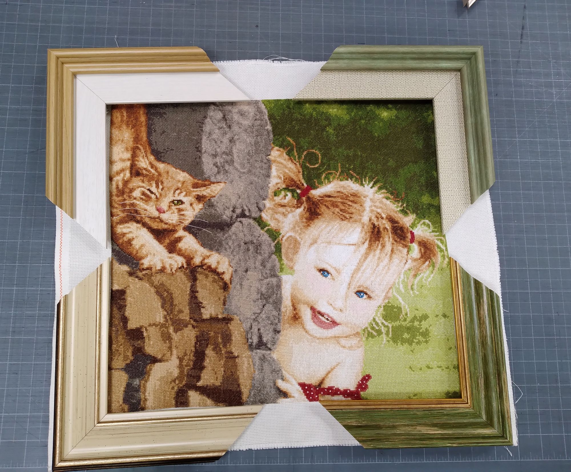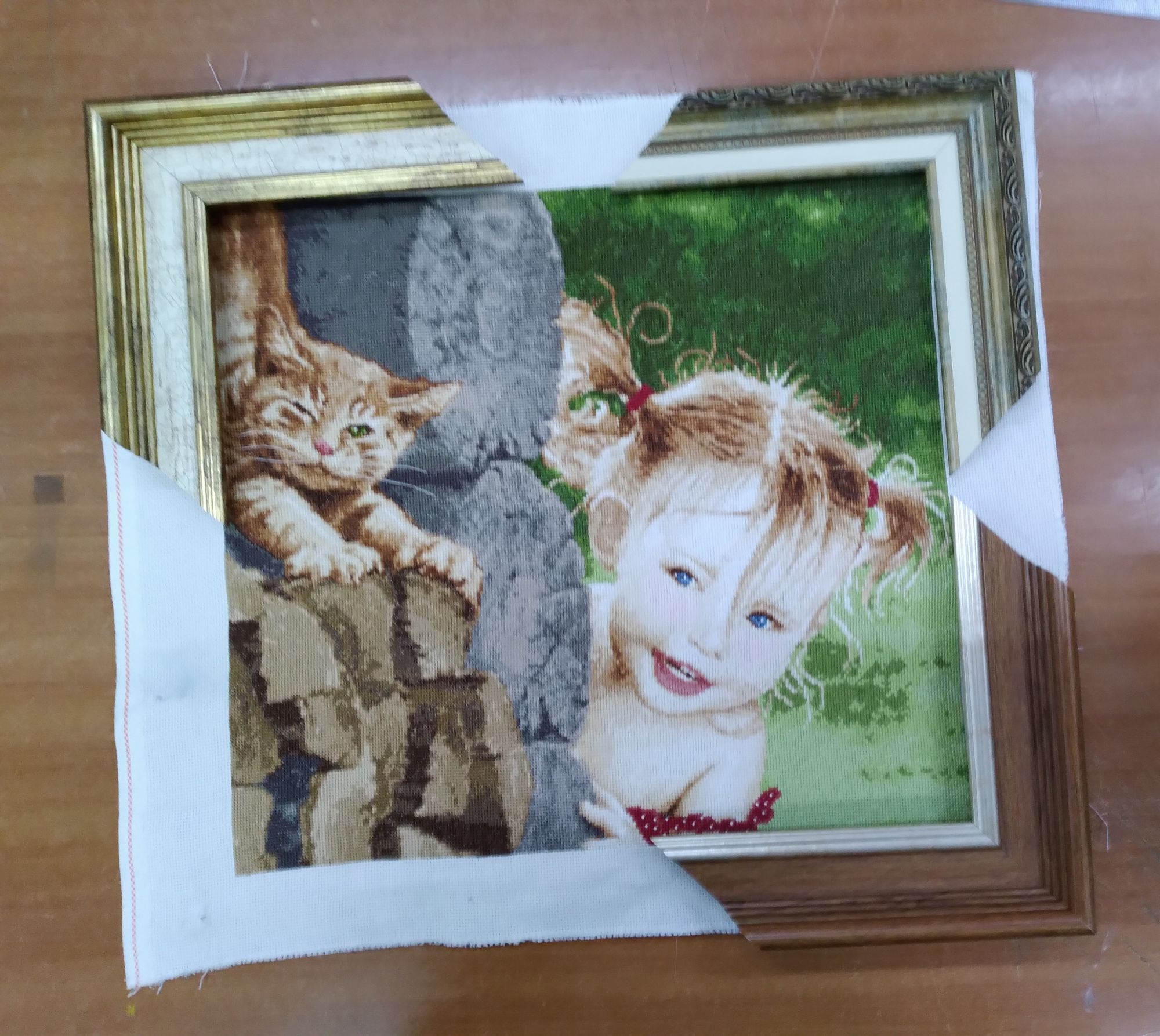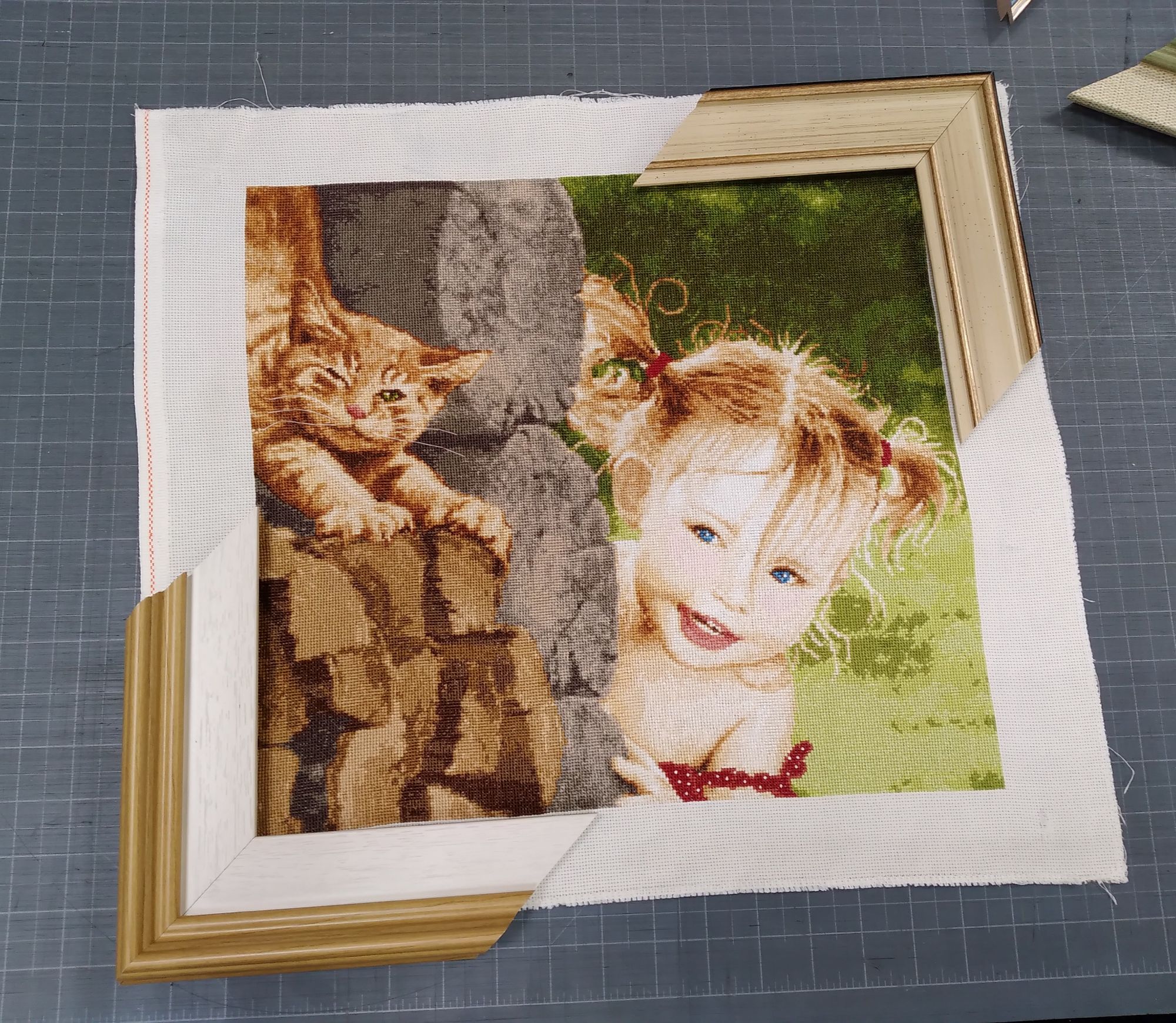 21 сентября 2022 Девочки, здравствуйте! Одела я свою озорницу. Совесем не так, как задумывалось и не так, как показывала вам. Но это неважно, так как итоговый результат мне понравился. Он немного тяжеловат и зеленоват, но зато такой деревенский и совсем не отвлекает от девчушки и кота. Камера "синюшит", не берет цвет багета, он гораздо теплее и гармоничнее. А встроенное паспарту совсем не серое, а цвета и фактуры льняной канвы или равномерки. Сделала множество фото при разном освещении, всё не то. В реалии теплее, гармоничнее и конечно ярче. Но главное не как на фото, а как на стене, и я довольна. Висит на временном месте и радует. Прямо сейчас перед моими глазами. Смотрю и улыбаюсь. Аринесса , nata2017, Fascinata и 14 других сказали спасибо Поделиться сообщением Ссылка на сообщение