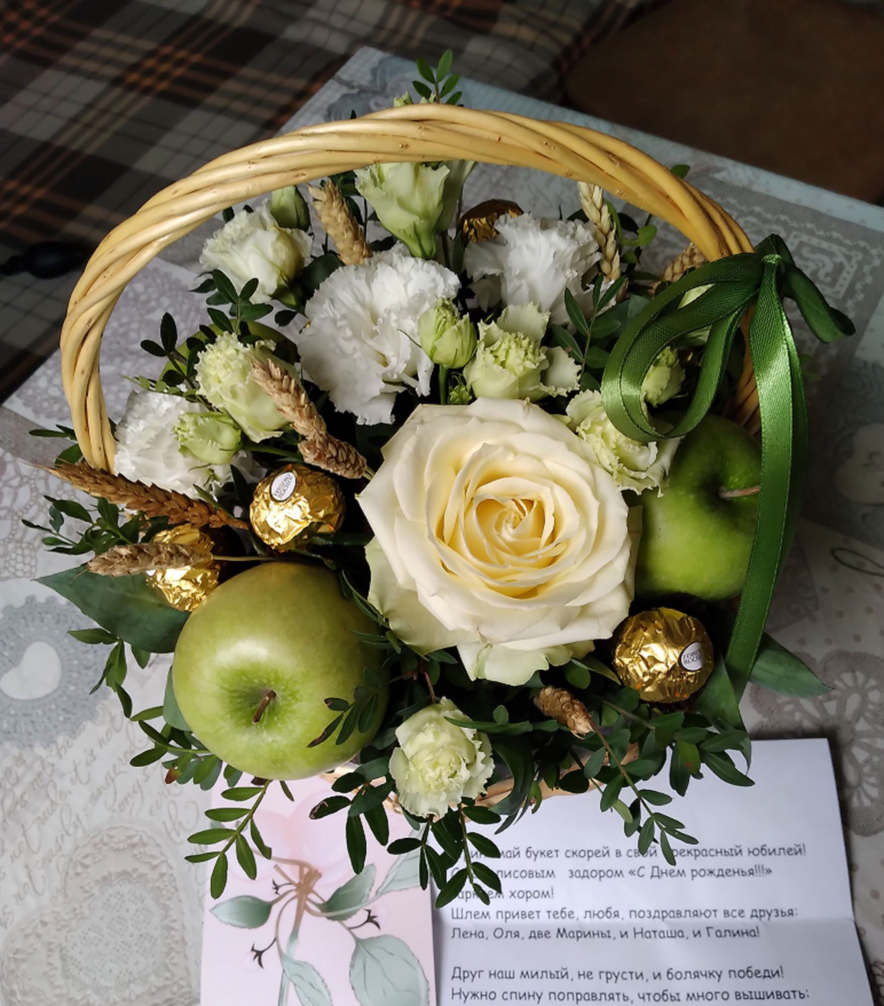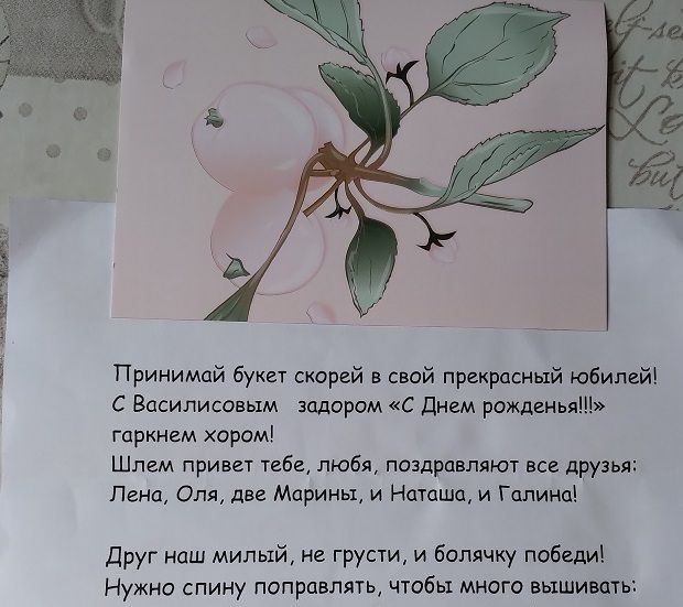 29 августа 2023 10.07.2023 в 20:17, Tatiana2406 сказал(а): Девочки, здравствуйте! Долго ничего не писала, такие были обстоятельства. Но сейчас стряхиваю пыль со своей темы. Прежде всего хочу еще раз поблагодарить девочек за поздравления, хотя ответила каждой. Спасибо всем-всем-всем за такие замечательные, теплые пожелания! Я очень тронута! Июнь прошел у меня в полном соответствии с выражением "если хочешь насмешить бога, сообщи ему о своих планах". Я очень много и с удовольствием писала о проведении половины лета за городом с внучкой, но все накрылось медным тазом. Внучка в начале июня поехала на недельку к подруге в семью своих крестных, а потом приболела я. К тому же прямо на мой день рождения дочь уехала в командировку и семейное празднование отложилось на неделю. Так что я все это время просидела в Москве и лечилась. Но именно день рождения вопреки обстоятельствам получился для меня замечательным. Сидя дома я получила по телефону огромное количество поздравлений, в том числе и от наших девочек, не успевала перезаряжать смартфон. Но меня ждали и сюрпризы. С утречка - неожиданный приход курьера с букетом в корзинке. Когда я поняла, от кого, от эмоций слезы навернулись у меня на глазах. Это же мои дорогие Василисы - Наташенька @Lorans, Мариночка @mag, Мариночка @Tata44, Леночка @lenning, Галочка @махно и Олечка @Fascinata! Они же не могут без сюрпризов, прислали такой замечательный цветочно-фруктово-сладкий букет и веселые поздравительные стихи: Девочки мои дорогие, спасибо за этот праздник! Так можете только вы! А через день ко мне зашла ангельский посланник-Олечка с поздравлениями от вас. Спасибо, мои хорошие, за осуществление моей давней и очень личной мечты и за спонсорское участие в оформлении моих работ, о котором я напишу ниже. И в очередной раз хочу написать о главном в этой связи. В таком "достойном" возрасте мне судьба подарила таких друзей! Казалось бы, все уже в жизни определилось и так не бывает. Бывает!!! Вот это подарок судьбы! Дорогие мои я благодарю вас за дружбу! Я вас обожаю! И еще хочется написать. С некоторыми девочками общаюсь тесно, с некоторыми поменьше, некоторых знаю по обсуждениям в разных темах , не всегда могу писать, иногда просто спасибкаю, не в состоянии ко всем заходить в гости. Но очень многих знаю, сразу узнаю по никам и аватаркам и рада любому, пусть даже непрямому общению. Без вас, без форума не мыслю своей жизни. А неделю спустя было продолжение праздника. Семейное. За городом у сына собрались все мои самые-самые - дочь, зять, внучка, сын, сноха и бабушка снохи. Было замечательно, очень тепло и по-семейному. Очень долго пытались на автомате сделать общее фото, сын пристраивал телефон, много раз бегал от телефона к общей команде, чтобы до автоматического щелчка успеть самому пристроиться. Худо-бедно что-то получилось Для понимания где кто - сын в красной футболке, дочь рыженькая . Внучке Машеньке накануне дантисты сделали операцию на десне, правая щека была сильно раздута и она тщательно пыталась прикрыть ее волосами. Но молодец, никому не показала, что ей больно. А мне подарила футболку с шикарной надписью (где она только такое отыскала). Я тут же её надела, скинув праздничную кофту, и так и не снимала Молодежь все застолье организовала сама, не подпустив нас, старших, мол "ваши места в зрительном зале". Мы не очень возражали. Было весело, вкусно, по-дачно