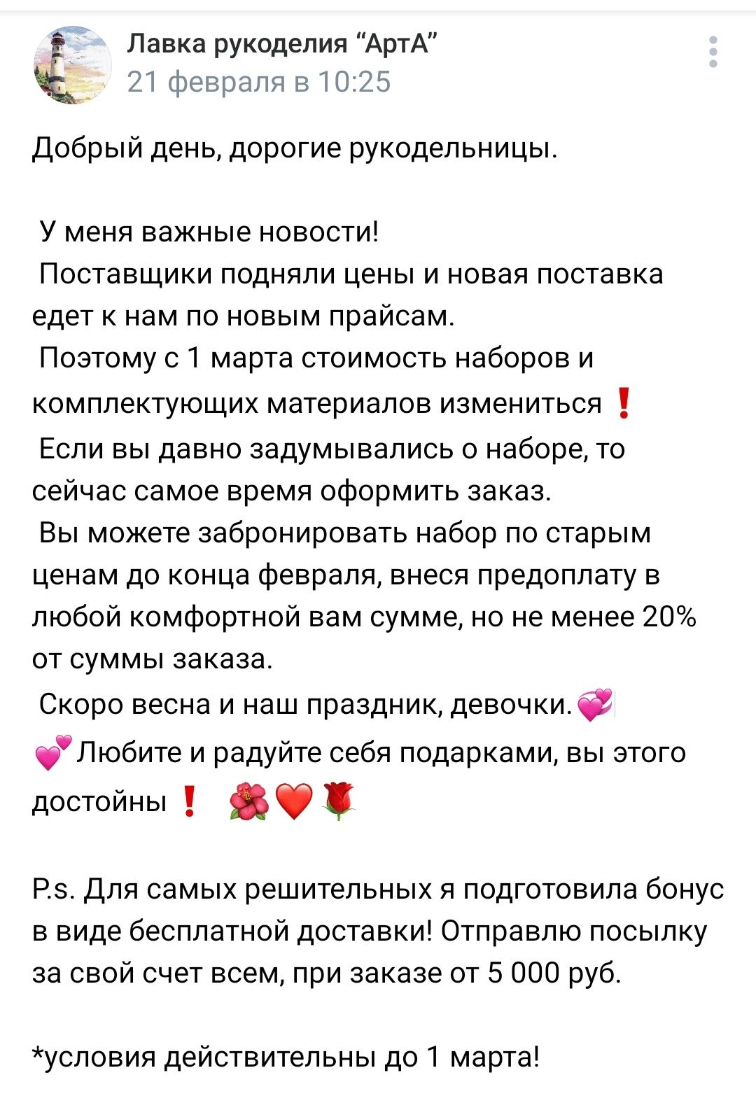 26 февраля 2022 Красавицы! У кого большие проекты в ДМС рекомендую срочно заказать нарезку! Читаю новости - некоторые дизайнеры вообще закрывают сборку своих наборов в ДМС, группы по нарезке поднимают цены с 01 марта, моя подруга пошла подзакупить два моточка в рукодельный у дома - многие магазины уже ценник задрали, за один моток отдала 100 руб ! Я срочно списываюсь у кого взять ещё по адекватной (пусть хоть бы 56 руб за моток) нарезку на свой натюрморт и айву Волковой (мечты должны сбываться). Сняла с продажи на Юле все наборы. Заказала тканей под три маленьких и один сравнительно большой проект на шелковой нити. Уже спрятала в комод икону Теи. Успела её купить, успела по нормальной цене. Радуюсь, что очень вовремя старую коляску продала и могу всё покрыть деньгами с продажи,уйдя хотя бы в ноль. Сейчас санкции пойдут жёстче и жёстче, так что я думаю потом начать целенаправленно смотреть на многоцветки Надимы в пнк Кирова. 19199707770, AnnaMarie, Betta и 6 других сказали спасибо Поделиться сообщением Ссылка на сообщение