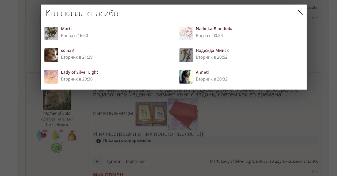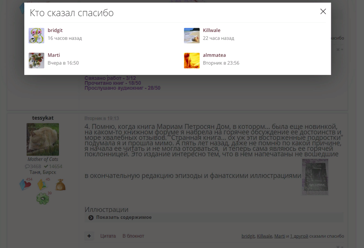 4 июня 2020 Только что, Marti сказал(а): Таня, выбор книг-полный восторг И это издание Остин у меня тоже есть Оно прелестно и погружает в ту эпоху! А Дом... это дом. Читала и наслаждалась. На днях вновь перечитала любимую цитату оттуда. Мечтаю приобрести домой. Сомневаюсь, так как вряд ли буду перечитывать, поэтому в сметении. Это книга во мне и часть меня. Вика, да, твоя правда они прелестны, и оформление замечательно дополняет содержание))) для меня Дом... тоже в какой то мере стал частью меня, настолько сильно эта книга на меня подействовала а начет покупки - раньше у меня были траты только на одно хобби - чтение, и я покупала порой книги, с мыслью "ну может прочитаю когда-нибудь", а сейчас еще на вышивку и вязание есть траты, и покупка книг стала более осознанной, покупаю только самые-самые "хочушки" мне кажется, если есть сомнения стоит ли покупать Дом... , то лучше дать себе время взвесить и решить, а надо ли)))))) tamara.34, Killwale, Marti и 7 других сказали спасибо Поделиться сообщением Ссылка на сообщение
