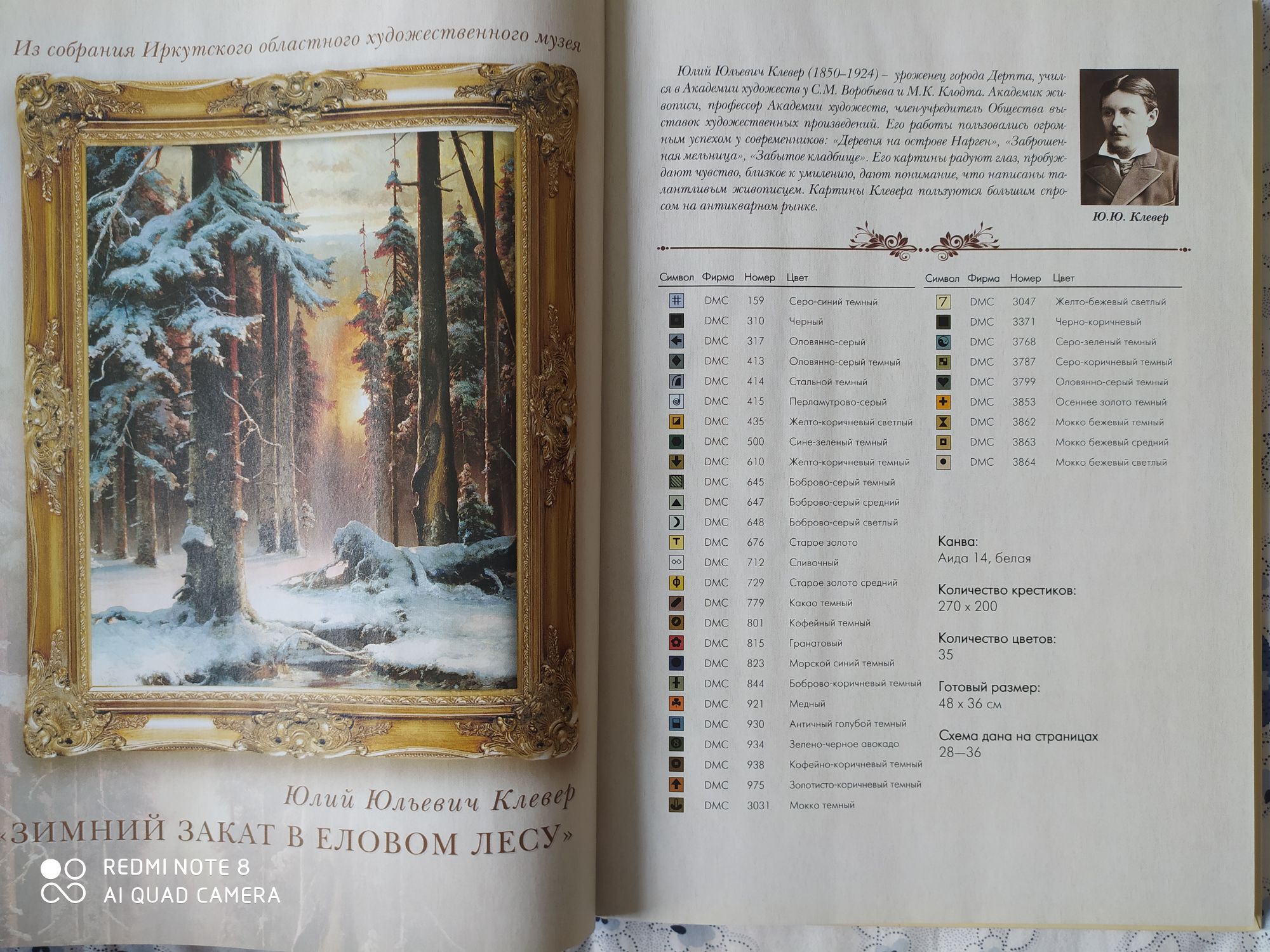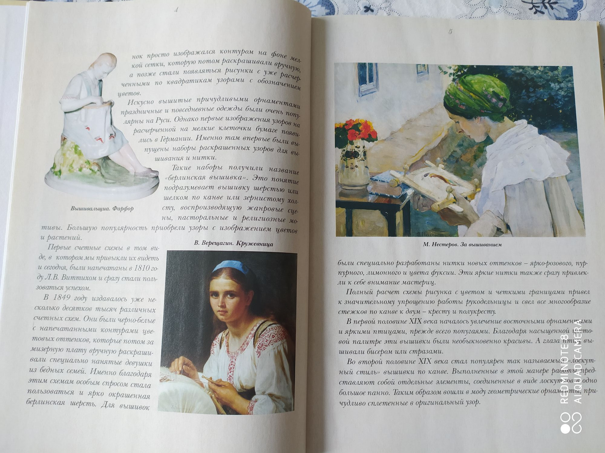 14 июня 2020 Вышивальная библиотека С большим удовольствием показываю книгу "Вышитые шедевры русской живописи" (составитель и автор схем А. Григорьева) Великолепное издание в твердой обложке (страницы А4, размер по переплету, соответственно, больше) – прекрасный образец от Белого города, отпечатанный в Италии. Содержит раздел "Из истории вышивки": А также советы и репродукции картин с аннотациями: Отшивы по этой книге я видела практически все (в интернете, конечно), они очень хороши, на мой вкус. Исходя из ключа, они вполне реальны, размеры вышивок тоже вполне нормальные: свыше 400 крестиков по большой стороне только у одной картины, остальные в пределах 250–300. А вот, собственно, из-за чего мною эта книга приобреталась))): Схемы вынесены в отдельный раздел, снабженный пунктиром с ножницами вплотную к корешку (интересно, найдётся ли вандал, способный вырезать страницы из такого издания?) Ну, и кусочек схемы: Ксен40, Killwale, Selenia и 14 других сказали спасибо Поделиться сообщением Ссылка на сообщение