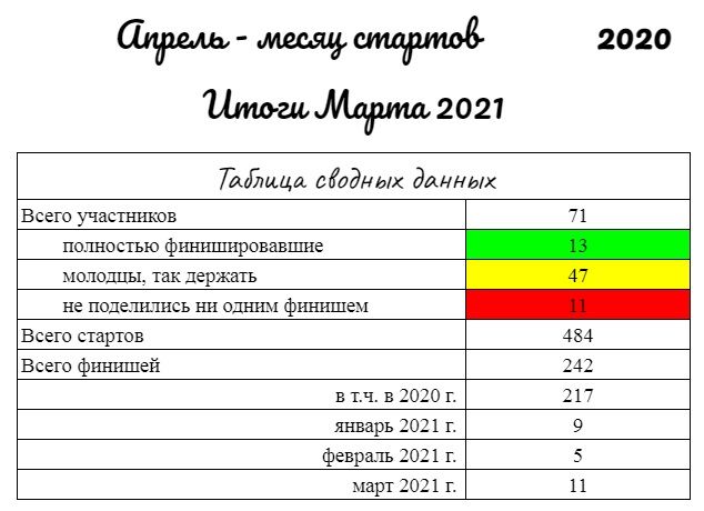 31 марта 2021 Первая годовщина! Время так быстро пролетело, и вот мы уже на пороге нового месяца стартов. Накануне прекрасного весеннего месяца Апреля давайте подведем итоги Что мы успели натворить и навытворять за год? Новость №1 - Мы находимся ровно на экваторе 242 финиша из 484 стартов - красиво, не правда ли? 1. Участники: - 13 участников, полностью завершивших все старты - 16 участников, у которых остался всего 1 незавершенный старт - 23 участника, у которых осталось 2-3 незавершенных стартов - 19 участников, у которых осталось 4 и более незавершенных стартов 2. Процессы: - за 2020 год было 217 финишей - за 1 квартал 2021 года - 25 финишей Ровно за год мы справились с 50% стартов! КРУТО! ТАК ДЕРЖАТЬ! Со второй половиной справимся за следующий год? Р.S. И хотя месяц стартов 2021 обещает вновь увлечь большинство из нас, про старты прошлых лет не забываем, да? iliariam, Сибирская Кошка, Ксен40 и 25 других сказали спасибо Поделиться сообщением Ссылка на сообщение