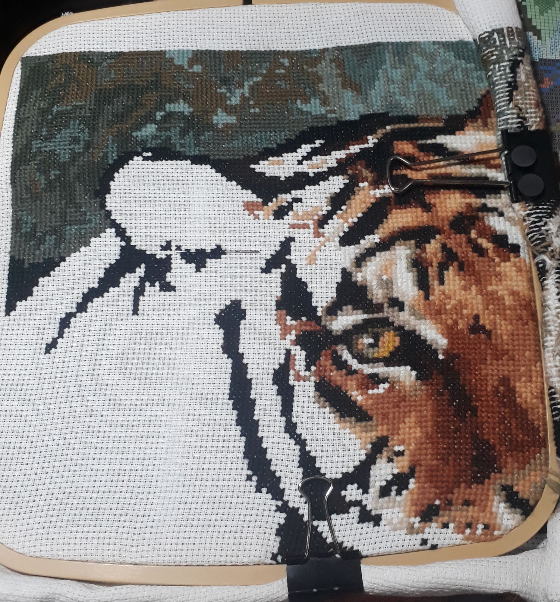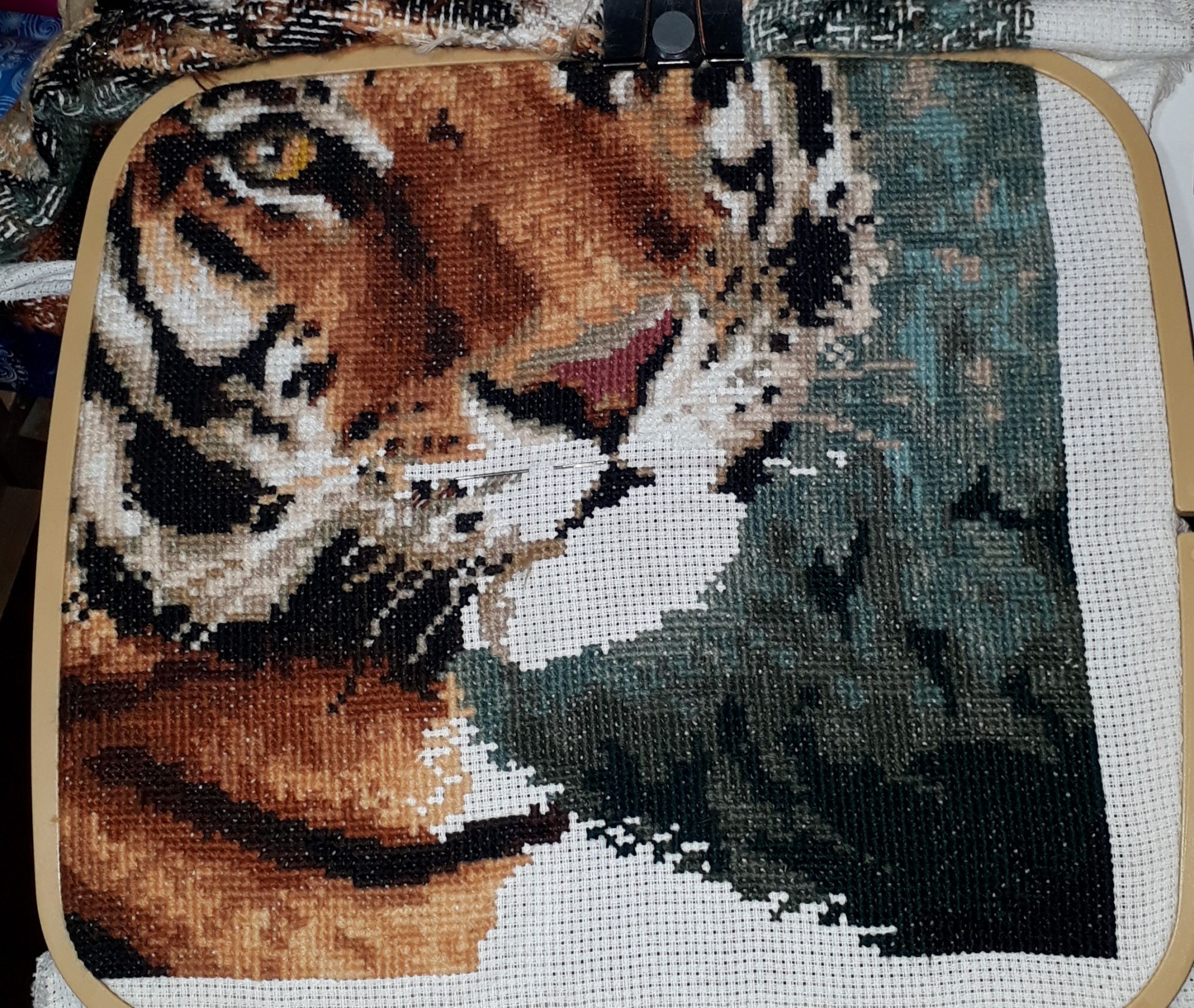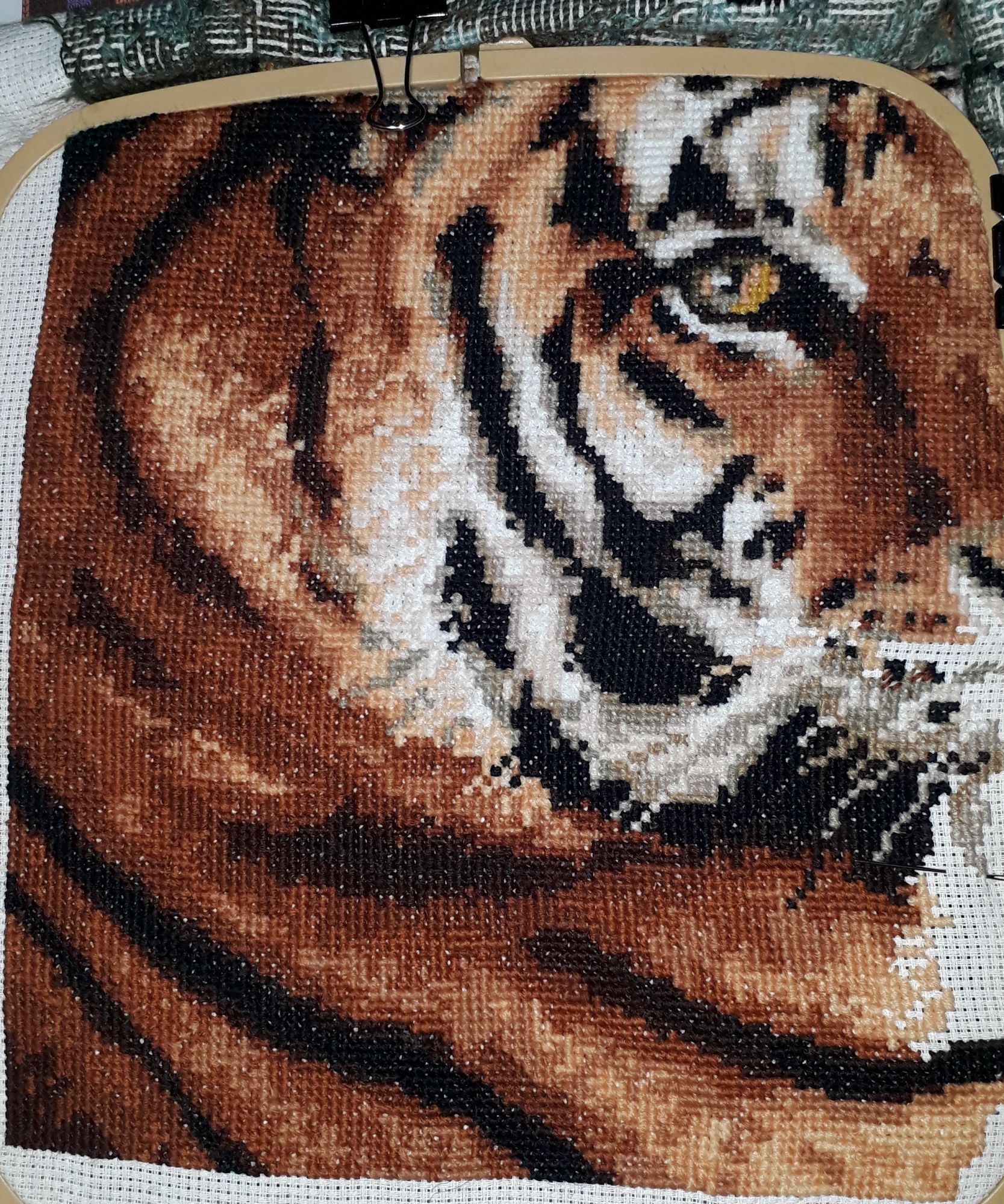 30 апреля 2022 Всем привет!!! Ну что ж, пора отчитаться. Месяц закончился, с ним закончились и тигры. Маленький от Овна уже даже оформился. Рамочка правда немного темновата, но зато тоже чуток полосатая. Стыдно признаться, но в этой малявке я аж 2 раза ошиблась. Когда ошибки обнаружила, то пороть уже было поздно, да и пороть по равномерке- то еще удовольствие. Поэтому оставила все как есть. Надеюсь, тигренок на меня не сильно обидится. Риолисовский тигр тоже закончен. Тут он пока без усов, не успела еще сфоткать. Очень хорошая проработка. Канва вроде 10, но никакой пиксельности и нечеткости. Бонусом идет повышенная плюшевость. Теперь не знаю, что с ним делать. Планировала подушку, но теперь как-то жалко... будем думать. Ну и естественно начаты новые процессы. На работе - гобелен. Коллега попросила повторить для нее голландский домик и я согласилась. Показывать здесь его не буду, он фигурирует в теме по Гобленсету. Ну а дома тоже гобелен, но не тот, что я запланировала... На этом сейчас заканчиваю, а то и так многабукоф вышло. Полли, nogres, Betta и 6 других сказали спасибо Поделиться сообщением Ссылка на сообщение