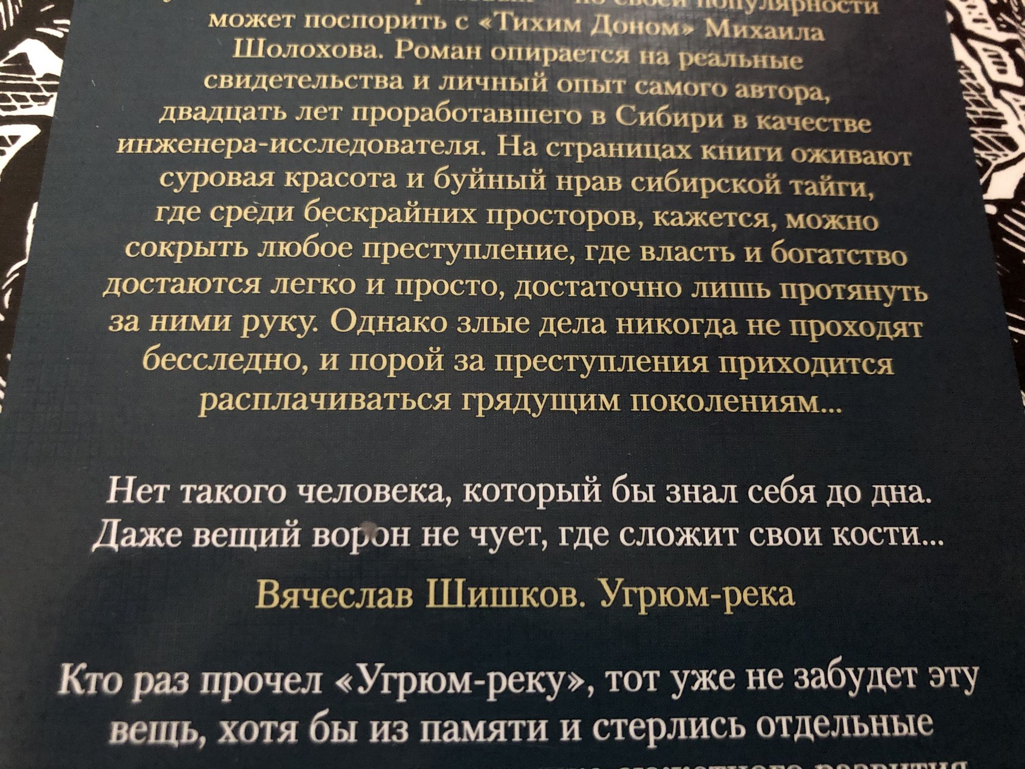 27 февраля 2021 У меня счастье . В детстве видела фильм - многие , наверняка , его знают , Угрюм река , и так давно думала прочитать эту книгу . Но как то не особо видимо думала ). И вот , спустя несколько десятилетий ) пошла вчера за батарейками в книжный ) дай думаю посмотрю , вдруг что хорошее дают , а тут она , ещё и издание такое красивое, серия Русская литература - Большие книги . Короче , читаю второй день и специально медленно, с перерывами - чтоб на подольше хватило . Нравится очень и очень . Жизненная книга , видно , что человек через себя все пропустил и понимает то, о чем говорит . Ну и страсти людские на фоне матушки Сибири . Рекомендую очень . И фото , сорри за пироженки ))) вдруг кто на диете . Юнона1960, MOTION, Polly и 30 других сказали спасибо Поделиться сообщением Ссылка на сообщение