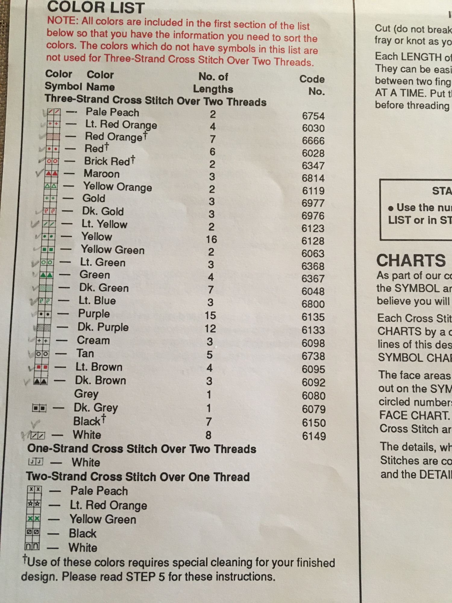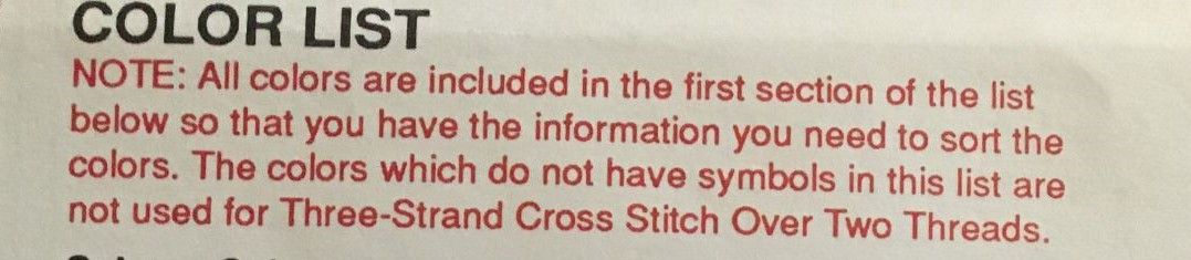 5 января 2020 1 минуту назад, viola33 сказал(а): Первый большой список вышивается в три нити через две нити канвы. Номера, около которых не указано кол-во пасм не вышиваются таким образом. Это написано в верхней части красного цвета. Эти цвета повторяются ниже: белый - в одну нитку через две нити основы а еще пять цветов в последнем разделе - полный крест в две нити через одну нить основы. Набор, видимо, на равномерке? Кстати, первый раз вижу крестики около названий увета, которые обозначают, что эти цвета линяют и требуется особая чистка. С этим я более-менее разобралась. Меня интересует чёрный треугольник и чёрный квадрат. Я так понимаю -это бленды. Но сколько ниток брать по 3 коричневого и 3 серого. Или 2 одного цвета и 1 другую Поделиться сообщением Ссылка на сообщение
