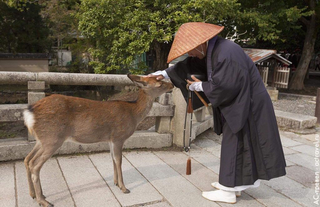 12 февраля 2021 Нару — волшебный город храмов и оленей. Древний город Нара когда-то был столицей Японии, а сегодня он включен в Список всемирного наследия ЮНЕСКО, и известен в первую очередь великолепным парком у подножья горы Вакакуса. Согласно легенде, после провозглашения Хэйдзё-кё (старое название Нары) столицей Японии бог святилища Касуга Тайся прибыл защищать этот город на белом олене. С тех пор олени — священные животные и хранители Нары, призванные защищать город и приглядывать за ним. Более тысячи лет убийство этого животного в пределах города каралось смертью, а в середине двадцатого века их признали национальным сокровищем. Сегодня их насчитывается уже более 1200, они свободно гуляют везде, где им заблагорассудится. Покормить оленей можно специальными оленьими печеньками sika senbei, которые продают на каждом углу. В парке даже висят предупредительные знаки: олени могут бодаться, кусаться и всячески приставать к людям, выпрашивая печенье. В парке расположен храм Тодай-дзи — самое большое деревянное сооружение в мире (57 м). Ему 12 веков, он горел в ходе войн между самурайскими кланами, разрушался во время гражданской войны и землетрясений, снова восстанавливался, но до сих пор является действующим, здесь проводятся службы, монахи проводят в храме ритуалы, прикоснуться к его древним реликвиям приезжают верующие со всего света. Храм является пристанищем Будды Вайрочаны — самого большого Будды в Японии, весом 500 тонн. Собственно, вокруг огромного Будды и был выстроен храм. На отливку статуи в своё время ушли все государственные запасы бронзы, а также 7 тонн воска и больше 100 килограммов золота. Будда сидит на постаменте в виде цветка лотоса с 56 лепестками, и вместе с ним высота статуи составляет 22 метра. Также символом Нары является буддийский храм Кофуку-дзи. Он был основан в 710 году как семейное святилище клана Фудзивара. После пожара в 1730 году был перестроен. Внутри находится сокровищница, её самый известный экспонат - статуя Ашура 8 века. Все желающие, как и в любом другом японском храме, могут написать свои делания на любом языке на деревянных табличках. Ещё одна достопримечательность - великое синтоистское святилище Касуга Тайся Храм с давних времён известен благодаря своему собранию фонарей – их здесь более трёх тысяч – каменные светильники обрамляют дорожки, а под кровлей святилищ на цепях подвешены многочисленные металлические лампы. Все они когда-то были пожертвованы храму паломниками. Вега, Kamis, Agusia и 13 других сказали спасибо Поделиться сообщением Ссылка на сообщение