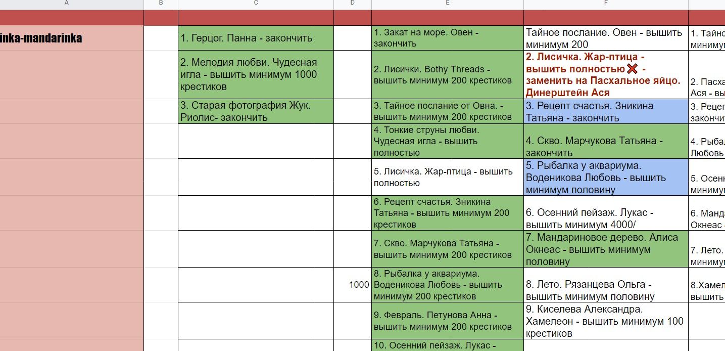 26 октября 2021 1 час назад, irinka-mandarinka сказал(а): У меня показывает, что не отмечен третий квартал и четвертый вообще не заполнен и здесь показывала уже за этот квартал готовые работы последний раз я обновляла таблицу 18-го октября, так что того. что появилось в теме позже, там и нет не знаю, почему у тебя не видна актуальная таблица, может стоить попробовать закрыть вкладку с таблицей и заново перейти по ссылке с первой страницы темы Anneti, korund и lamina-65 сказали спасибо Поделиться сообщением Ссылка на сообщение