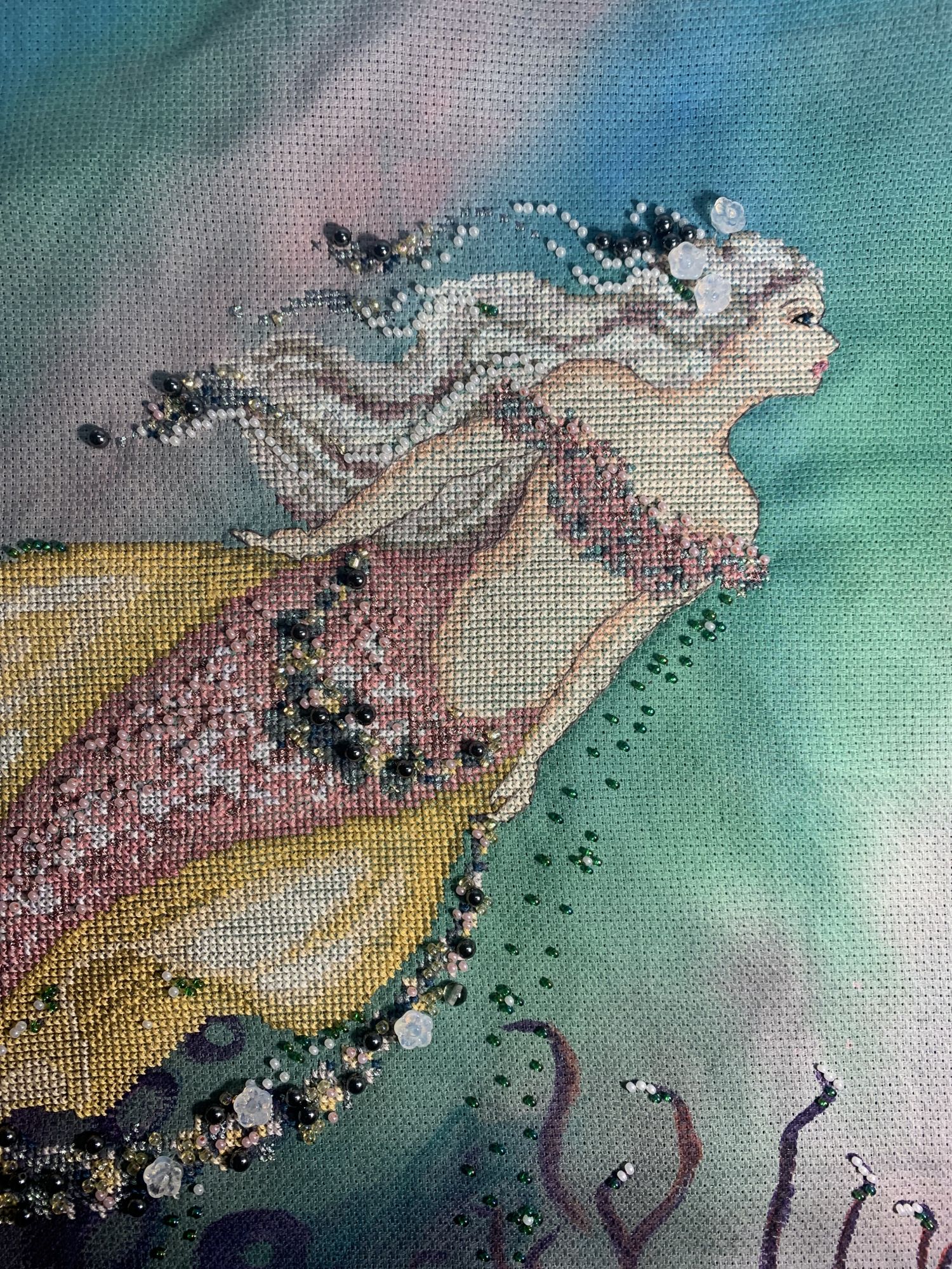 10 апреля 2022 7 часов назад, Jessabell сказал(а): И так я почти закончила. Осталось постирать и пришить бисер. Ох, как я повозилась с её головой! Вариант лица, который представлен в наборе мне совсем не понравился (напоминает крысу, если честно) и я решила воспользоваться журнальной схемой. Оказалось, что схема и набор отличаются не только лицом, но зачем проверять заранее Вобщем распускала я раза два, а потом плюнула и слепила голову из того что было. Самое главное - результатом я довольна. Также раз уж начала менять заодно выпрямила бэк по всему телу. Вроде вышло неплохо. Очень красиво! вы личико ей милее сделали) всегда за импровизацию) Я в последнее время увлеклась покраской канвы, накрасила рулон просто) от души так сказать) Вот смотрю на вашу принцессу и скучаю по простому фону) Кстати, видела эту девушку еще давным давно в журнале Вышиваю крестиком) А еще я запомнила ее, потому что любила разглядывать рубрику, где все свои работы присылали. И вот одна девушка вышила эту красотку на платье дочери. Я была в шоке, потому что мои феи от Джоан Эллиот шились по семь лет) у меня бы дочь уже замуж вышла) Вы, кстати, так же быстро ее вышили) это я что-то русалку быстро вышила, видимо схема маленькая. Остальное лежит и плохо двигается) sakineva сказал(а) спасибо Поделиться сообщением Ссылка на сообщение