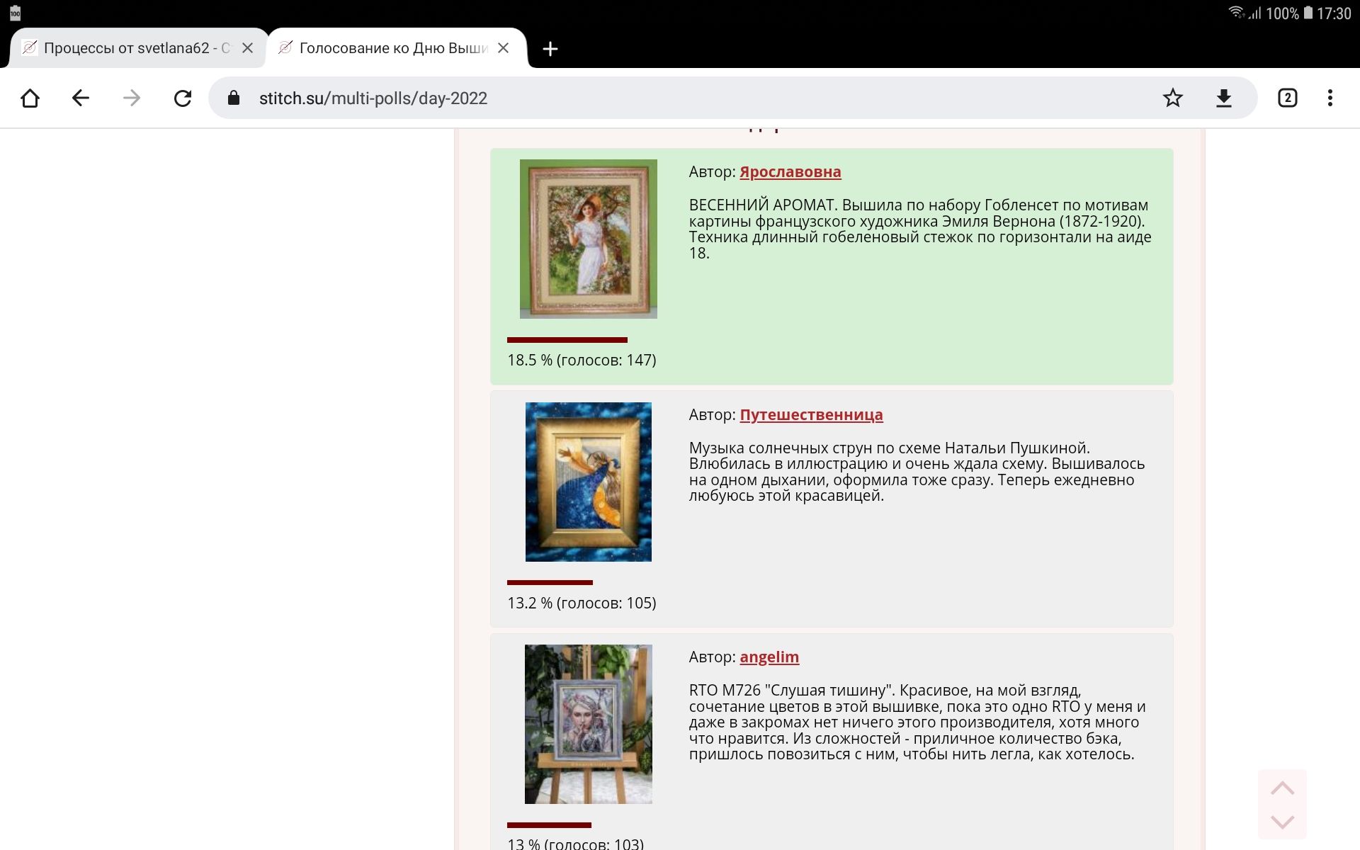 10 ноября 2022 Света, поздравляю тебя с нашим общим праздником! Спасибо тебе за такие теплые слова о моей работе "Лучший друг человека" Я очень болела за твою подушечку и мешочки. В подушечку новогоднюю я влюблена давно по уши, но в этой номинации было так тесно... И мешочки хотела видеть рядом с наташиными фартукам, и они порадовали вначале, но потом ушли из лидеров и не вернулись. А так хороши! Жаль, что конкурс закончился, уже и не поболеешь. а это замечательные эмоции. И хорошо, что конкурс у нас живет со всеми плюсами и минусами. Еще раз с праздником! Новых замечательных работ! И жду твою девочку в платке... Fascinata, Lorans, mag и 3 других сказали спасибо Поделиться сообщением Ссылка на сообщение