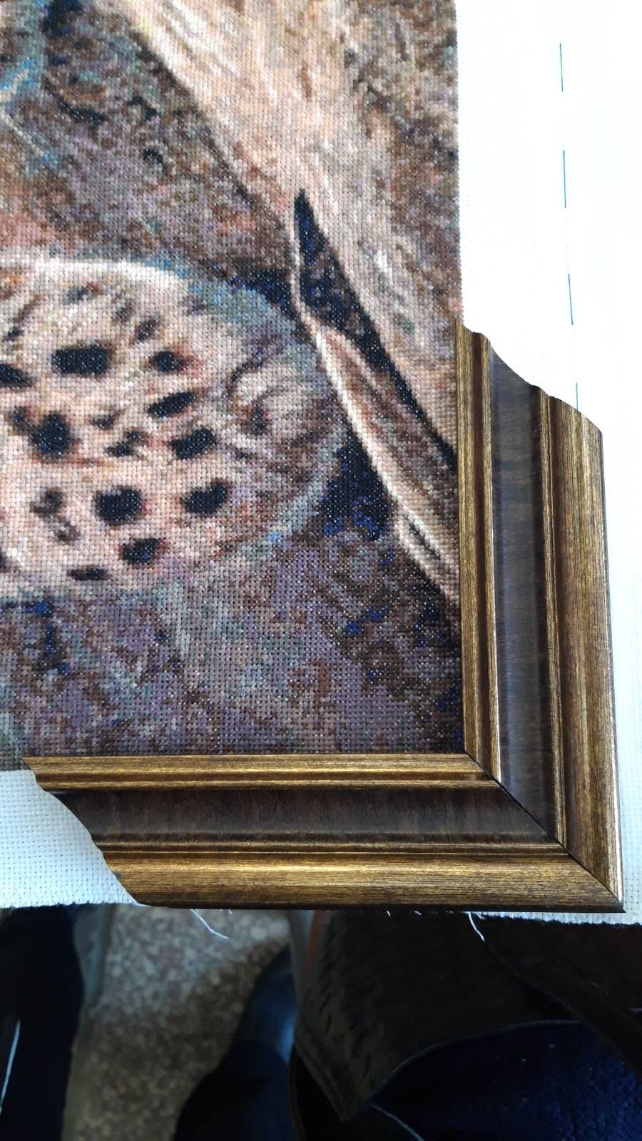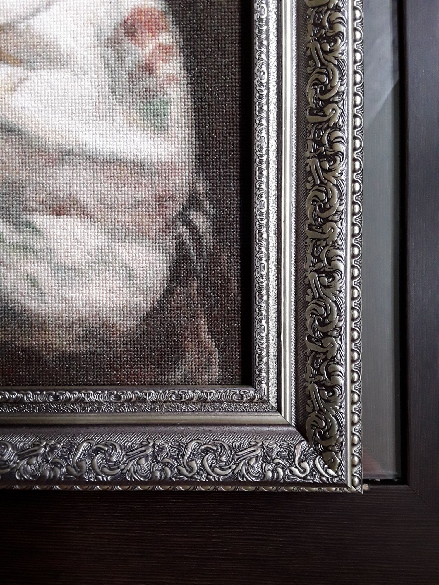23 октября 2023 Всем здравствуйте..... Вчера привезла из багетки оформленную Девочку. Пол дня ходила около нее и не могла понят,нравится или не очень. Подруге очень понравилось . А я в сомнении.... Выбирала между двумя багетами, но,как оказалось, одного нет в наличии. Поэтому пришлось заказать этот... ....как ни пыталась передать на фото цвет багета, не получилось....В общем цвет ,,старое золото,, (такое название цвета гардин у нас в кухне и столовой). Повесила,как и планировала,в столовой. У Лапочки сразу хотела поменять багет, (как мне кажется,не тот поставили,другой выбирала) но до сих пор руки не дошли. Вот теперь придется подбирать ближе по цвету к багету Девочки. Точно такой не подойдет однозначно,можно поискать что то среднее. АлёNка, Lorans, Tatiana2406 и 10 других сказали спасибо Поделиться сообщением Ссылка на сообщение