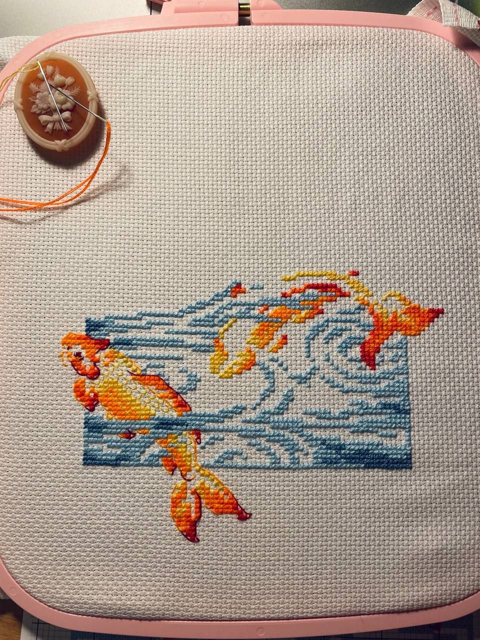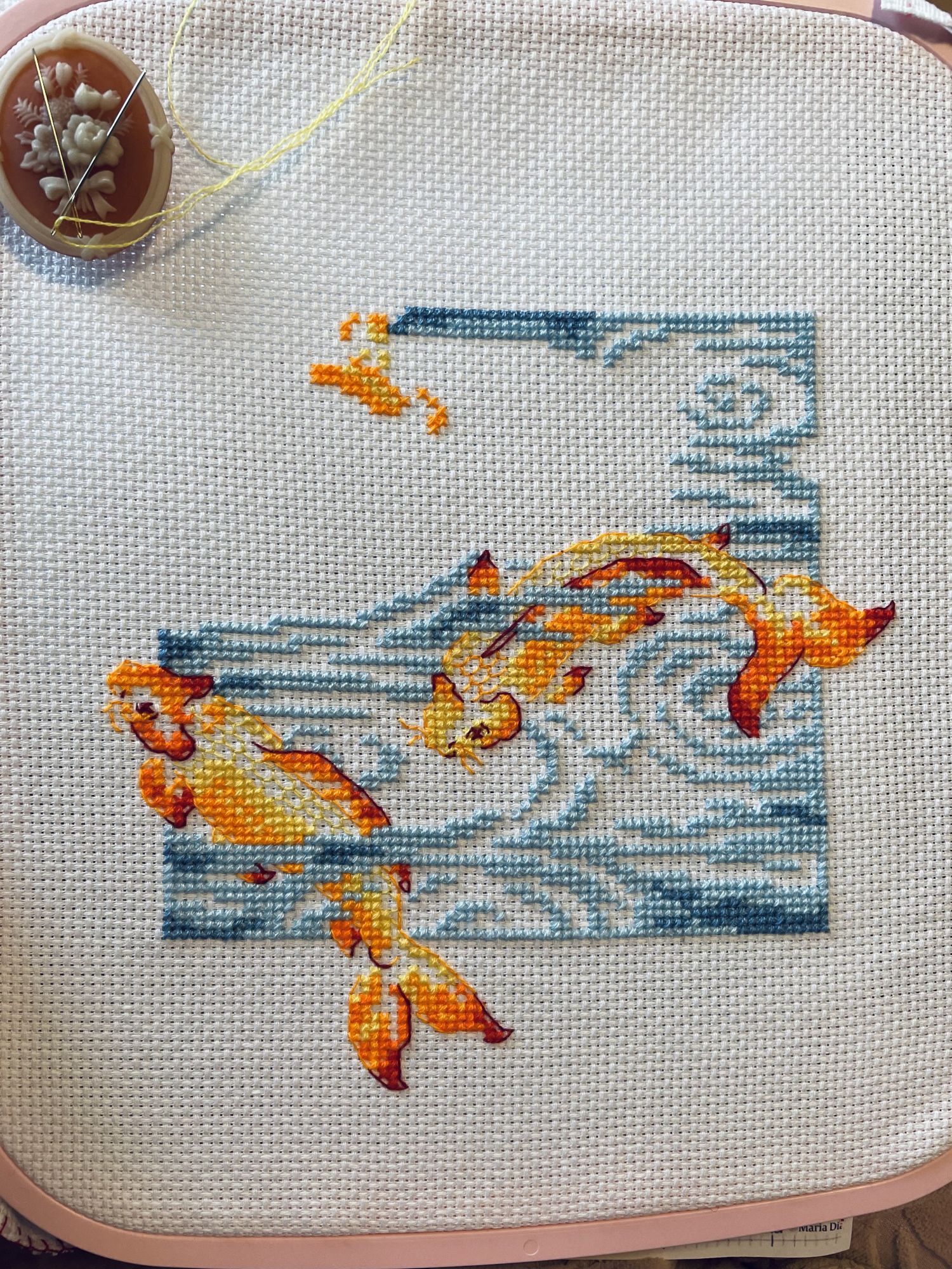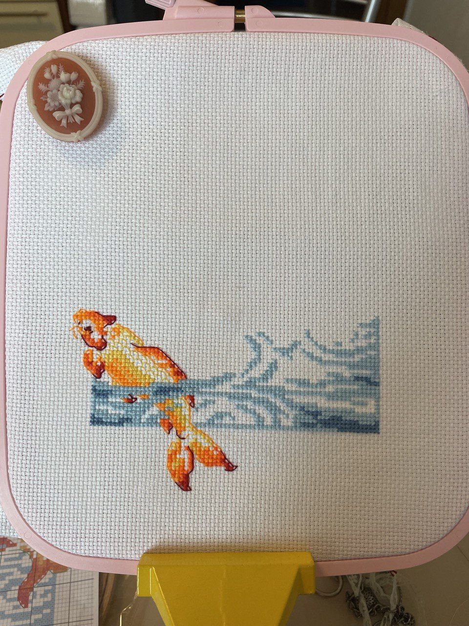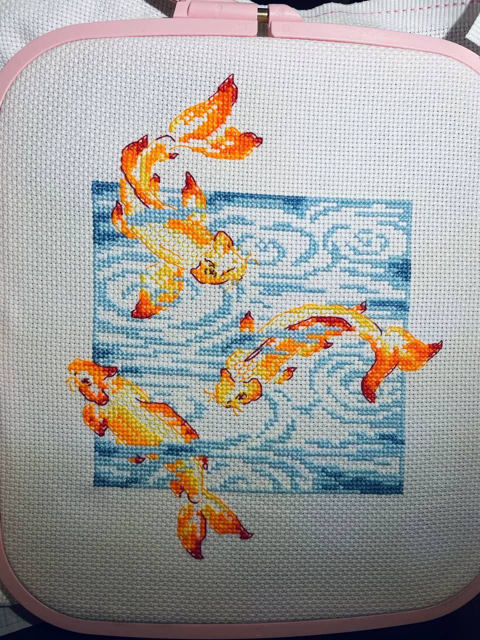 25 октября 2023 Продолжаю сюжет с карпами из журнала Cross Stitcher №367 за 2021й год, разработка Марии Диаз, появилась вторая рыбка: С первым карпом я слегка поторопилась и сразу сделала бэк, а там были ещё смежные крестики голубым для воды, пришлось немного поизголяться и протягивать нитку для крестика под готовым бэком. Хорошо, что совсем немного =) Со второй рыбой - вышью воду вокруг и потом уже бэк. Желание поскорее-поскорее меня подвело, теперь буду аккуратнее. Хозяйка смешных зверей, Betta, Забава_ и 11 других сказали спасибо Поделиться сообщением Ссылка на сообщение