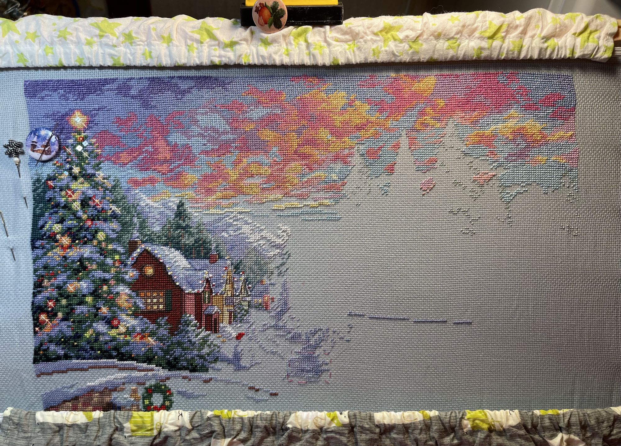 14 февраля 2022 Мои продвижения за 2 недели 1 Рождественская деревушка Дим У меня этот процесс опять на раме, ниже расскажу почему 2 Птички от Дим деревушка дошла до 50% отлива, а птички до 80 дальше фото не для гайки История о том, как я начинала и наслушалась о канве от Дим и постирала ее. перед Новым годом из-за нехватки времени и огромном желании вышивать, я сняла рождественскую деревушку с рамы и поместила в пяльцы. Мягко говоря запяливать было неудобно. Потом я нечаянно прочла, а затем и услышала, что некоторые канву из наборов Дименшнс стирают (не стирайте ее, прошу). Я простирала, просушила, запалила в пяльцы - на самом деле легче запяливать ее в пяльцы не стало… но я с этим справилась и зацепила края канвы биндерами. И вот, отшив кусок неба, надо было передвигаться по канве, я ее сняла с пялец для передвижения и увидела дыру, которую про если биндеры в канве я была зла, в первую очередь на себя, потому что жёсткость канве с вышивкой уже поздно придавать, а канва испорчена. в итоге я более-менее справилась с задачей восстановления канвы и зашила дыру (на фото пальцем держу место, где была дыра) По итогу нормально натянуть канву на раму после стирки не удаётся, приходится каждый день перенатягивать ее, но я решила для себя пусть хотя бы так. канва без жесткости - это тряпка неудобная. Теперь я в раздумьях как бы сделать или заказать раму с барабанной натяжкой. но урок усвоила - канву больше стирать не буду Kattrielle, Хозяйка смешных зверей, IrnKA и 2 других сказали спасибо Поделиться сообщением Ссылка на сообщение