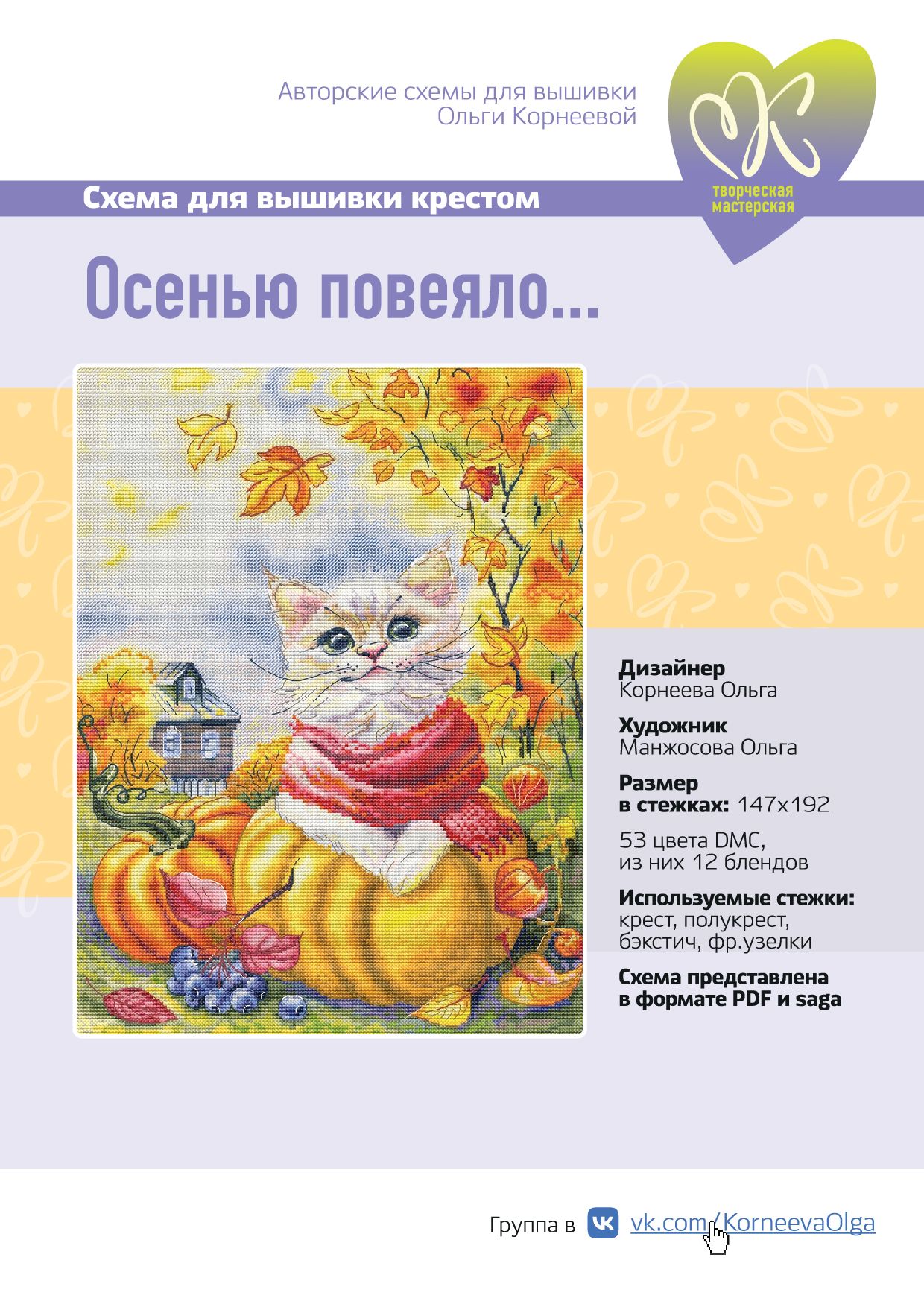 18 ноября 2024 НОВИНКА Осенью повеяло... Листочки танцуют, листочки кружатся И ярким ковром мне под ноги ложатся. Как будто ужасно они занятые, Зелёные, красные и золотые… Листья кленовые, листья дубовые, Пурпурные, алые, даже бордовые… Милейшее чудо наслаждается яркими красками осени по иллюстрации Olga Manzhosova Схема "Осенью повеяло..." готова! Оленька, спасибо за нереальной милоты иллюстрацию Размер в стежках 147х192, 53 цвета DMC, из них 12 блендов. Используемые стежки: крест, полукрест, бэкстич, фр.узелки. Схема представлена в формате PDF и saga Схему можно приобрести за 600 рублей, написав сообщение в группу! lamina-65, kng230858, Чивава и 1 другой сказали спасибо Поделиться сообщением Ссылка на сообщение