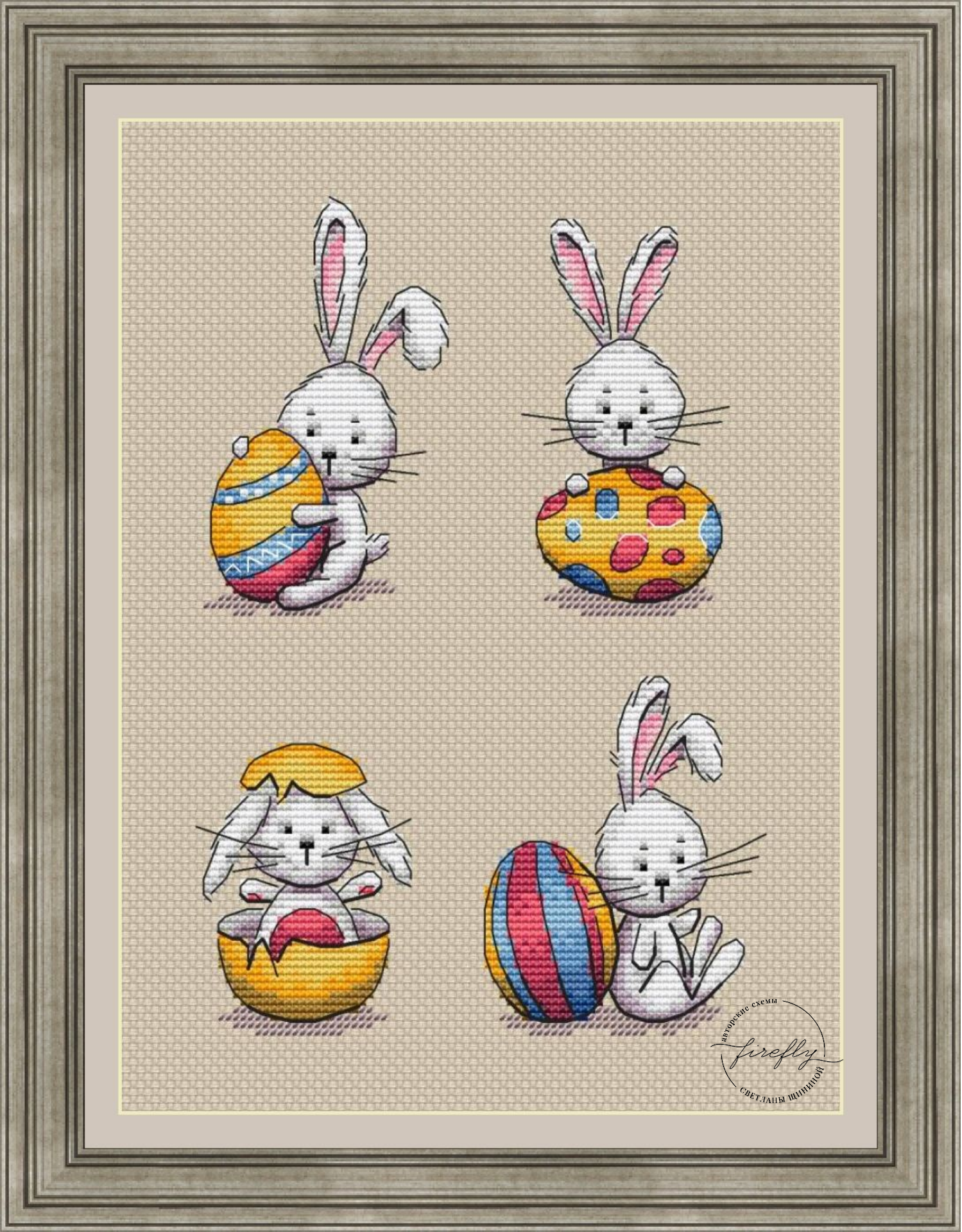 23 апреля (изменено) Пасха прошла, но настроение еще праздничное. Схема "Пасхальные зайчики" - размер в крестиках: 74 х 112 (все 4 сюжета, по отдельности не более 56 крестиков по большей стороне) ~ размер в см для 14 ct - 14 х 20,3, для 16 сt - 12,2 х 17,8 (все 4 сюжета) ~ палитра: DMC, 19 чистых оттенков + 2 бленда ~ используемые стежки: крест, полукрест, счетный бэкстич ~ количество стежков по .saga - 3900 (марафон) ~ формат: .pdf и .saga. Буду рада вам у себя в группе https://vk.com/firefly_stitch Изменено 23 апреля пользователем Светлана Щинина cozy_stitch, Yulia1409, kng230858 и 4 других сказали спасибо Поделиться сообщением Ссылка на сообщение