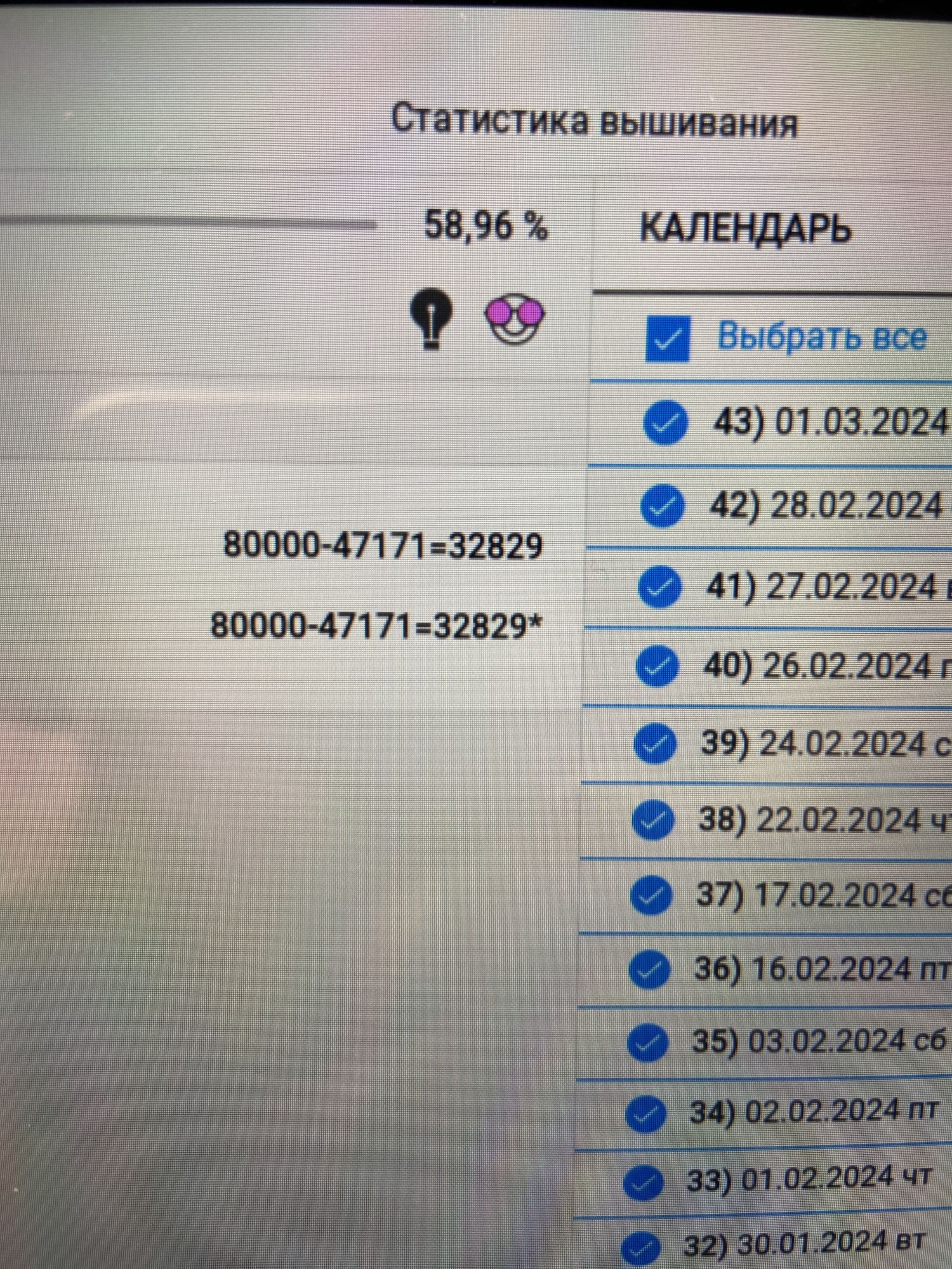 18 марта 2024 15.03.2024 в 00:48, Sky026 сказал(а): Девочки, всем привет. Я буду заканчивать с Вами работу Марья Искусница темное и светлое. Вот что должно получиться: Добро пожаловать! 16.03.2024 в 22:00, Sky026 сказал(а): Девочки, простите за поздний отчет Было стало +226 крестиков За поздний отчёт минус 1 балл.... Поскольку это Ваш первый отчёт - предупреждение, негоже начинать сразу с опоздунов... Дальше буду снимать баллы. Ксен40, Надежда Минск и Sky026 сказали спасибо Поделиться сообщением Ссылка на сообщение