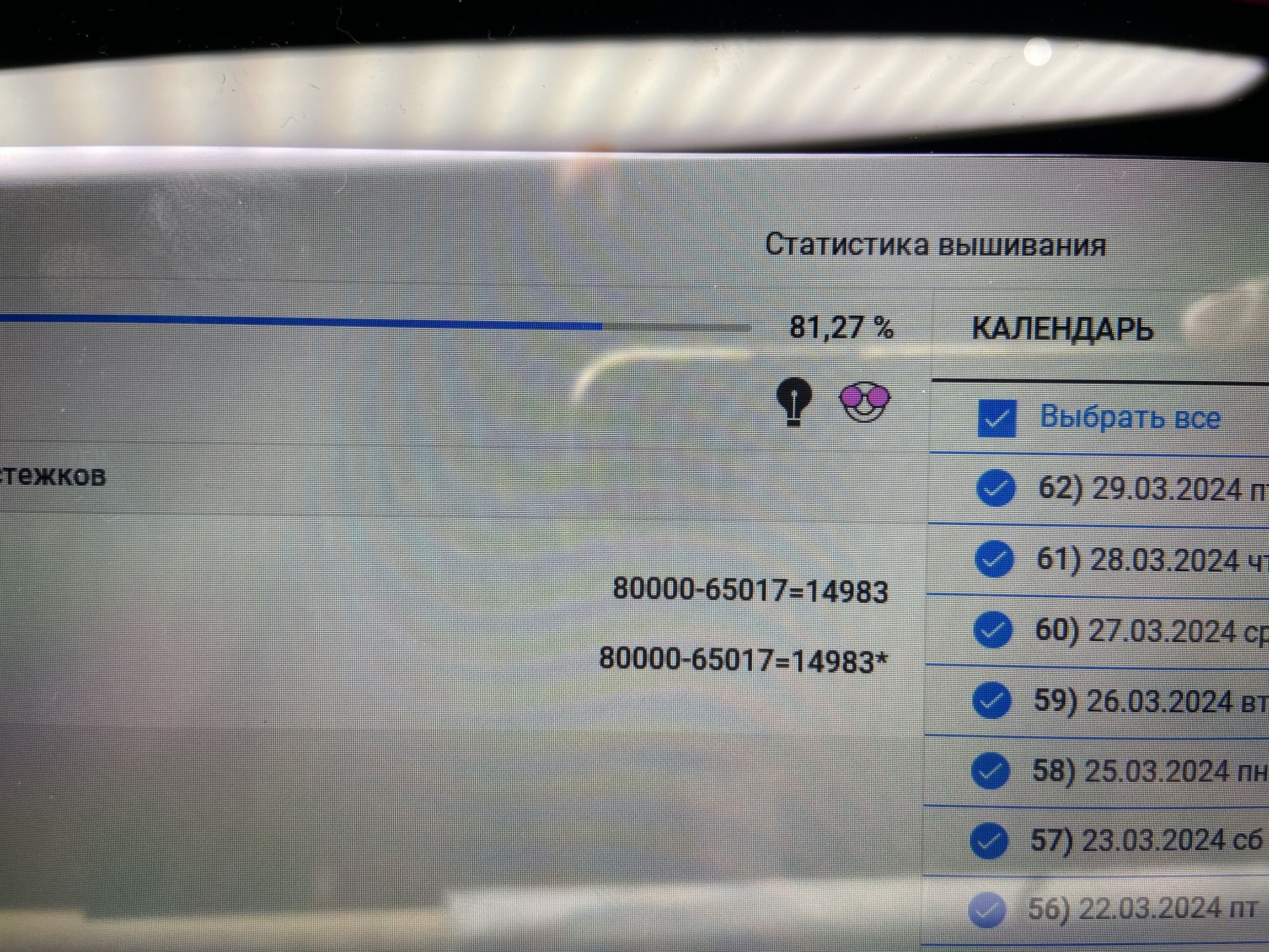 29 марта 2024 Добрый вечер. Отчет на 29.03. +1874 крестика, 264 полукрестика и 140 швоа бека. Итого +2076 крестиков. Развернула чтобы показать что уже вышито на данный момент. 3/4 работы готово. sheyla55, Leutnant Ripley, Anna88888888 и 10 других сказали спасибо Поделиться сообщением Ссылка на сообщение