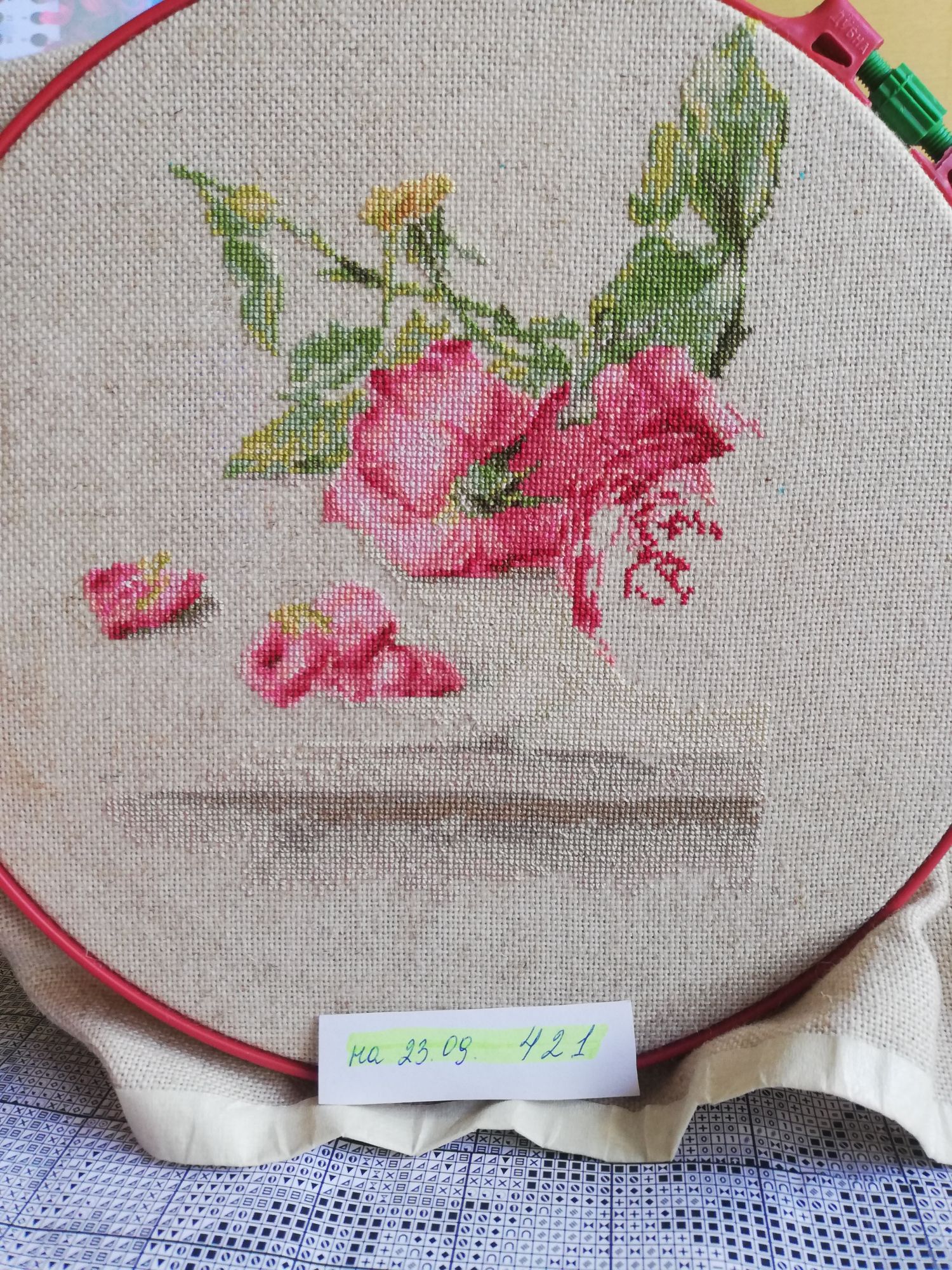 22 сентября 2022 Девочки, доброе утро, моя прибавка +421х Было стало Немного подросла большая роза и появился самый левый лепесток с тенью. Склеила всю схему, отрезала вышитый участок и ахнула, это же ещё мне шишь и шить. Но результат радует, да и процесс увлекает, когда не фон шью. Хочу провести эксперимент, взять и вышивать только этот процесс одну неделю, да, как получится, не каждый день возможно, просто посмотреть сколько я нашью. И тем самым продвину эту работу. Хороших выходных всем! Sneganna, arunrie, Любопытка и 13 других сказали спасибо Поделиться сообщением Ссылка на сообщение