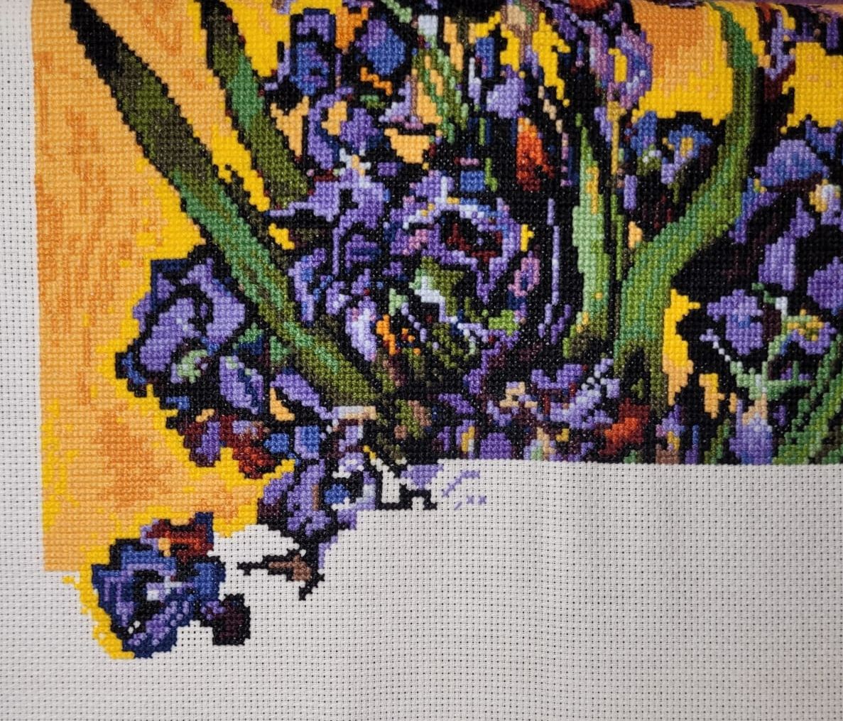 25 марта 2022 Задание месяца. Вариант 1. Вышивка в тему Если у вас есть процесс, по картине известного художника, то продвиньте его на 600 крестиков. Ирисы Ван Гог. . На этом полотне Ван Гог стремился добиться мощного цветового контраста. Поместив цветы на жёлтый фон, он заставил их декоративные витиеватые формы выделяться еще сильнее. Изначально ирисы были фиолетовыми. Но со временем красный пигмент исчез, и сейчас мы видим их сине-голубыми. ⠀ Ван Гог очень тщательно и детально работал над каждым цветком. В точной и изящной прорисовке ирисов заметно влияние японской живописи. Для достижения желаемого эффекта художник использует четкий чёрный контур и мягкие волнообразные мазки, образующие причудливый цветочный орнамент. По контрасту он максимально упрощает рисунок прямых и острых листьев, просто залив их темно-зелёным цветом. ⠀ В дошедшем до нас виде букет приобрёл очень красивый и даже нежный колорит. Сейчас мы можем только представлять себе ошеломительное и даже дикое в своей яркости противопоставление наложенных импасто фиолетовой, желтой и зеленой красок, каким его задумал Ван Гог. И мое творчество: Leutnant Ripley, Darishka, korund и 9 других сказали спасибо Поделиться сообщением Ссылка на сообщение