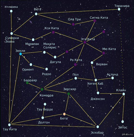 31 августа 2022 02.08.2022 в 07:38, tessykat сказал(а): Книжные задания 1. Тема месяца Поделитесь впечатлениями о прочитанной вами художественной книге, в который звездам отводится не последняя роль в сюжете, или о научно-популярной книге о них. К сожалению, такой замечательной научно-популярной литературы, как у Ольги, у меня в детстве не было. Но фантастику читаю давно и много, поэтому вспомню несколько сюжетов из нее. Начну с "Саги о Форкосиганах» (англ. Vorkosigan Saga) — цикла романов и повестей в жанре научной фантастики, созданного американской писательницей Лоис Буджолд и большей частью описывающий приключения Майлза Форкосигана, молодого аристократа с милитаризованной планеты Барраяр. Произведения цикла получили широкое признание и автору были присуждены несколько премий «Хьюго» и «Небьюла". Цикл относится к научной фантастике, и значительную роль в сюжете играет политическая карта Вселенной, поэтому звездные системы и их связи описаны подробно, а в тех книнах, где это имеет первостепенное значение, приведена даже схема. В качестве постоянных политических противников родной планеты главного героя выступают жители Цетагандийской империи, состоящей из 9 планет, звезды которых входят в созвездие Cetus (лат.) - Кит: На схеме фиолетовым обозначены звезды Цетагандийской империи, зеленым - Барраярской империи - родины главного героя. Схема отражает авторскую Вселенную, поэтому не надо искать в ней сходство с картой звездного неба Еще хочу упомянуть произведение ранней фантастики "Корабль, который пел" (1969) — научно-фантастический роман Энн Маккефри. Состоит из пяти рассказов, изданных с 1961 по 1969. Один из них - "Корабль, который скорбел" - повествует о трагической эвакуации жителей планеты, звезда которой превратилась в сверхновую, т.е. взорвалась, уничтожая все свои планеты. Leutnant Ripley, MiraMargarita, soln33 и 9 других сказали спасибо Поделиться сообщением Ссылка на сообщение