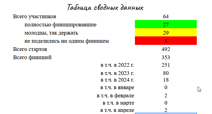24 июня Новый выпуск нашей ежемесячной статистики --- майские результаты! Несмотря на активный огородно-дачный майский сезон, этот месяц оказался не пуст на завершения --- плюс один финиш и плюс одна появившаяся в статистике участница, вот как) Так классно, что находятся с финишами новые участницы, второй месяц подряд))) И это всё составляет 71,95% от наших стартов) Пусть такая пусть неторопливая, но уверенная поступь к закрашиванию таблички сохранится и дальше))) Ксен40, 19199707770, Alichka и 8 других сказали спасибо Поделиться сообщением Ссылка на сообщение