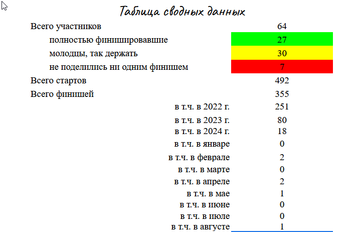 9 сентября Несу, несу вам августовскую статистику! Вот, наконец, есть что показать табличкой --- за август у нас добавился ещё 1 финиш. И это 72,15% готовности от наших начинаний))) Пусть на оставшиеся тут проекты найдётся вдохновение))) Приносите красоту! sakineva, lovingberry, lamina-65 и 6 других сказали спасибо Поделиться сообщением Ссылка на сообщение
