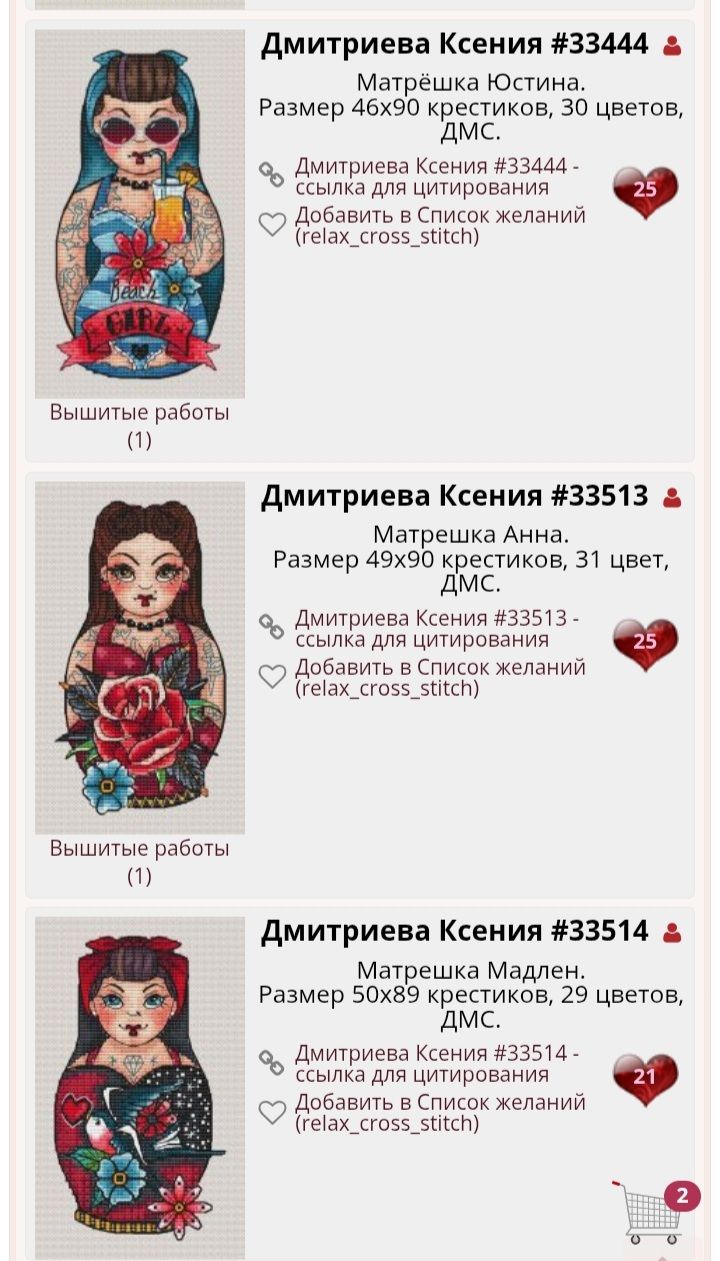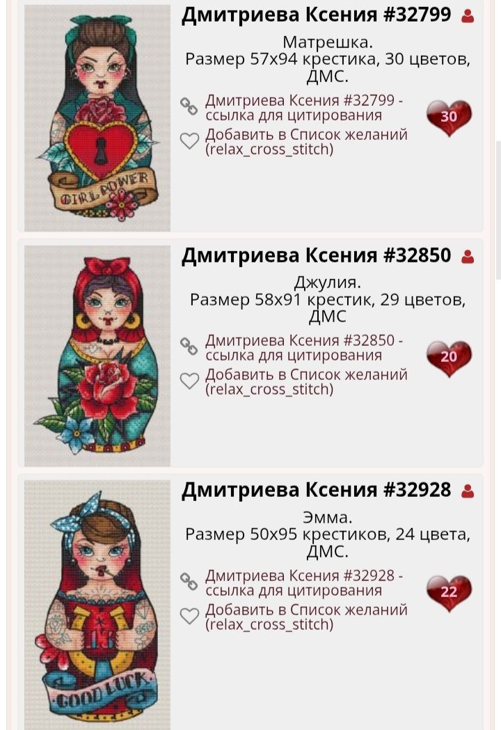 26 мая 16 минут назад, relax_cross_stitch сказал(а): Но что поделать люблю я их) Даже мой сын их обожает) Достаёт, перебирает, интересуется когда вышью следующих)) Помогал пришивать пару бисеринок. Так это ж круто! Я б с удовольствием тоже поперебирала твои богатства 17 минут назад, relax_cross_stitch сказал(а): У меня из матрёшек ещё есть такие. О, Ксении Дмитриевой татушные интересные - именно своей нестандартностью. Сча мысля промелькнула - на одежду такую одну вышить и щеголять)) vasilisa-1977, relax_cross_stitch и Auria сказали спасибо Поделиться сообщением Ссылка на сообщение
