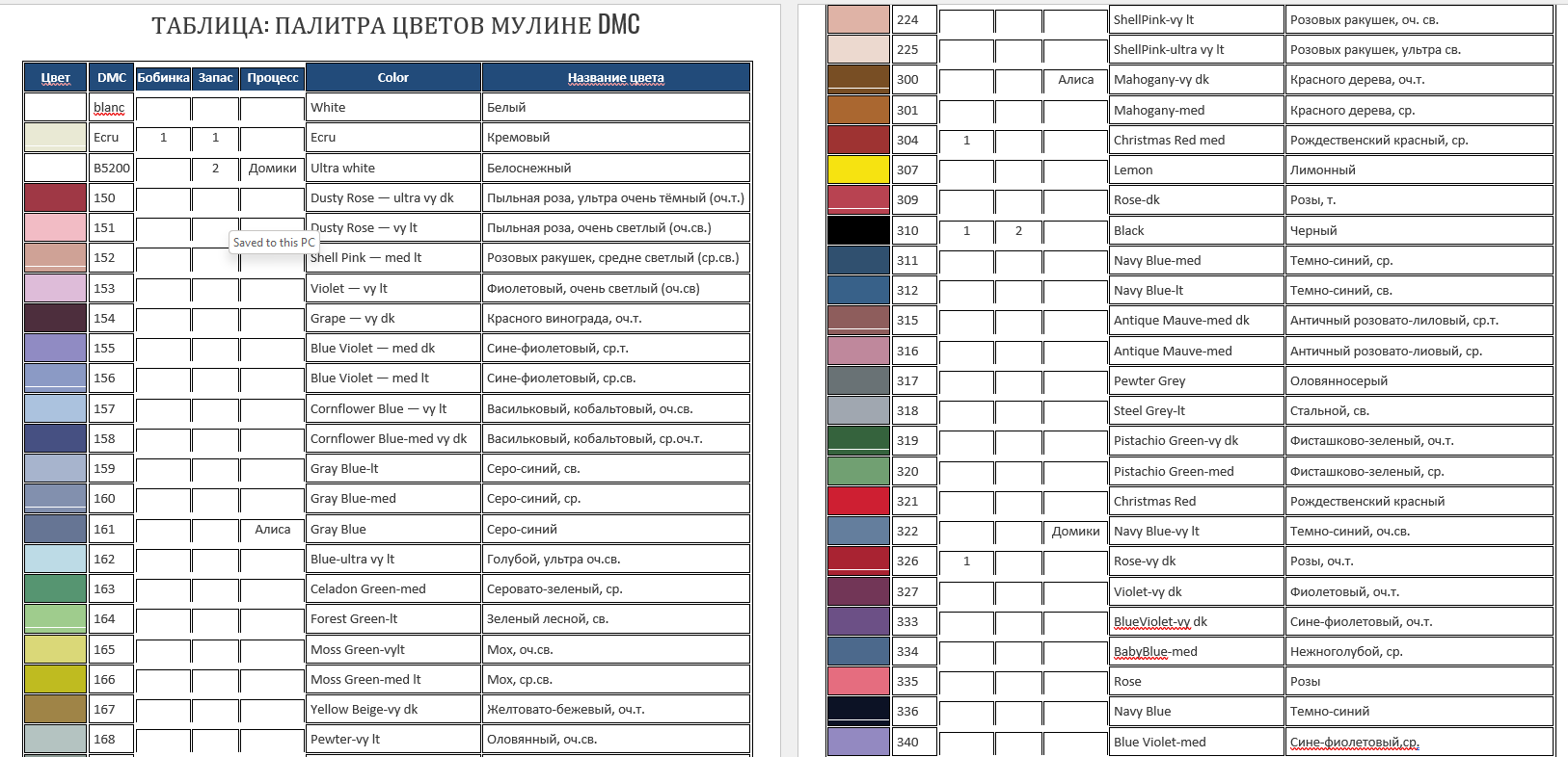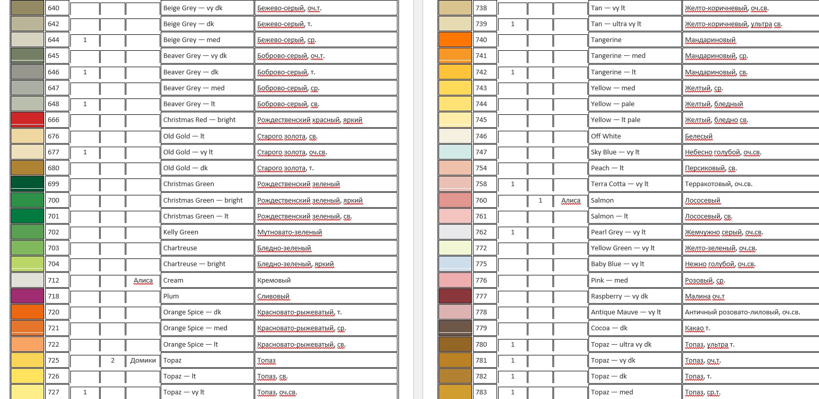 24 июля 2023 18.07.2023 в 00:16, Olga@Olga сказал(а): Сделела таблицу, чтобы знать сколько у меня ниток и каких. (Не буду скриншотить все 15 листов, поверьте на слово, сделала только 2 скриншота. Ольга, вы сами такую замечательную таблицу делали или где-то в свободном доступе можно её скачать? error425, Killwale, Catopuma и 6 других сказали спасибо Поделиться сообщением Ссылка на сообщение