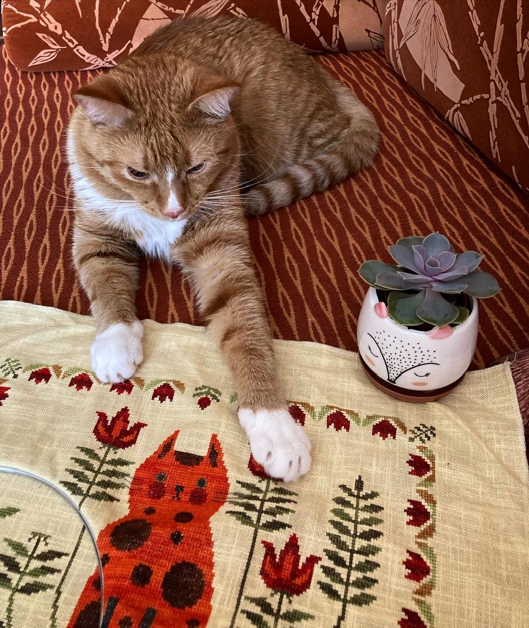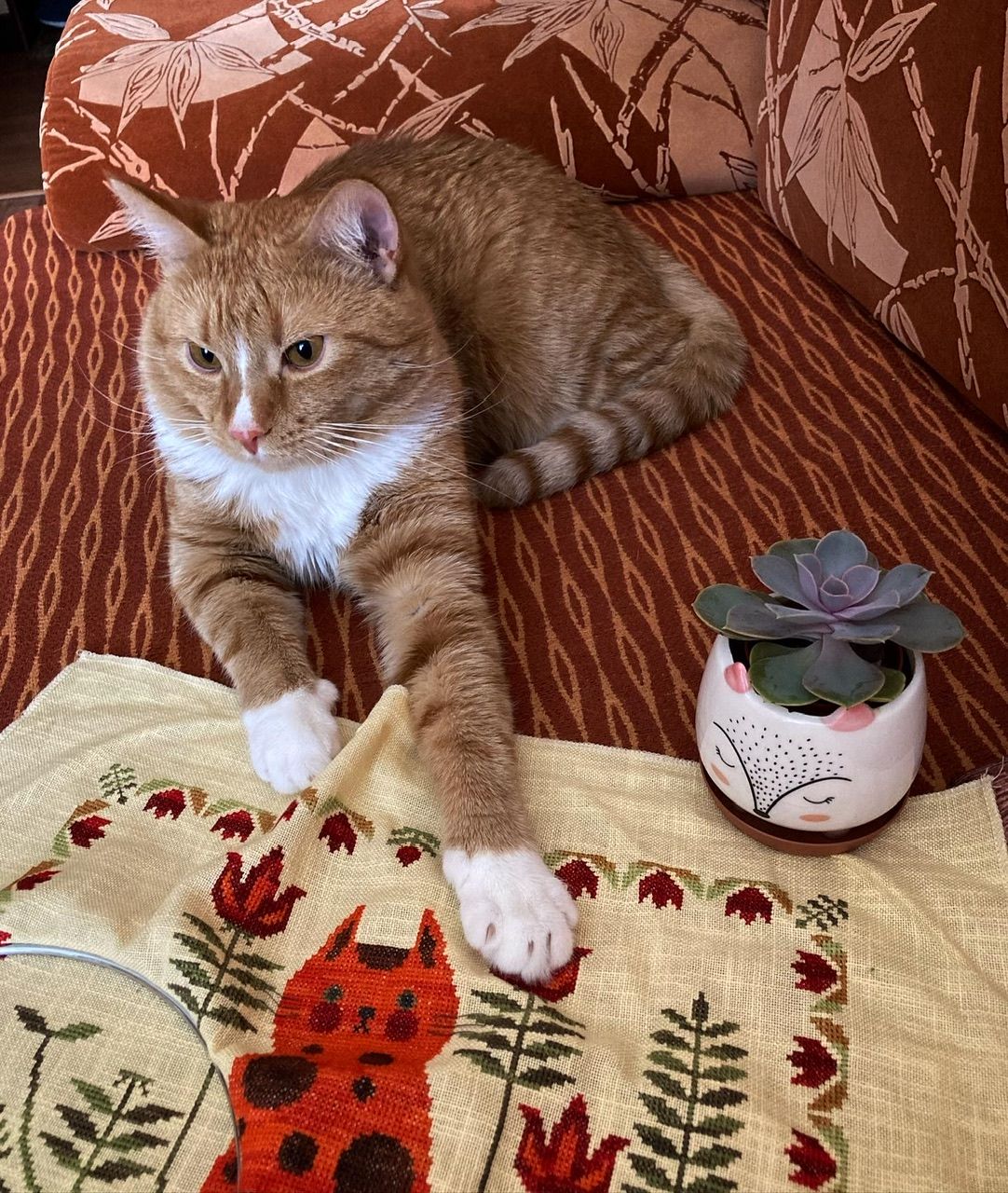14 августа 2023 Всем привет! 1. Вышить 150 крестиков самым веселым цветом + Исследование Красный, по-моему, довольно весёлый) +385 (даже больше, но точно не посчитала) красным цветом на этом сюжете. Всего на работе +1842 за эту неделю. 2. Вышить 250 крестиков на Праздничном сюжете. Сезон и праздник - любые +316 на ёлочной игрушке. 3. Фотоотчет. Атмосферное фото одного из текущих процессов. Например, если вышиваете чашку с кофе, окружить ее соответствующими аксессуарами, - варенье, печенье и т.п. "Кот и цветоводство" в компании с главным цветоводом в нашем доме (и цветочек в довесок) 4. Выровнять край фрагмента вышивки. Всего на этом процессе вышить 150 крестиков Правый край выровняла и в целом дошила выделенный фрагмент на этой работе. +1408 в пересчёте с гобелена на крест. На первом фото, конечно, страх, а не девочка, а на втором уже вполне себе) t_elen, alen_73, semsot и 18 других сказали спасибо Поделиться сообщением Ссылка на сообщение