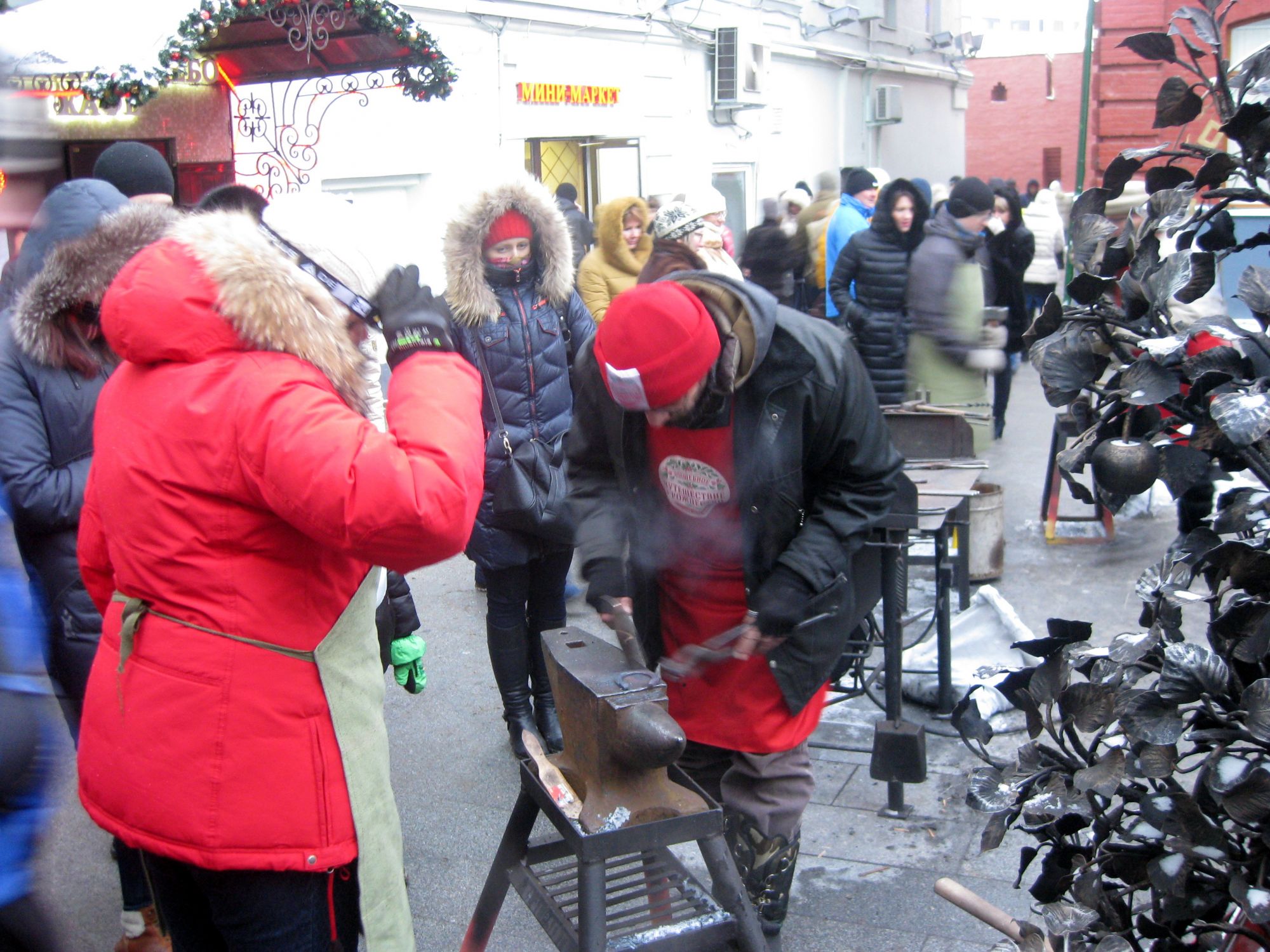 6 января 2016 Приветствую всех в эту морозную среду - первую в наступившем 2016-м году. Все-таки это сродни чуду: вся эта декабрьская слякоть, лужи на асфальте, теплый ветер - и вдруг самая настоящая зима! Это ведь погода, как бы мы могли ею управлять? Но каким-то неведомым образом она словно услышала наши отчаянные мольбы даровать нам в тяжелые последние дни уходящего года хотя бы немного снега, немного привычной зимы, чтобы в глубине души мы знали, что раз зима, раз Новый год - значит, все хорошо и очень правильно... Подвести итог минувшего года я могла бы словами Джозефины Марч: "Размышляя о прошедшем годе, я пришла к ощущению, что кое-чего добилась, несмотря на мои многочисленные неудачи, так как теперь я всегда бодра, работаю с охотой и больше, чем прежде, интересуюсь другими людьми - и все это приносит мне удовлетворение". (Луиза Мэй Олкотт, "Хорошие жены") Праздник пришел в наш дом рука об руку с весельем, предвкушением чудес и настоящим снегопадом подарков=) С особым удовольствием мы занимались праздничным декором, и наша маленькая, но очень пушистая елочка нарядилась в чудесные игрушки. Мы отдали предпочтение игрушкам с историей - и сколько историй было рассказано и выслушано!.. ведь на нашей елочке игрушки не только из нашего детства, но и из детства наших родителей Новое приобретение у нас только одно - удивительный пряничный домик с фабрики "Ариэль". Эта пряничная серия очаровала меня еще в том году, но тогда я мужественно ограничилась барыней-лисицей. Эти пряничные игрушки так искусно сделаны, что у многих возникают сомнения - а из стекла ли они? Мне же все время хочется попробовать домик на зуб В виду скромных размеров нашей новогодней красавицы Дед Мороз и Снегурочка тоже маленькие - в неистощимых запасах старых игрушек нашлись те, что сделаны из плотного, отличного качества пенопласта; рыбку, попугайчика и Чиполлино я повесила на кухне, а главных героев зимних праздников разместила под елкой - очень удачно они туда вписались. Вы помните невероятно харизматичного черного кота, который охраняет тыкву? Эту чудную игольницу сотворила для меня Аня со своими фетромузами в рамках Тыквенного Сюра. Конечно, у меня так и не поднялась рука использовать игольницу по назначению; больше того - я задобрила кота праздничным убранством (а то Фиби иногда по ночам сбрасывает его на пол и я очень страшусь его мести): Мама, моя верная последовательница на пути открыткомании, подарила мне совершенно невероятную открытку, привезенную ею из Будапешта. Открытка сделана из бумаги ручной работы и от нее иногда отслаиваются маленькие кусочки, словно хлопья снега. Конечно, Москва в эти дни превратилась в волшебное царство. Мы долго набирались смелости отправиться на прогулку в нынешние суровые морозы - и все же на днях сделали это. Правда, даже теплые шубы, шапки и варежки спасли нас от холода всего на полтора часа Наша экспресс-прогулка началась на Лубянке - и там же и закончилась. Путешествие в Рождество на Никольской. Вид зимнего неба, тающего в нежной розоватой дымке, удивительным образом сочетался с пока еще призрачными светящимися арками: В проулочке между Никольской и выходом к площади Революции всегда можно отыскать кузнецов - прямо на наших глазах они создают из тяжеловесного металла восхитительные в своем изяществе вещи. Кстати, я нашла у них кованые н